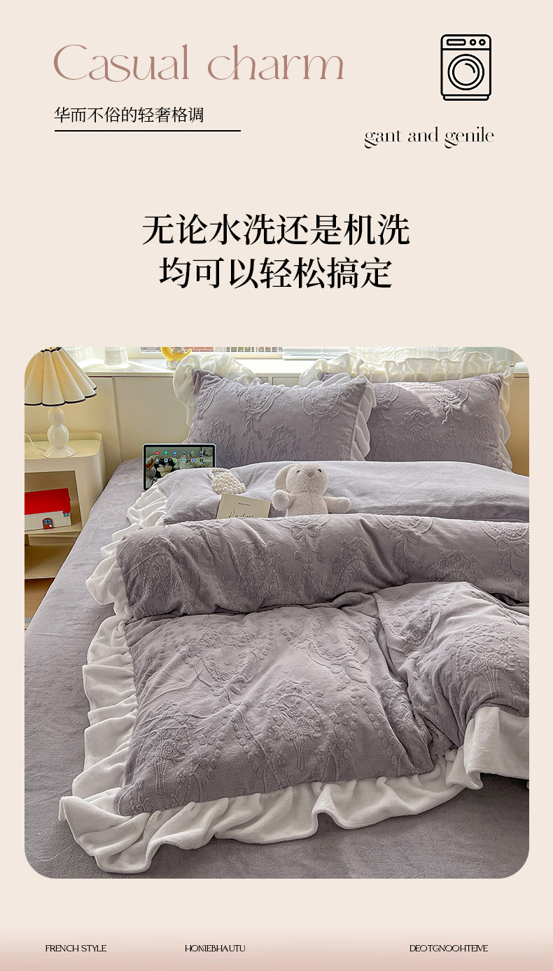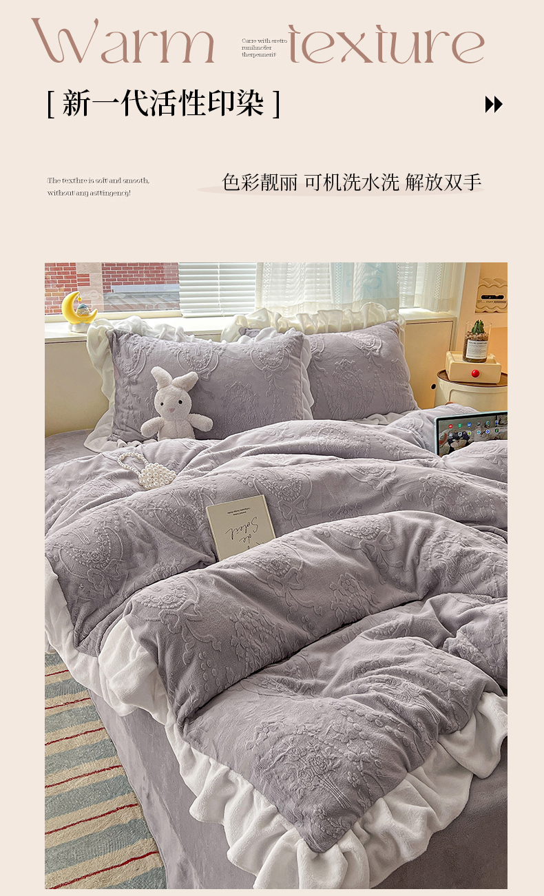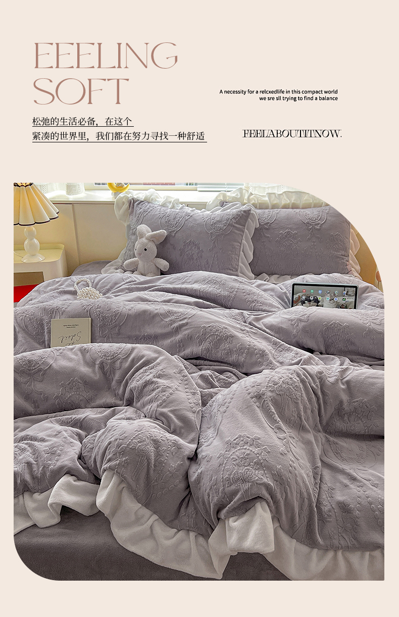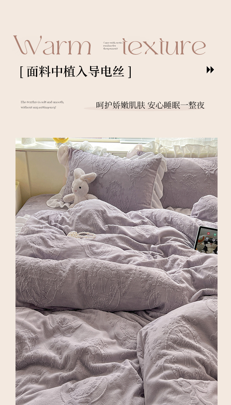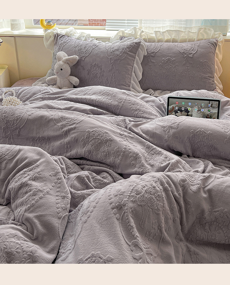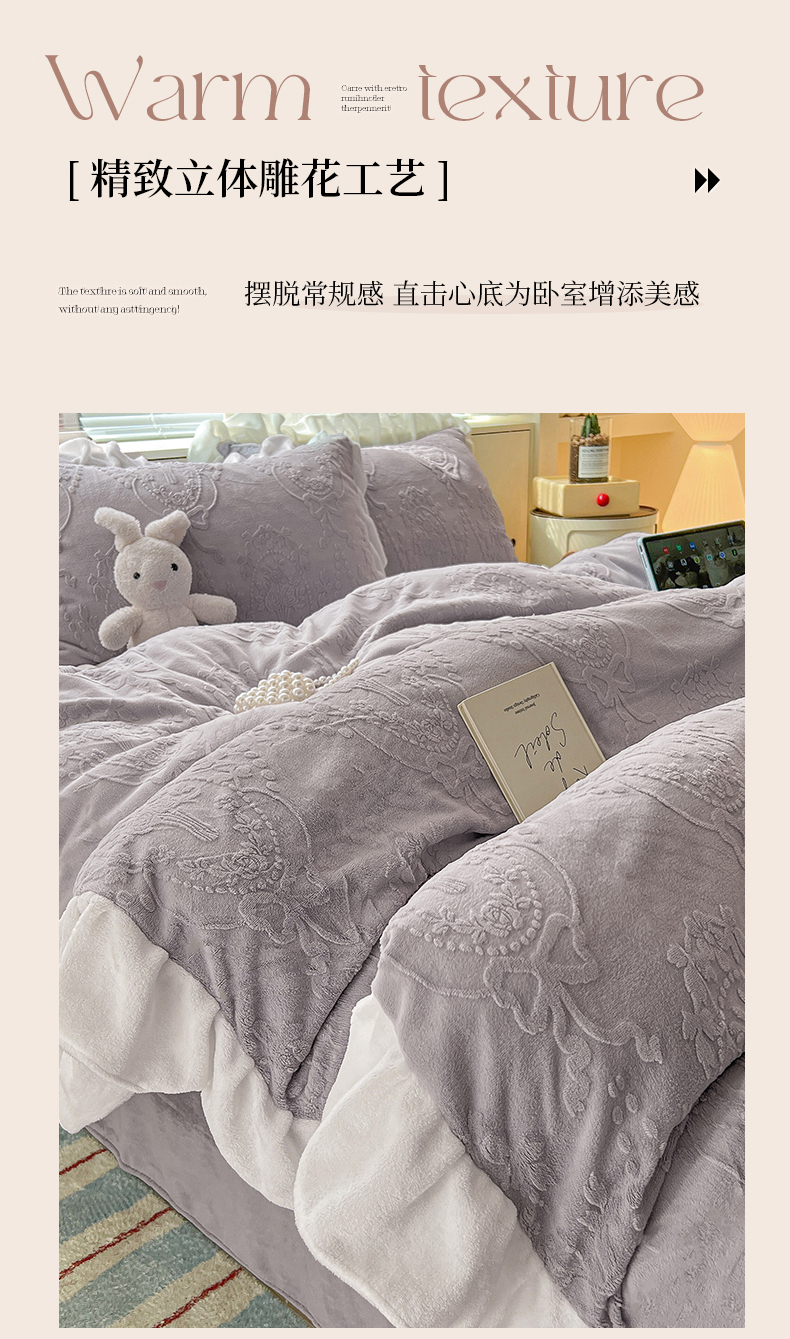 当前位置: 91家纺网 > 商品网购 > 床品套件 > 四件套 > 牛奶绒四件套 > 亿梵家居 2025新款法式花边款A类5D牛奶绒立体雕花四件套(提供买家秀) 花边款 手捧花-香芋紫
