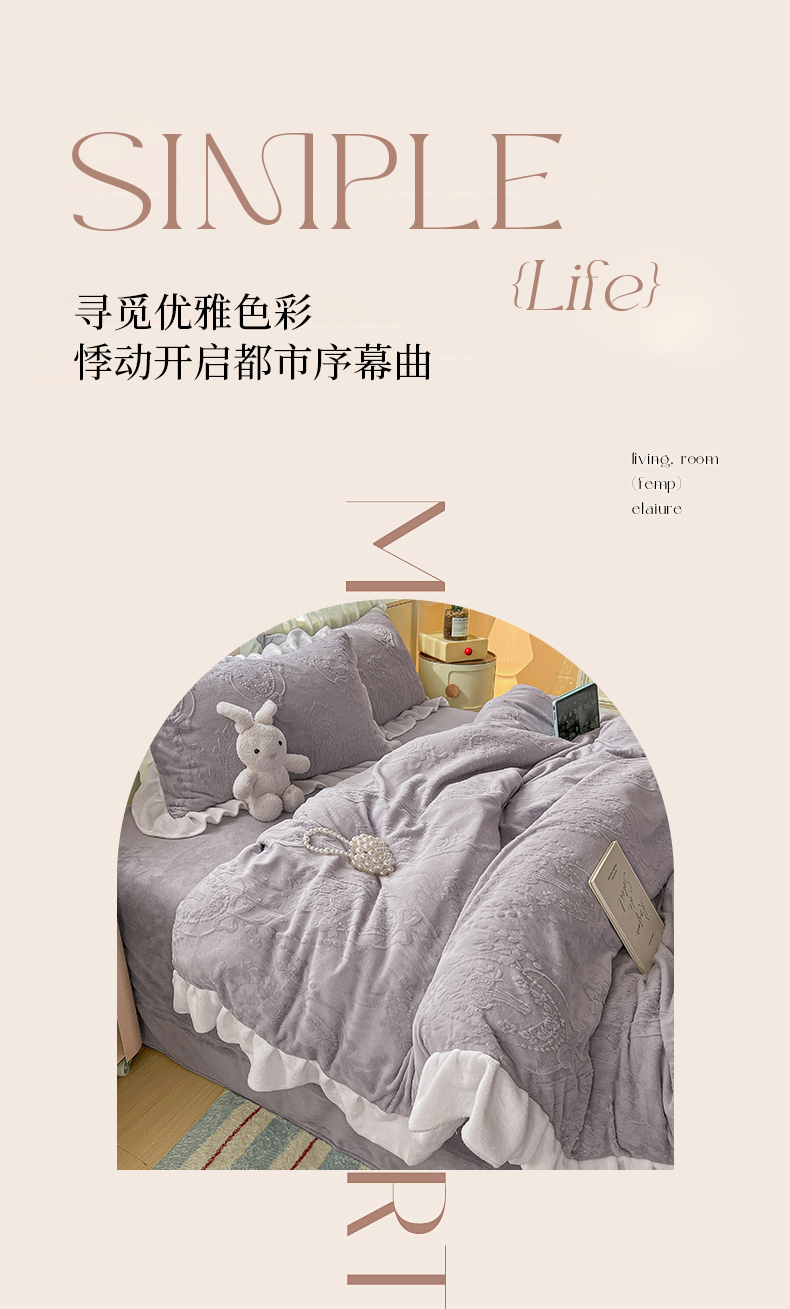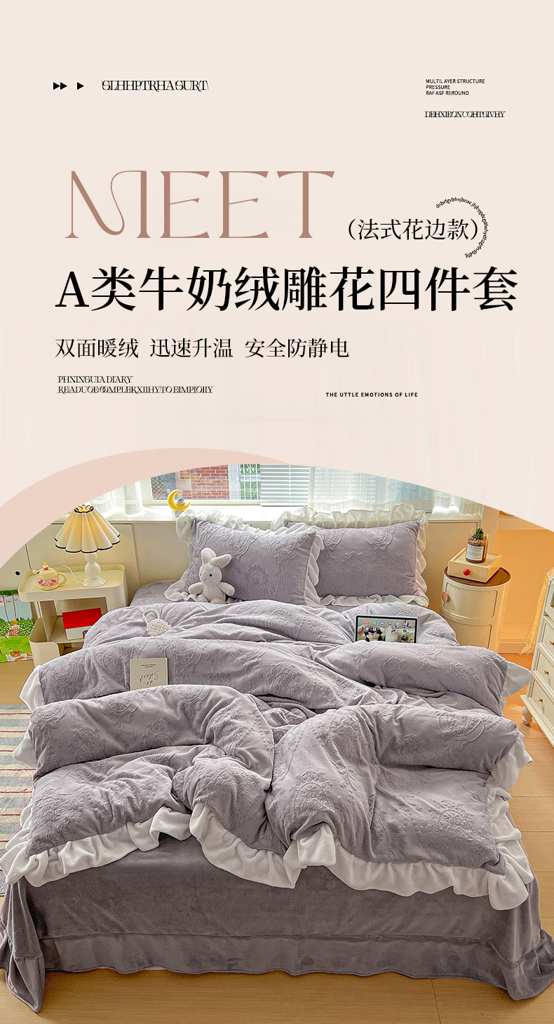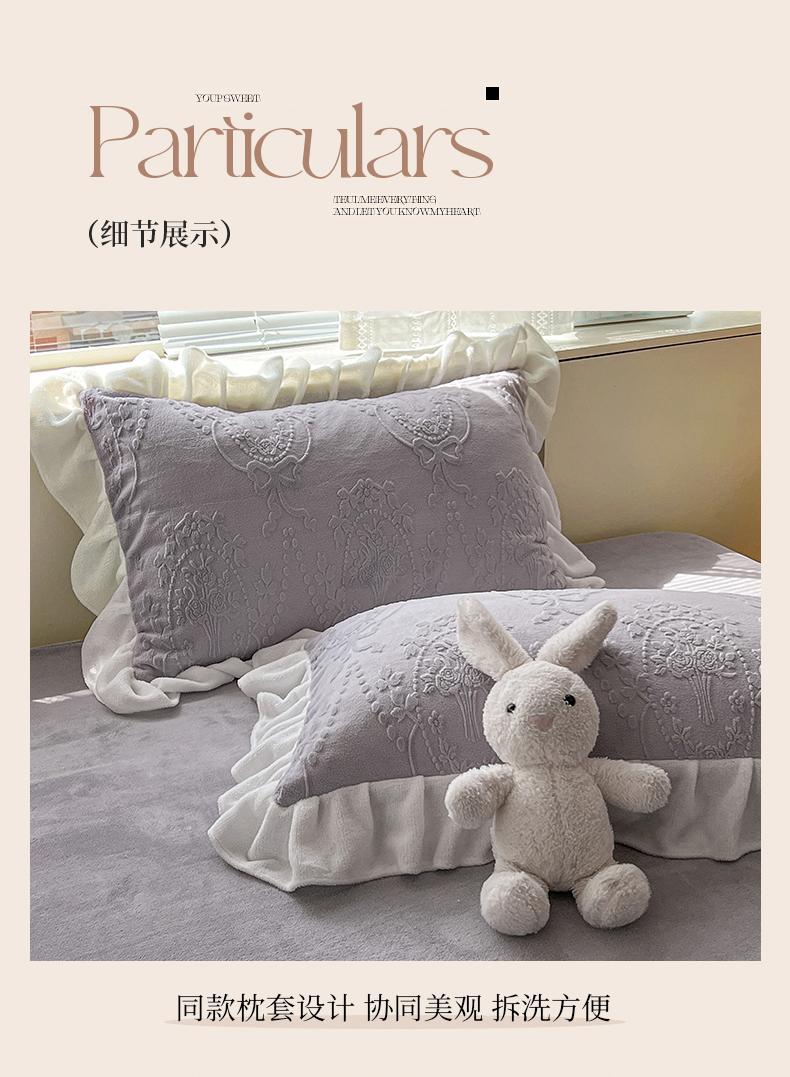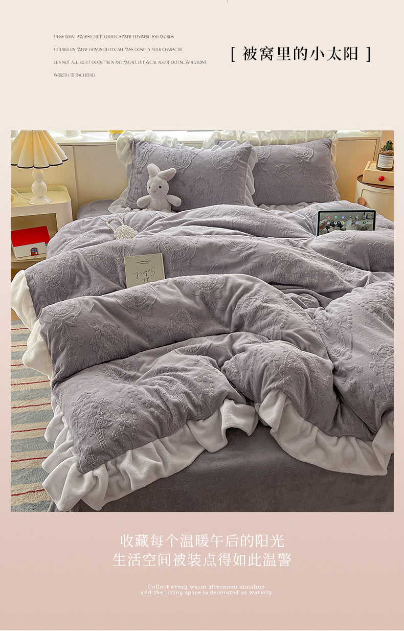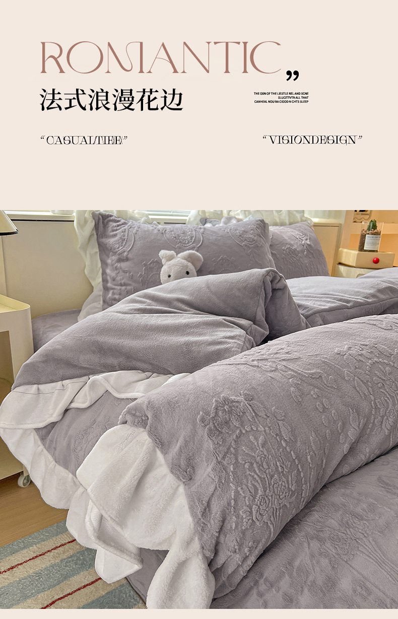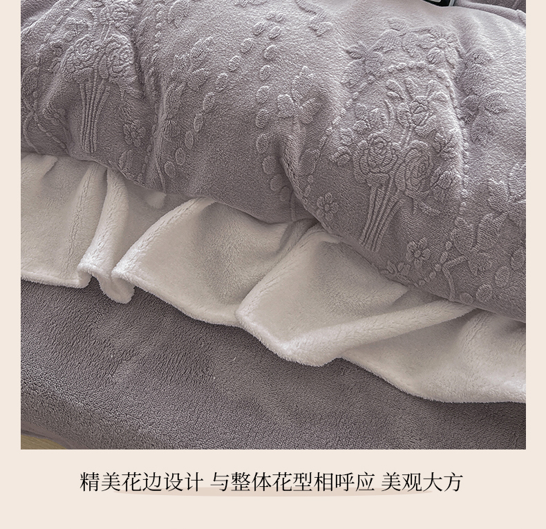 当前位置: 91家纺网 > 商品网购 > 床品套件 > 四件套 > 牛奶绒四件套 > 亿梵家居 2025新款法式花边款A类5D牛奶绒立体雕花四件套(提供买家秀) 花边款 手捧花-香芋紫