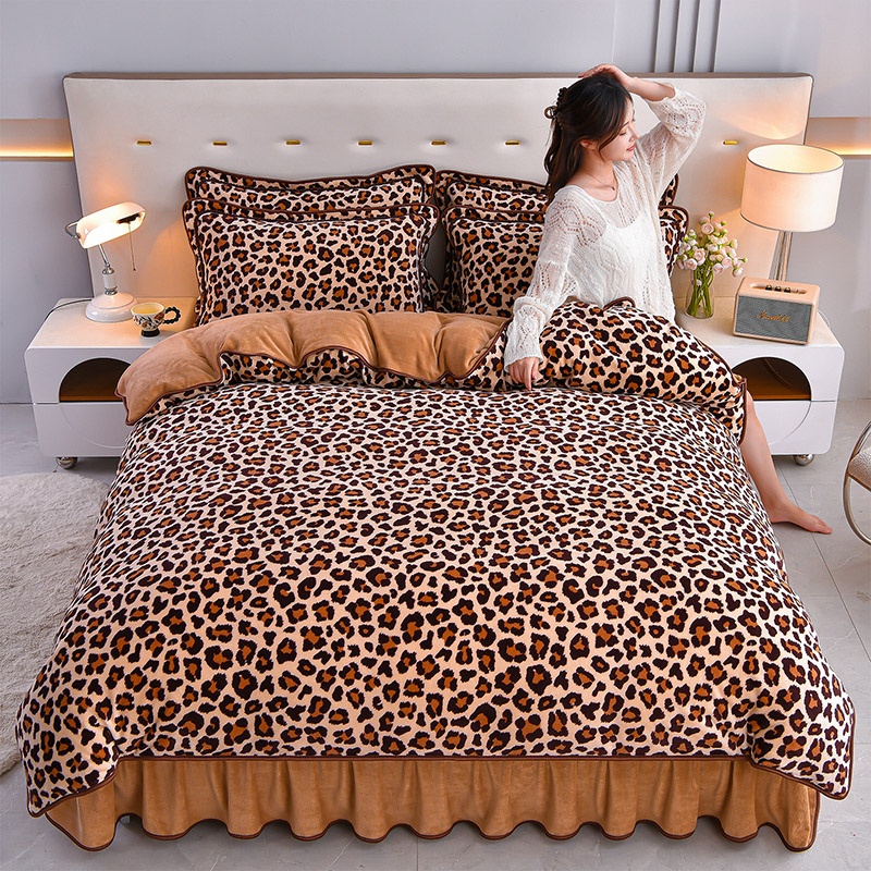 商品名称:赛丽雅 2025新款牛奶绒床裙四件套8-9斤法莱绒直播爆款日产2万套 豹纹咖