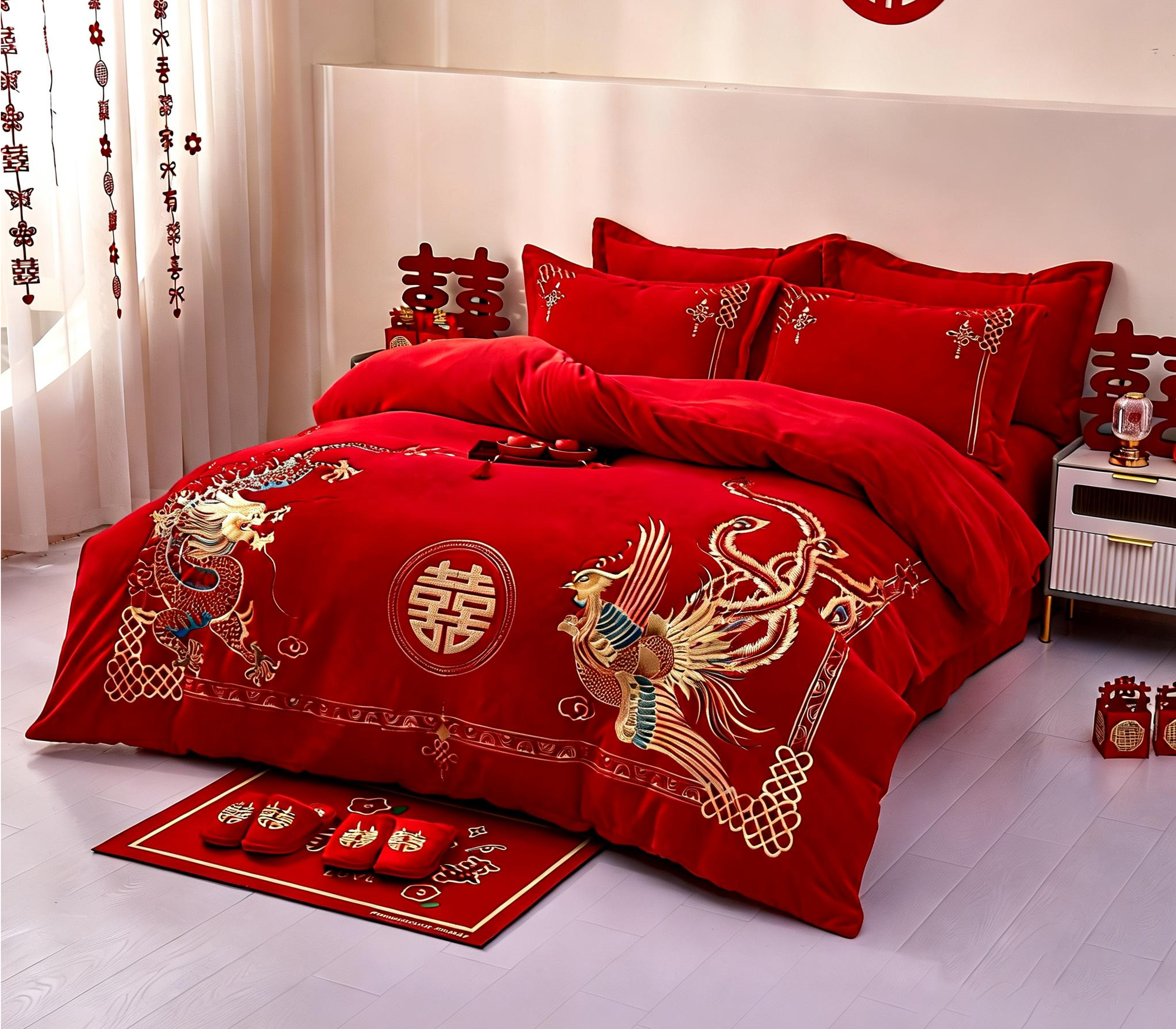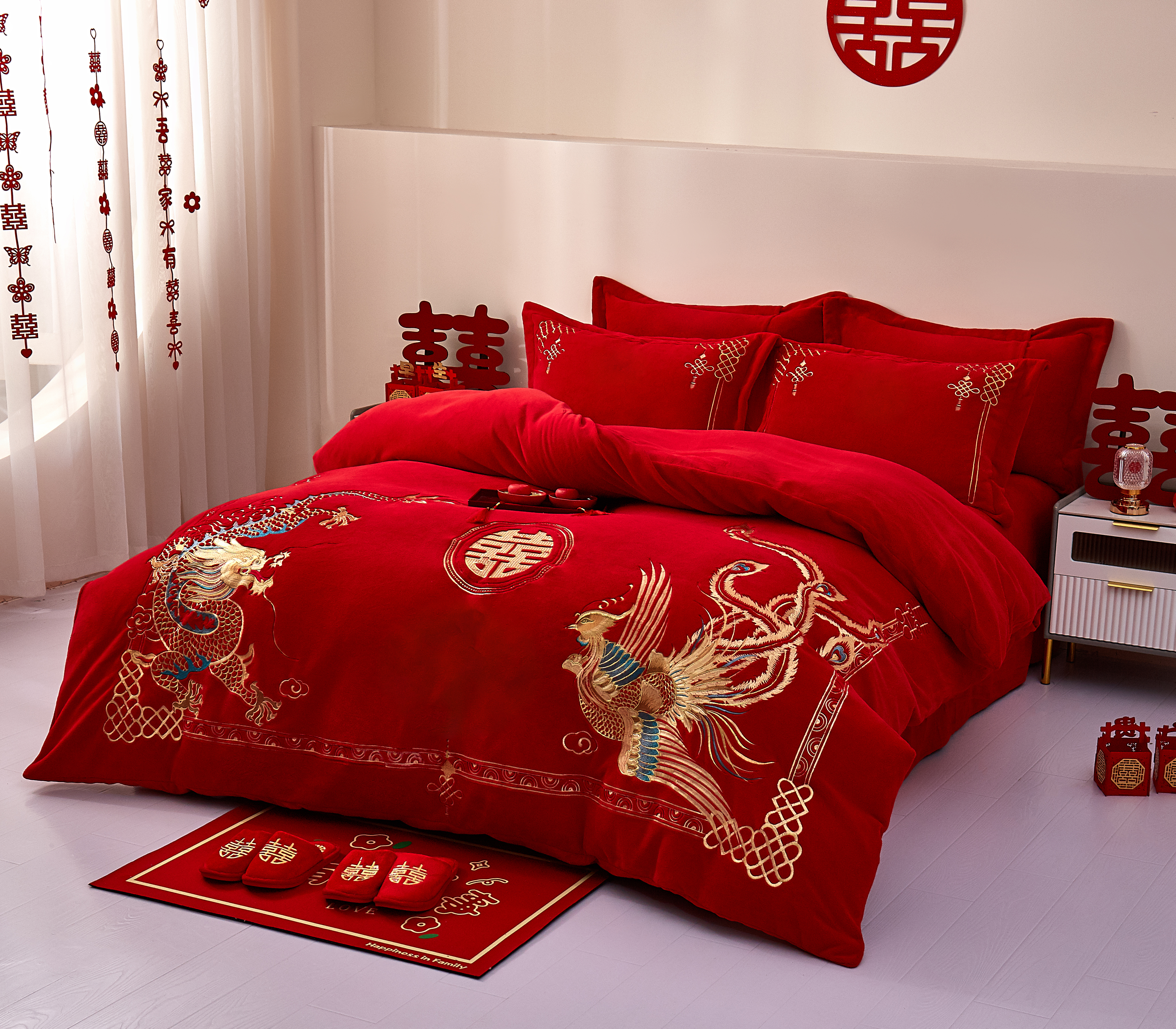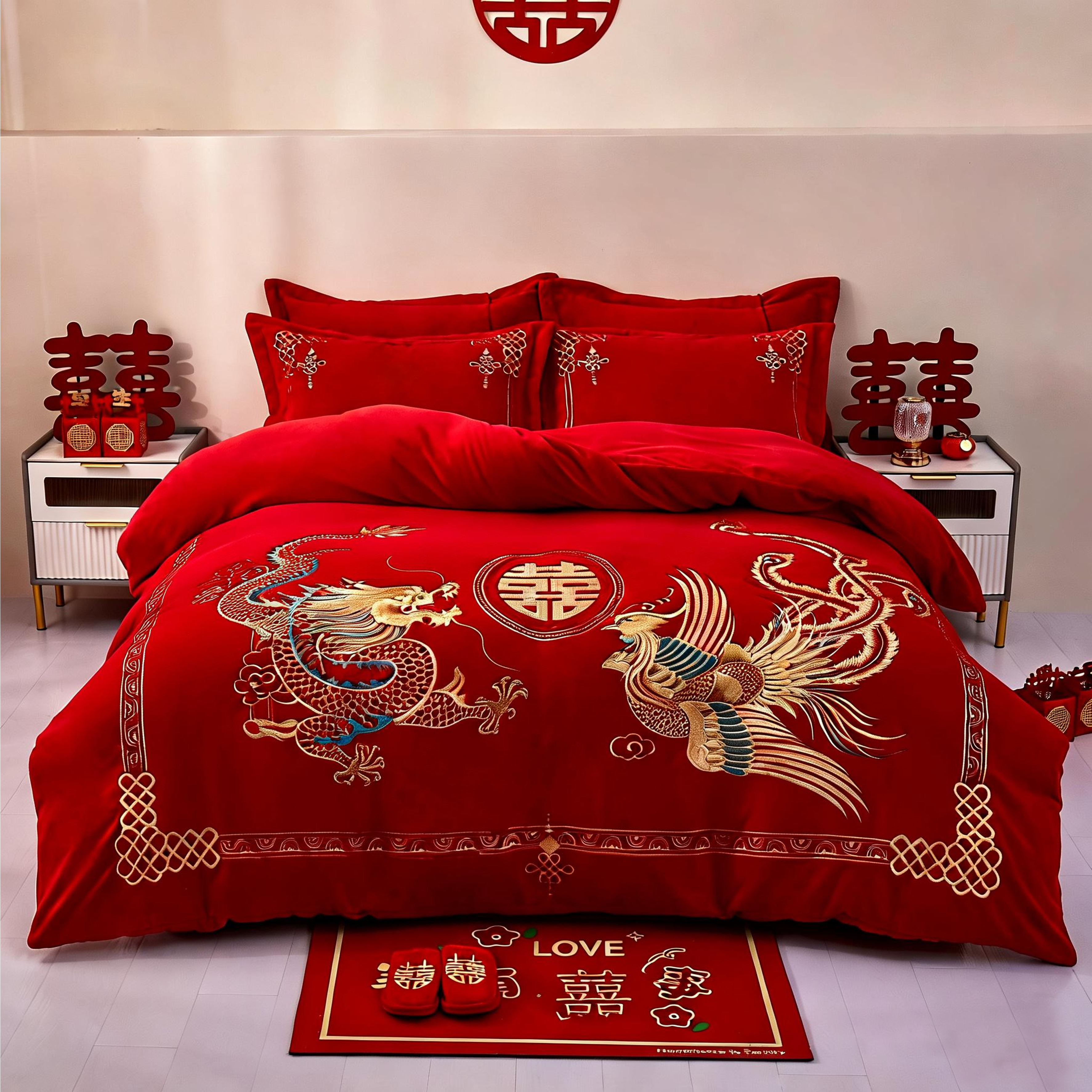 布乐意 2025新款高克重大红牛奶绒婚庆全工艺重工刺绣新中式结婚四件套六件套小红书推荐抖音直播爆款 双喜龙凤