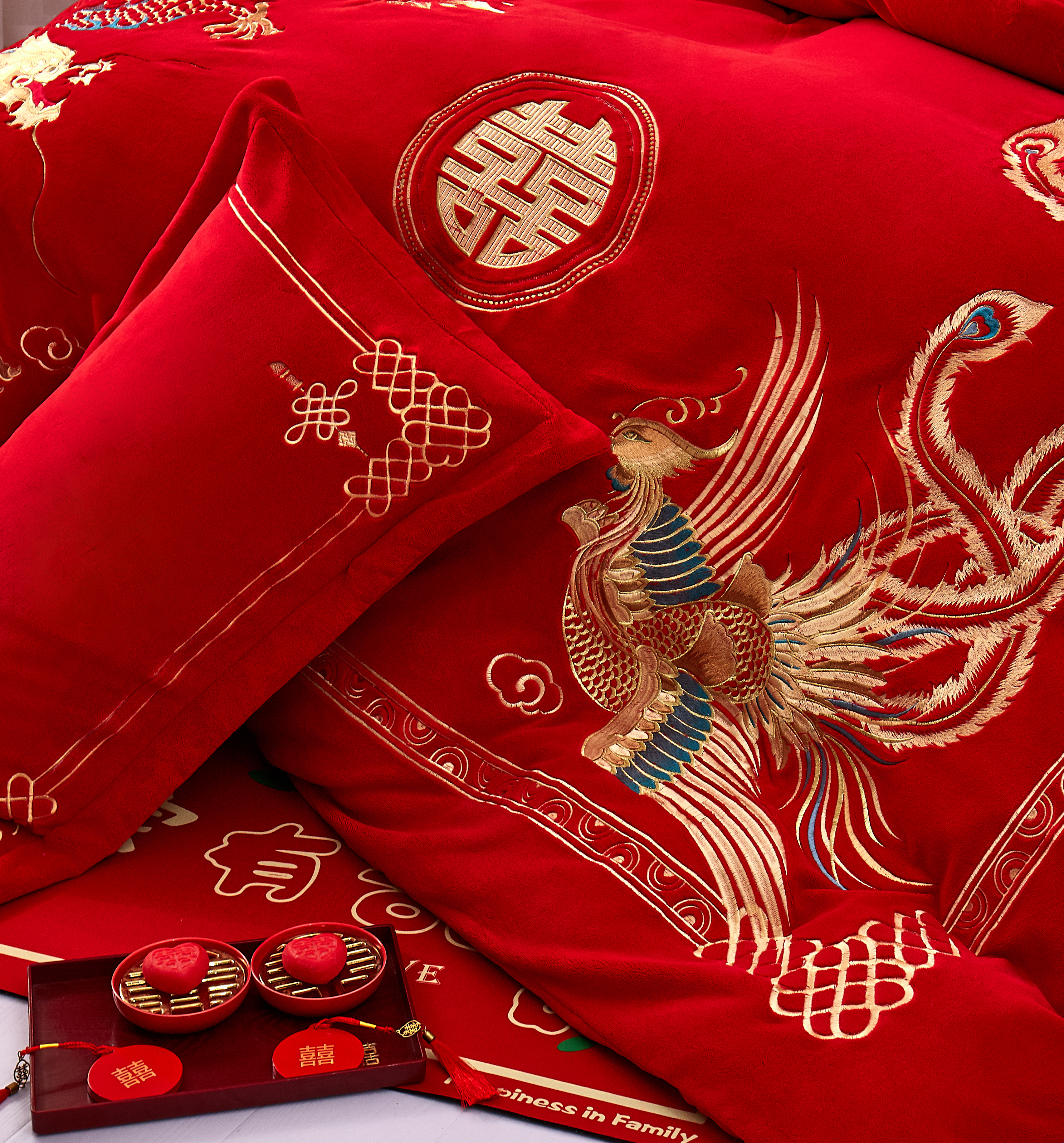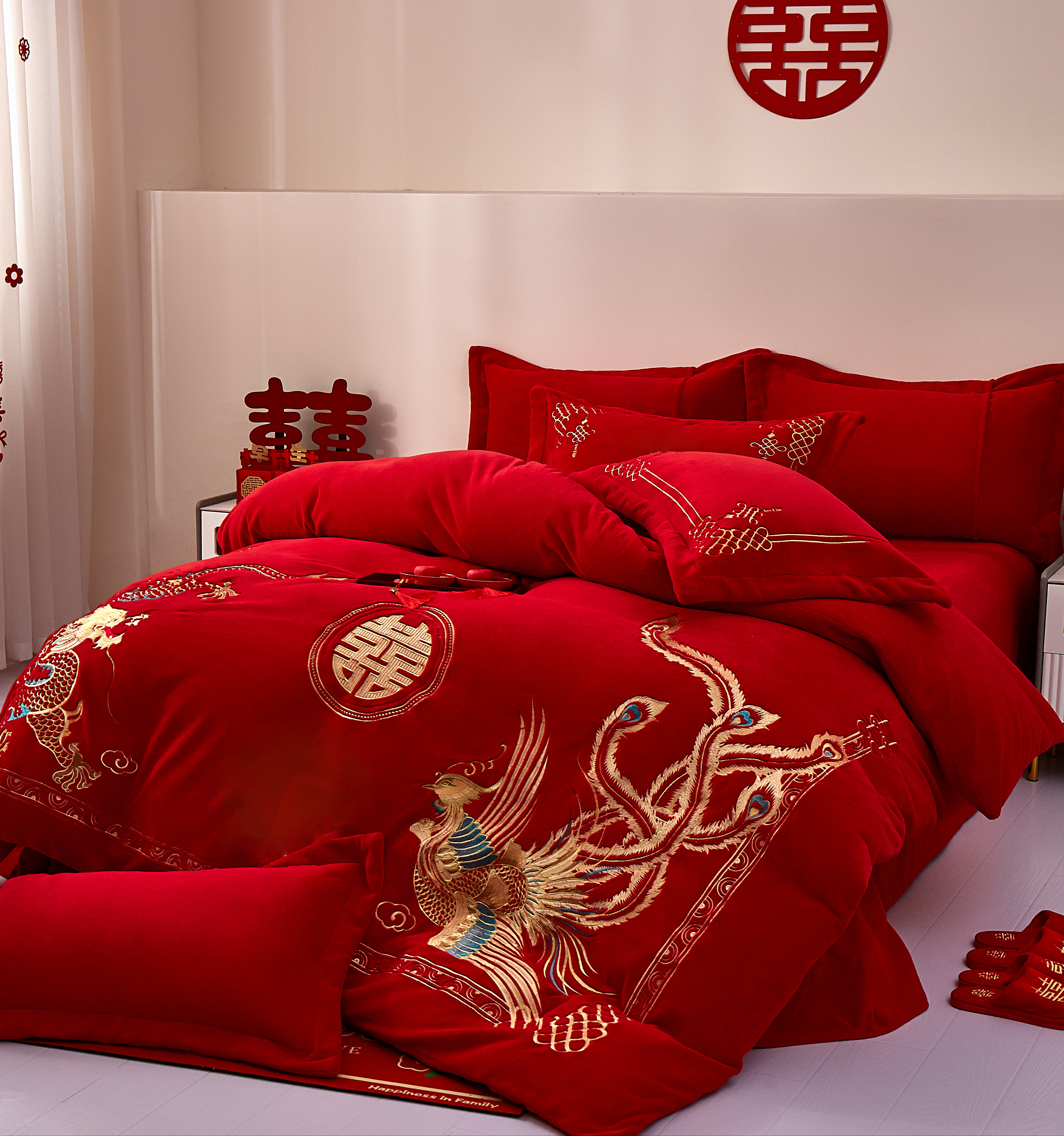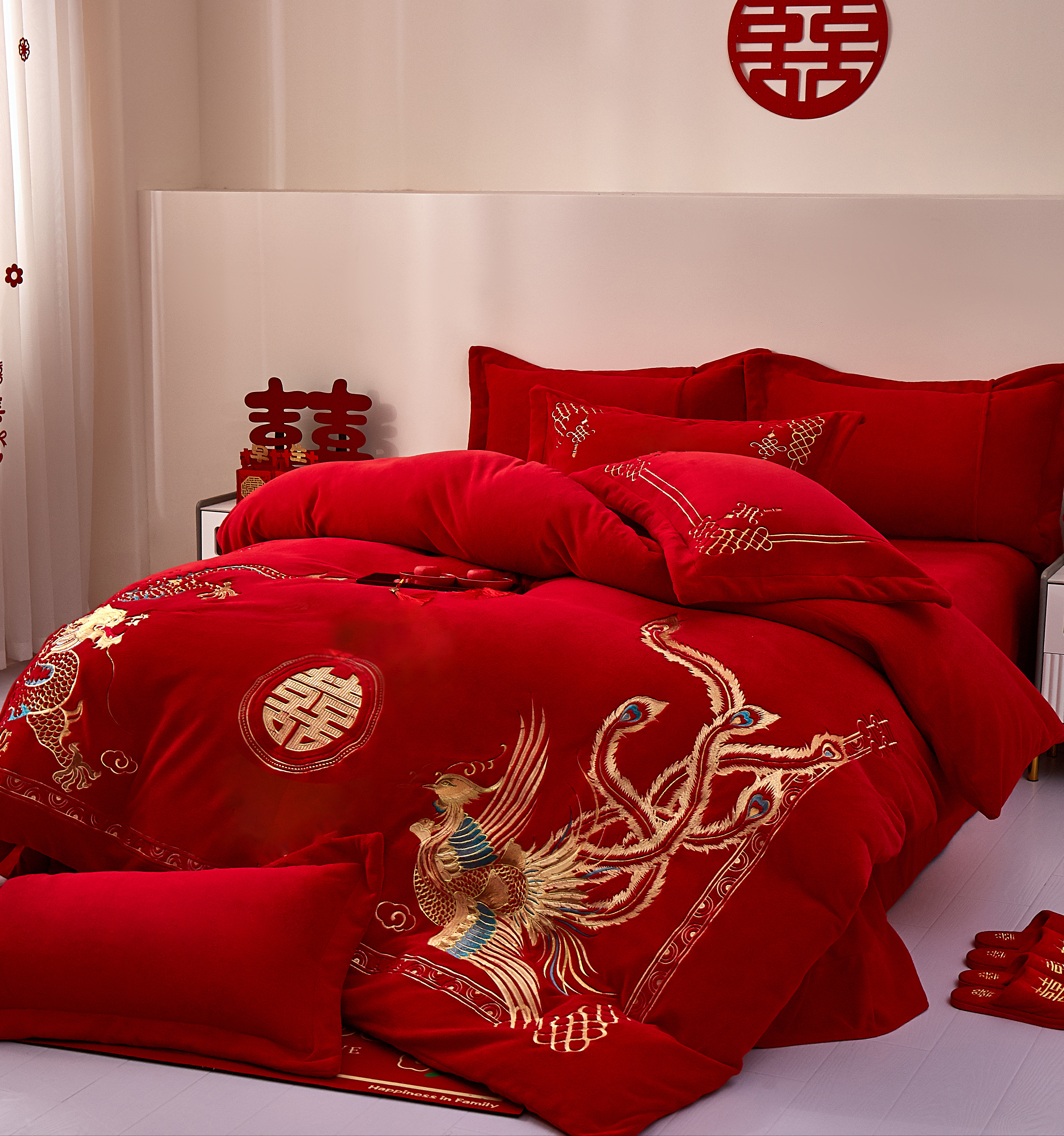 布乐意 2025新款高克重大红牛奶绒婚庆全工艺重工刺绣新中式结婚四件套六件套小红书推荐抖音直播爆款 双喜龙凤