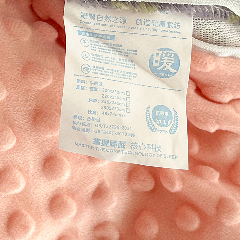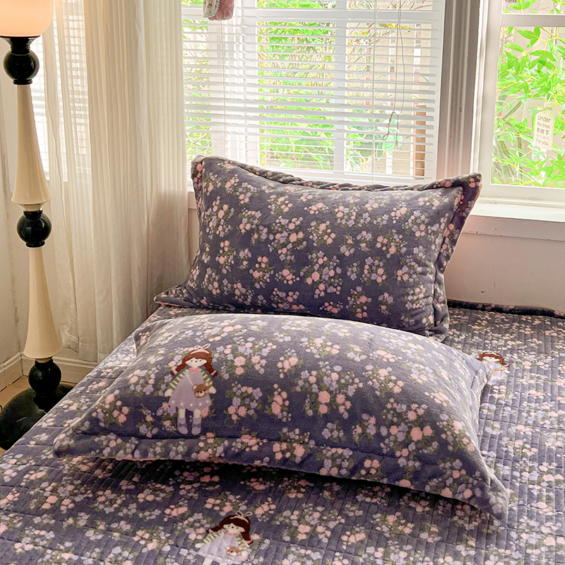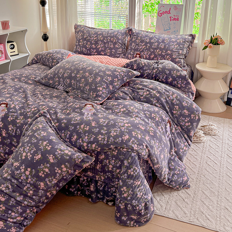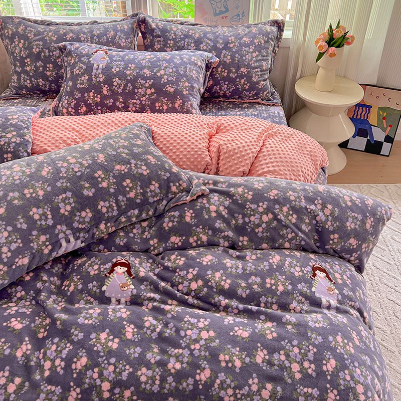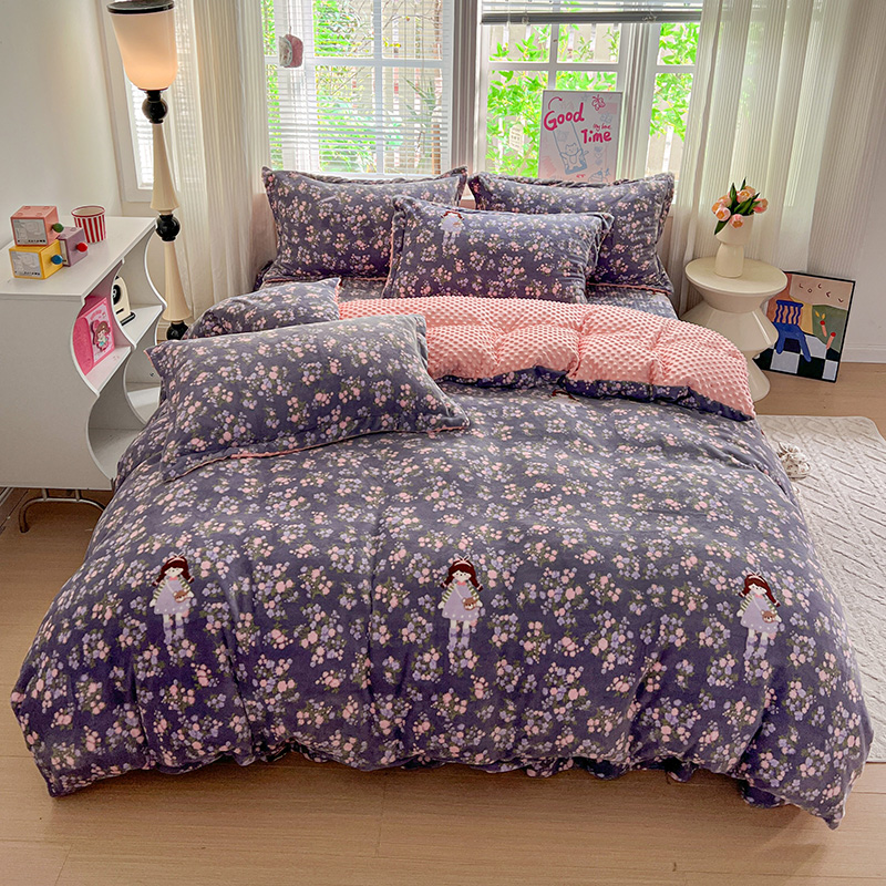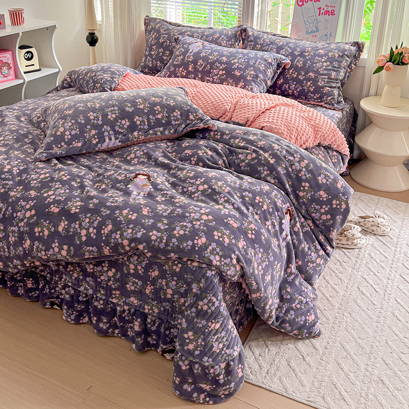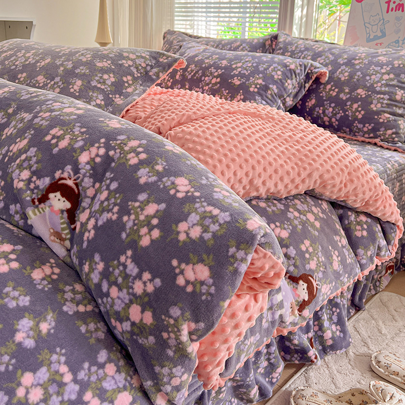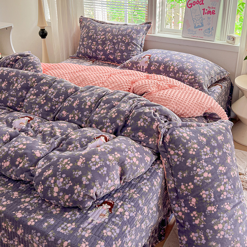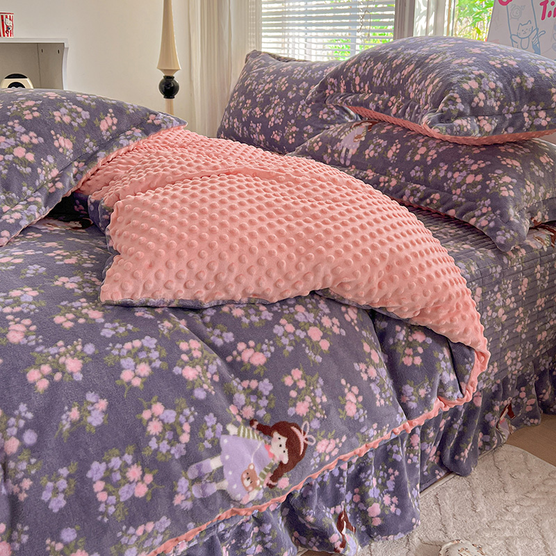 当前位置: 91家纺网 > 商品网购 > 床品套件 > 四件套 > 牛奶绒四件套 > 一比一 2025新款加厚保暖豆豆牛奶绒床盖款四件套紫花萌境