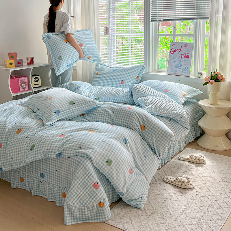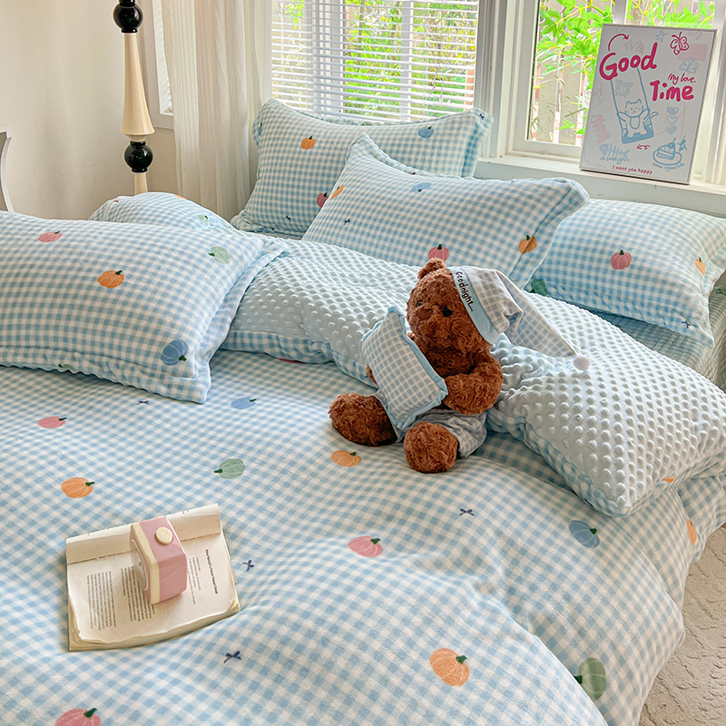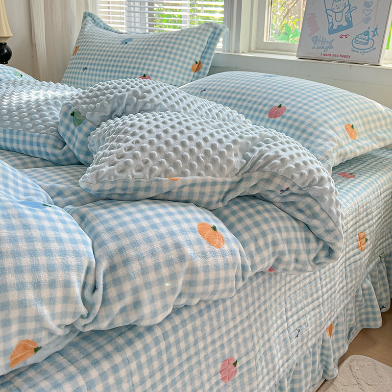 当前位置: 91家纺网 > 商品网购 > 床品套件 > 四件套 > 牛奶绒四件套 > 一比一 2025新款加厚保暖豆豆牛奶绒床盖款四件套蓝格南瓜