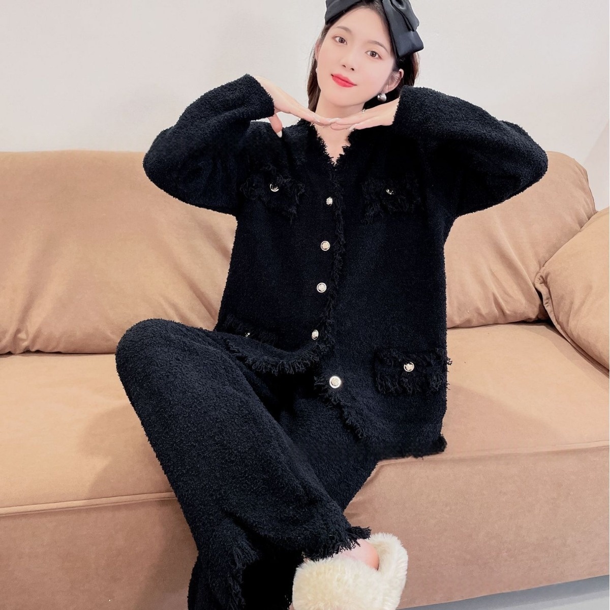 商品名称:洛兰沙家居馆 2025新款半边绒睡衣女高级感开衫直筒裤家居服加厚可外穿百搭睡衣家居服 半边绒32