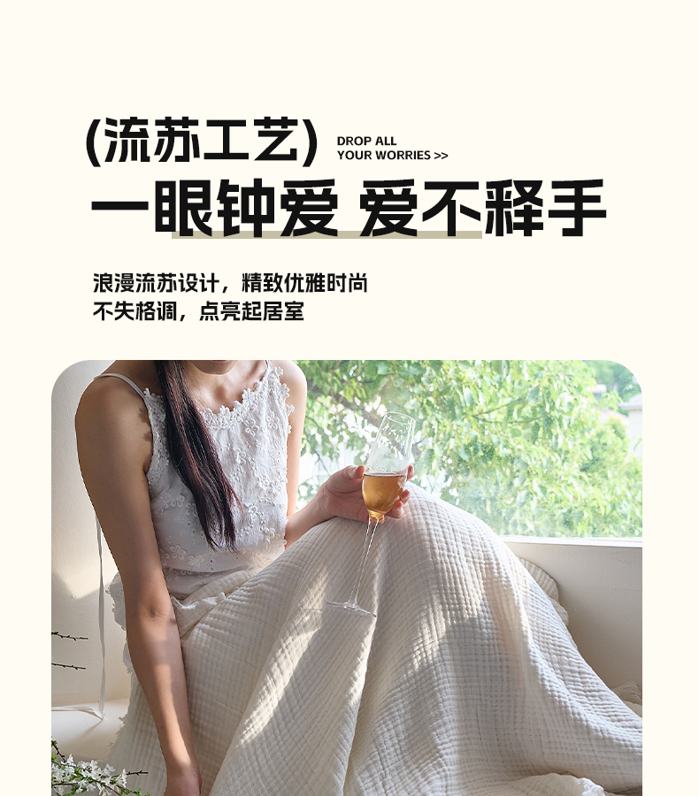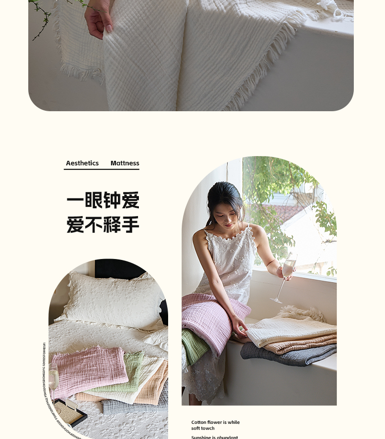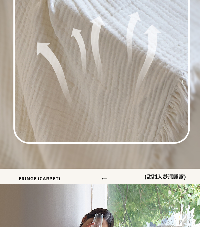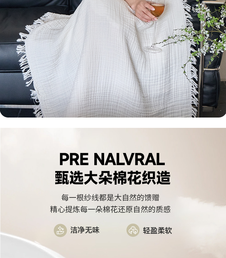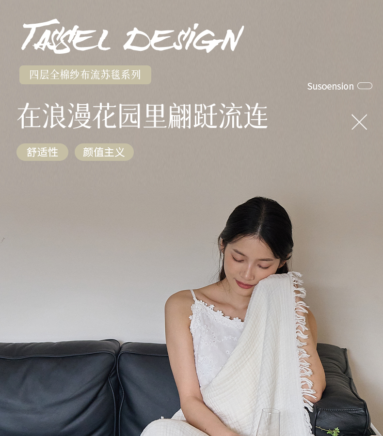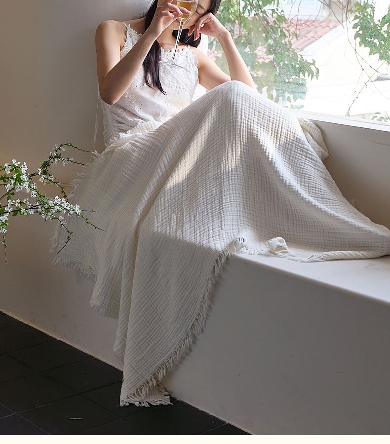 沐瑟家纺 2025新款四层全棉纱布流苏毯系列-浪漫 浪漫-月白