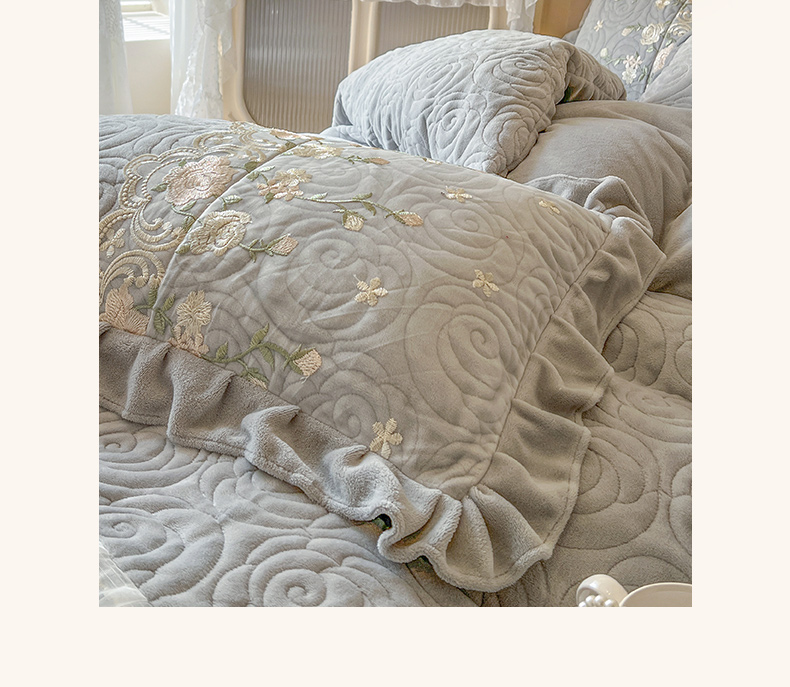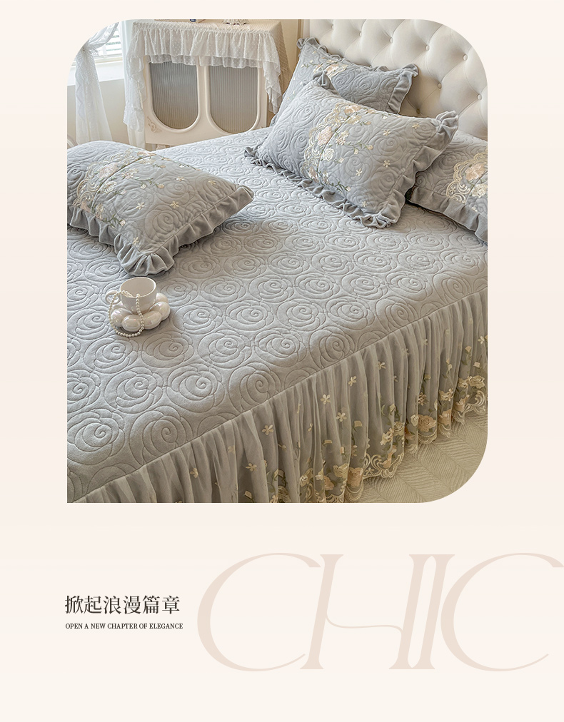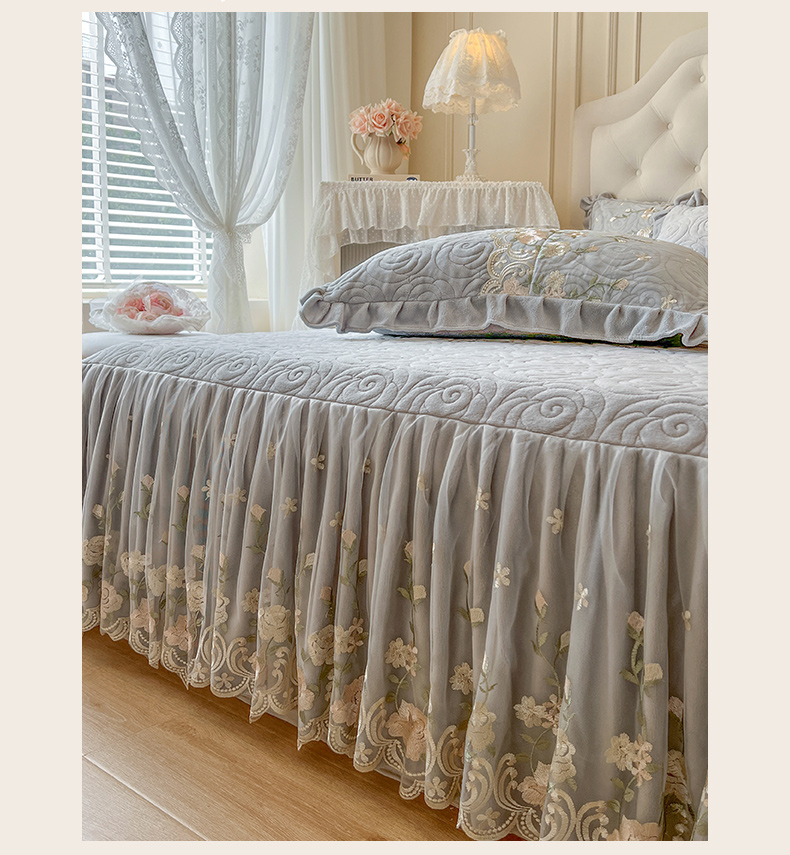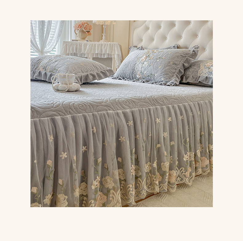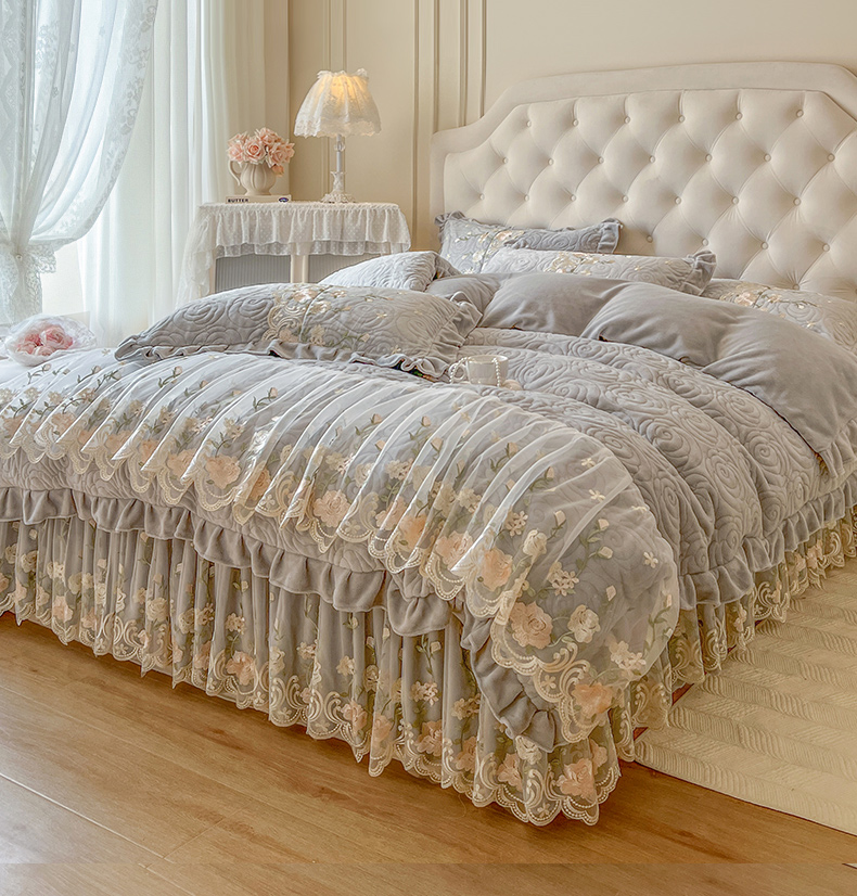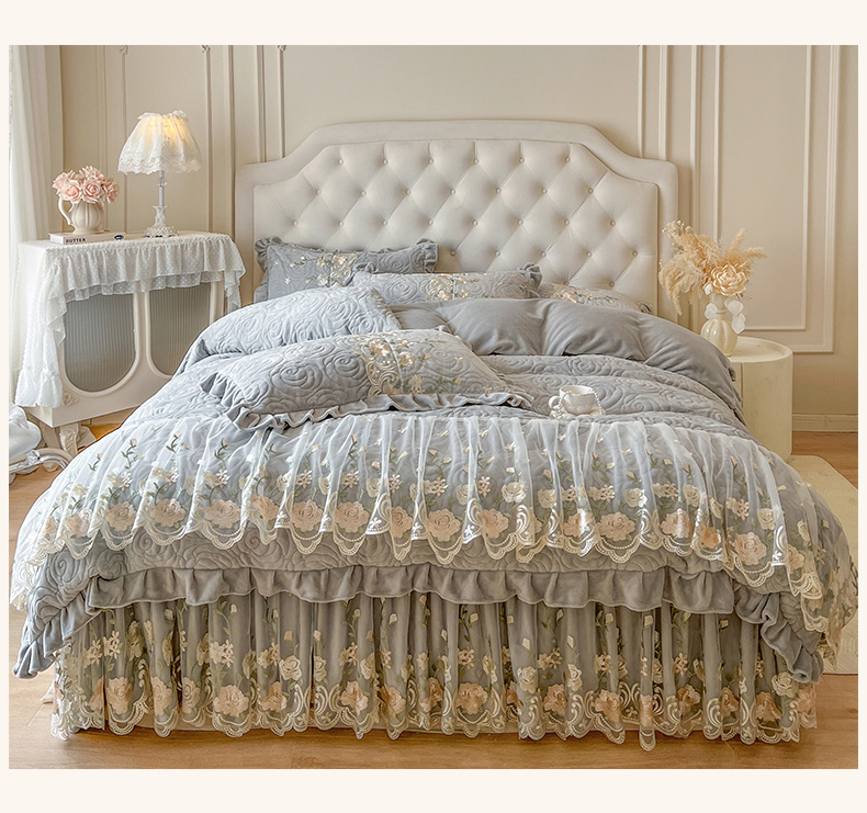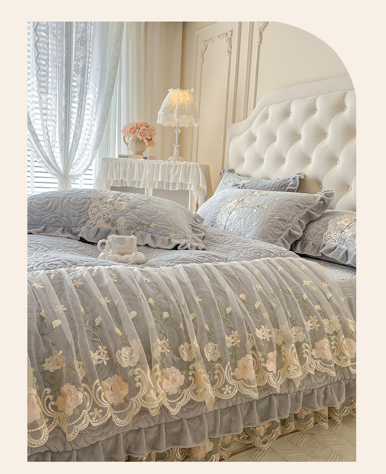 当前位置: 91家纺网 > 商品网购 > 床品套件 > 四件套 > 牛奶绒四件套 > 恋尚 2025新款柔软牛奶绒保暖蕾丝床裙四件套-玫瑰故事(控价305) 玫瑰故事-椰蓉灰