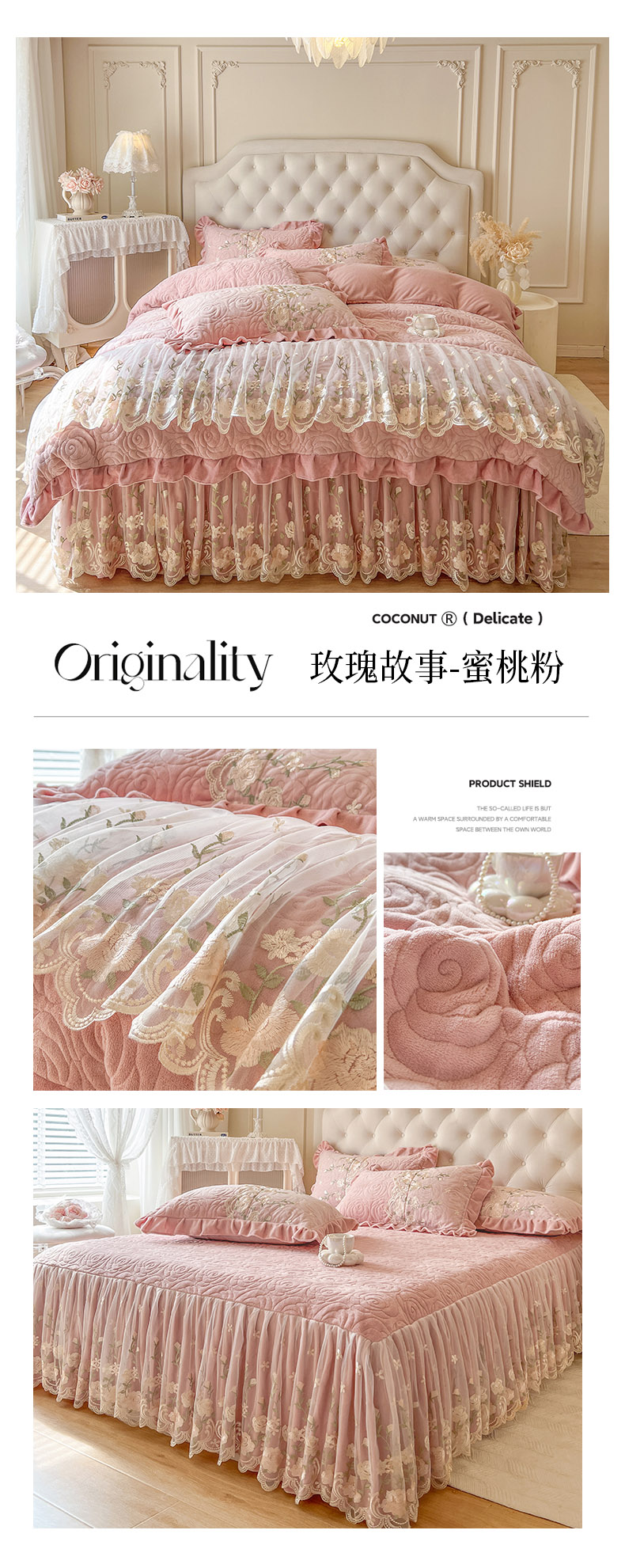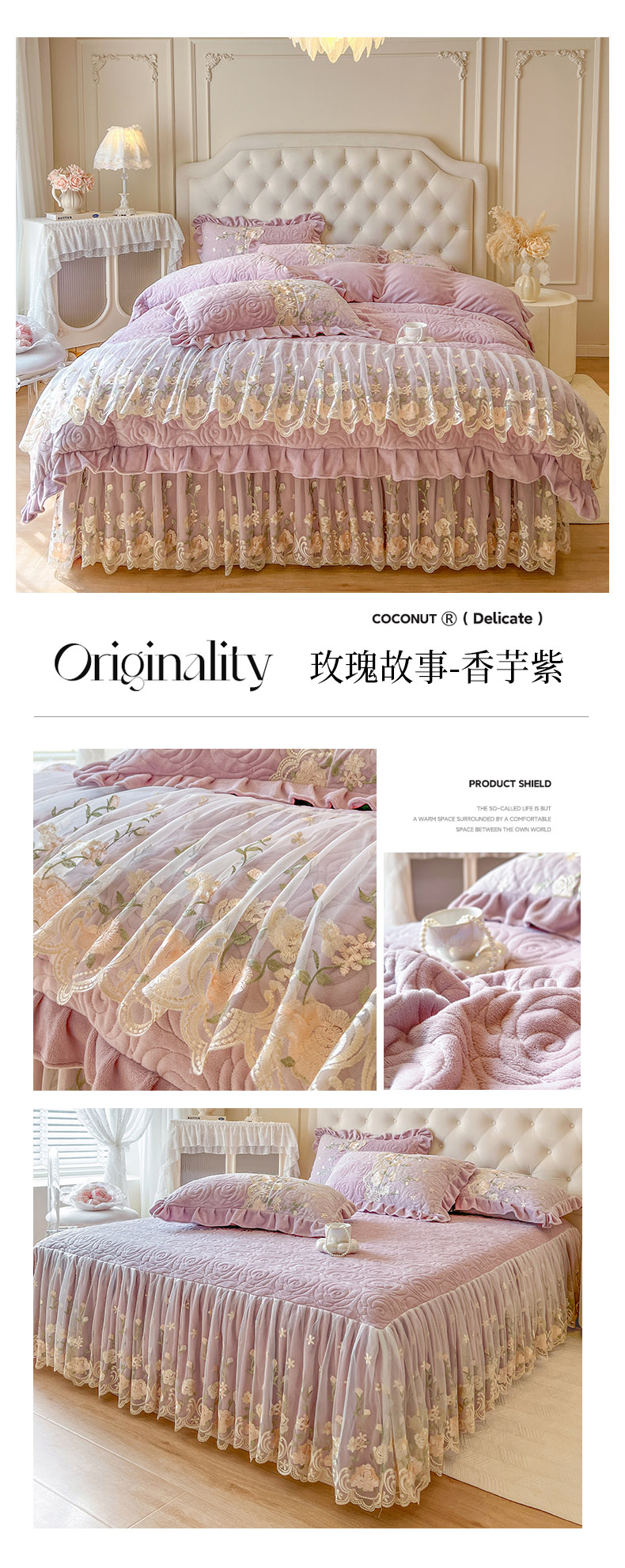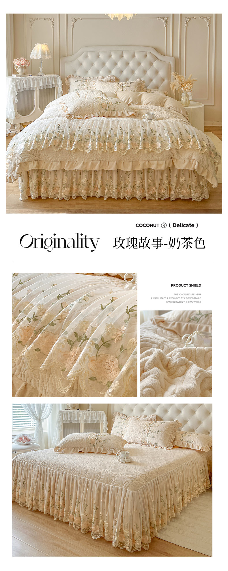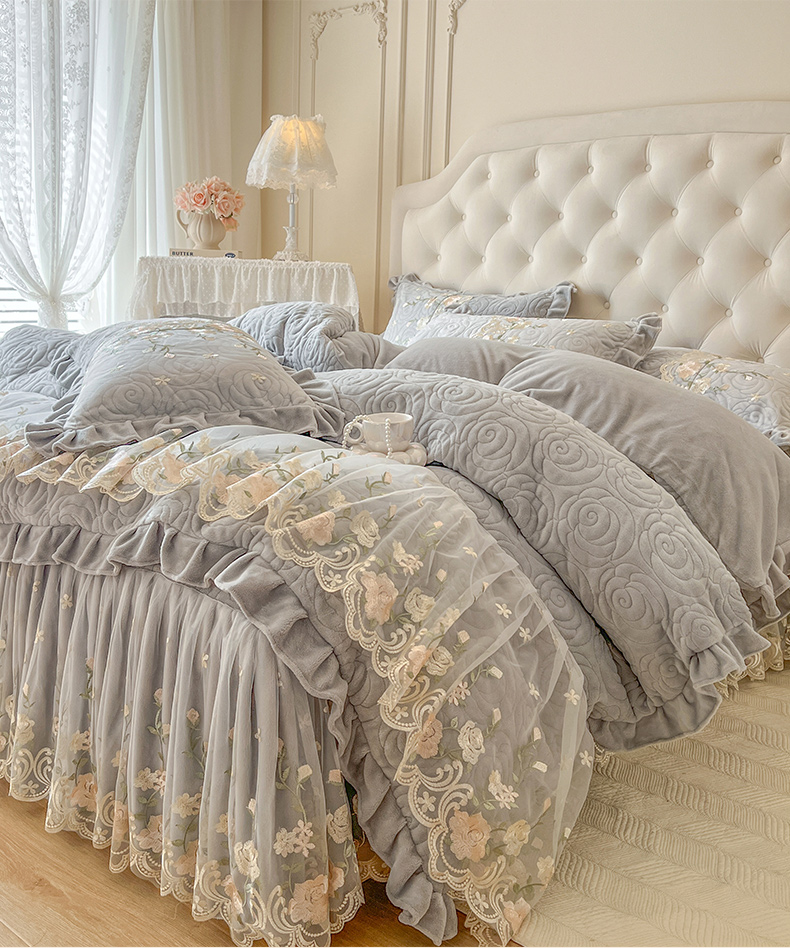 当前位置: 91家纺网 > 商品网购 > 床品套件 > 四件套 > 牛奶绒四件套 > 恋尚 2025新款柔软牛奶绒保暖蕾丝床裙四件套-玫瑰故事(控价305) 玫瑰故事-椰蓉灰