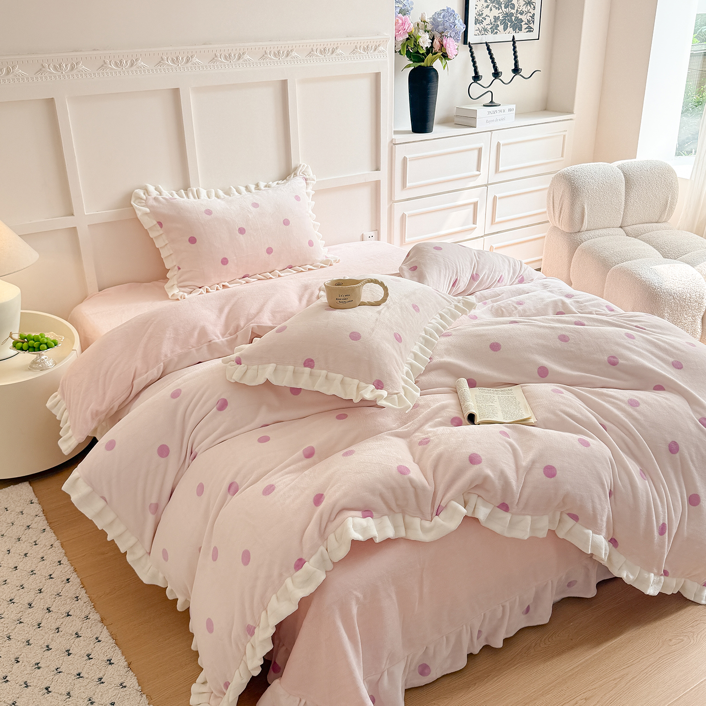 当前位置: 91家纺网 > 商品网购 > 床品套件 > 四件套 > 牛奶绒四件套 > 潘朵拉家纺 2025新款法式牛奶绒双层花边四件套 梦露