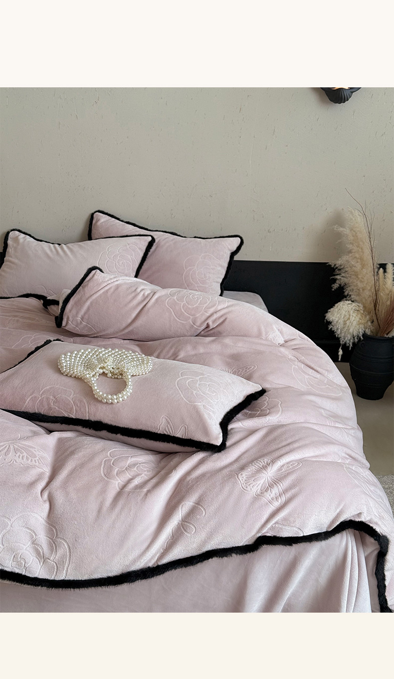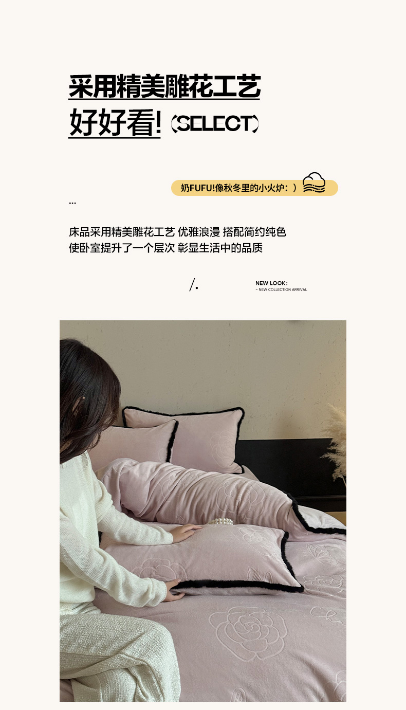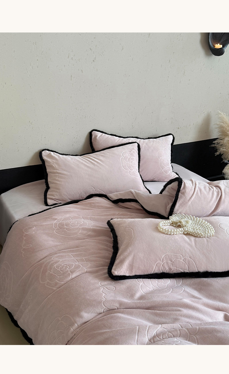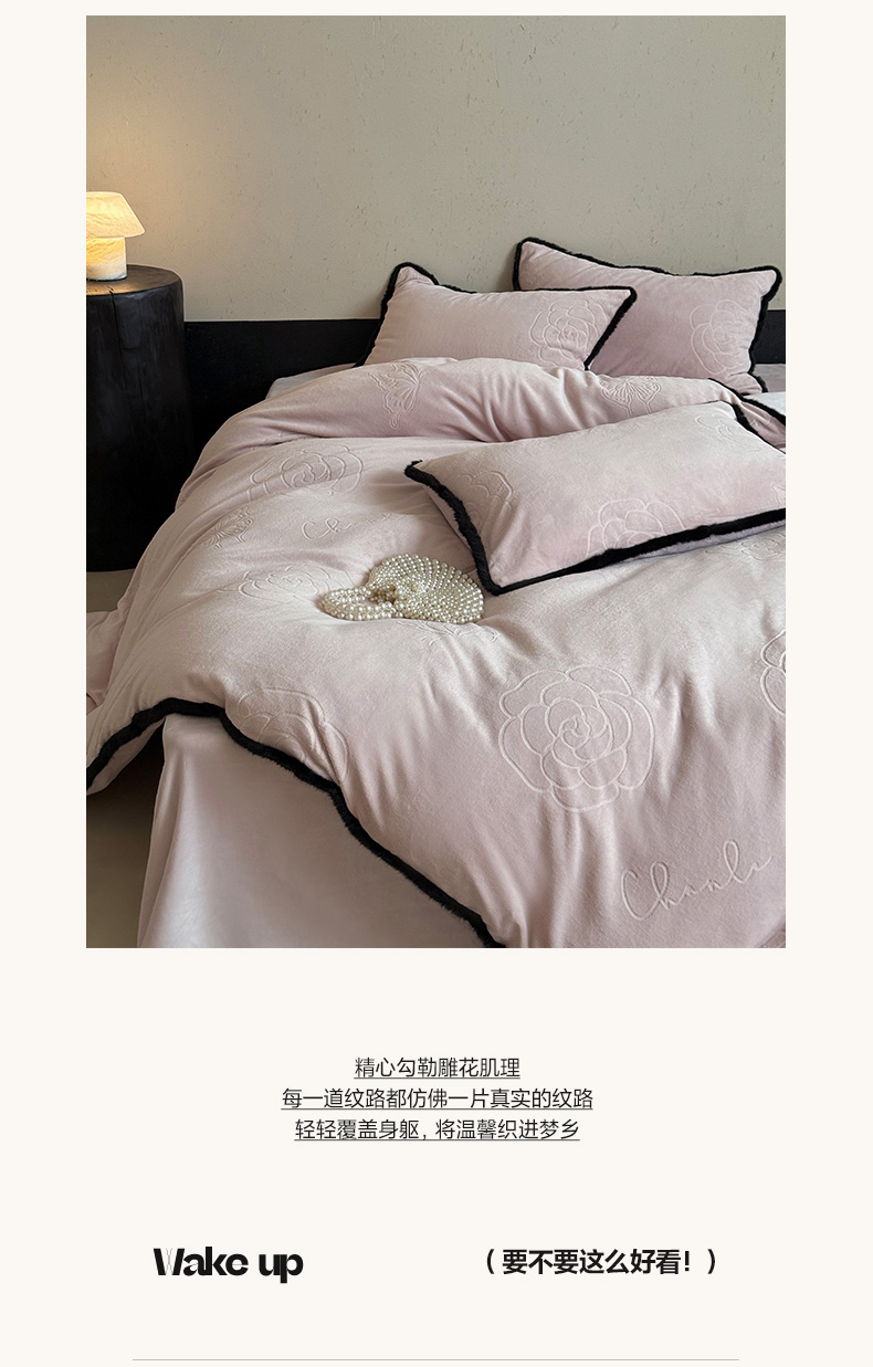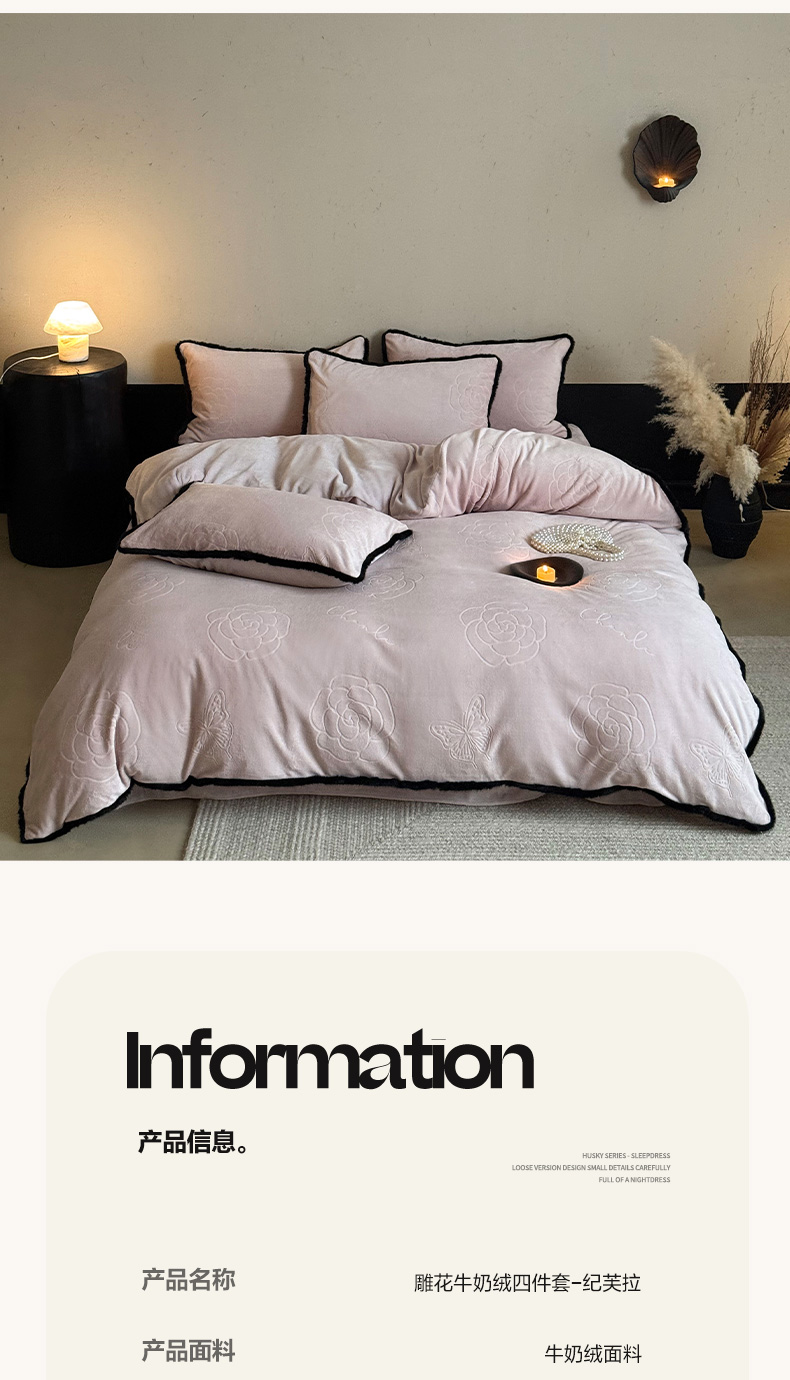 商品名称:三味舒屋 2025新款毛边雕花牛奶绒四件套-纪芙拉 纪芙-拉粉