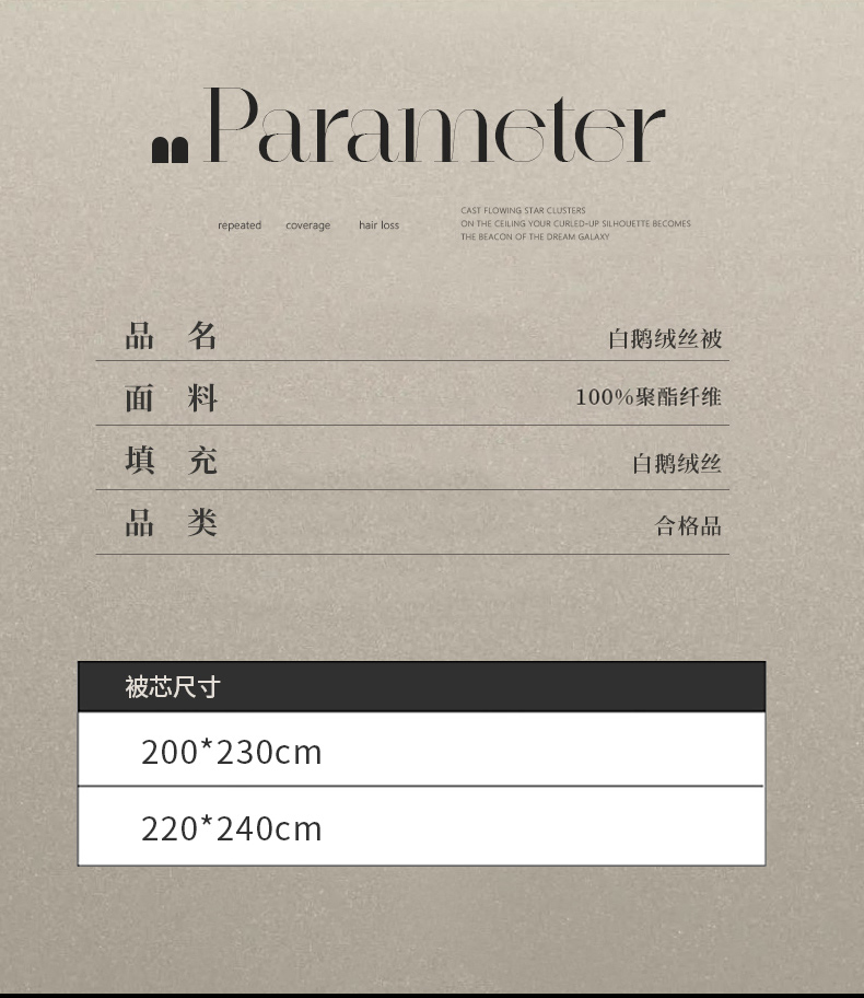 白鹅绒丝220*240填充1200克 春秋被 | ¥465.00 |