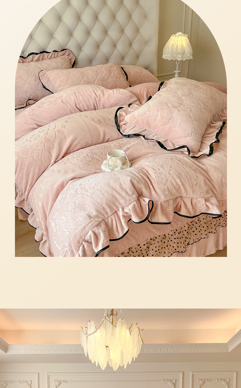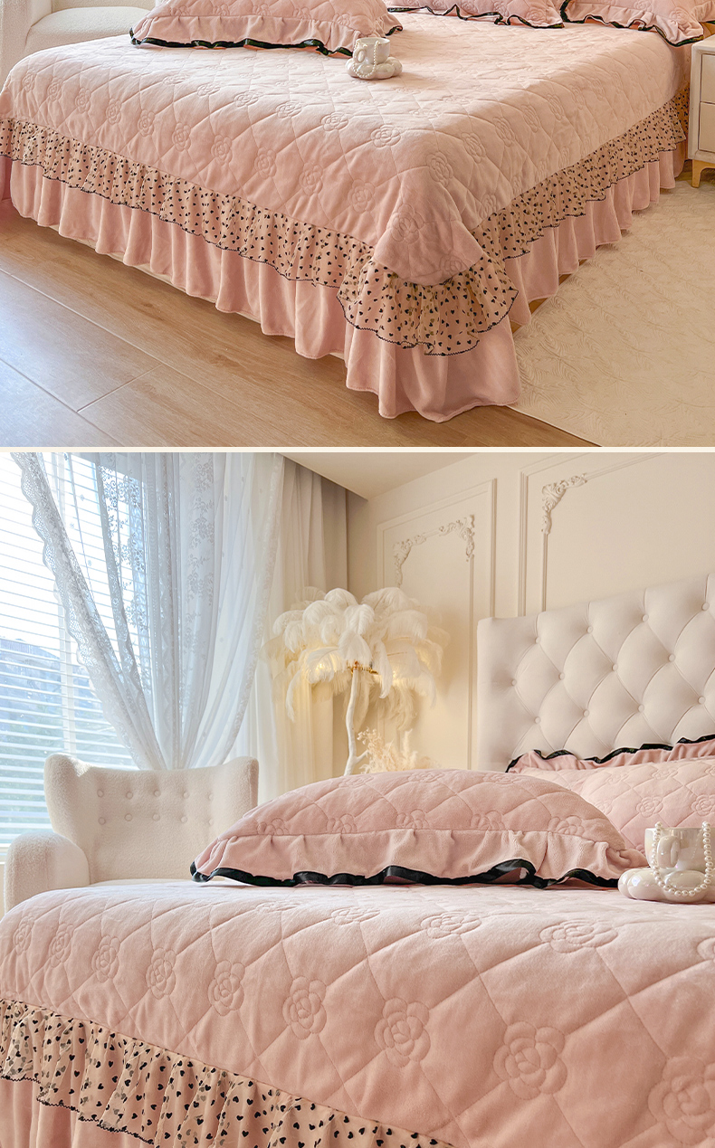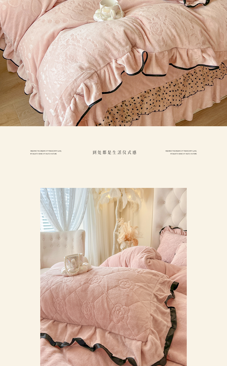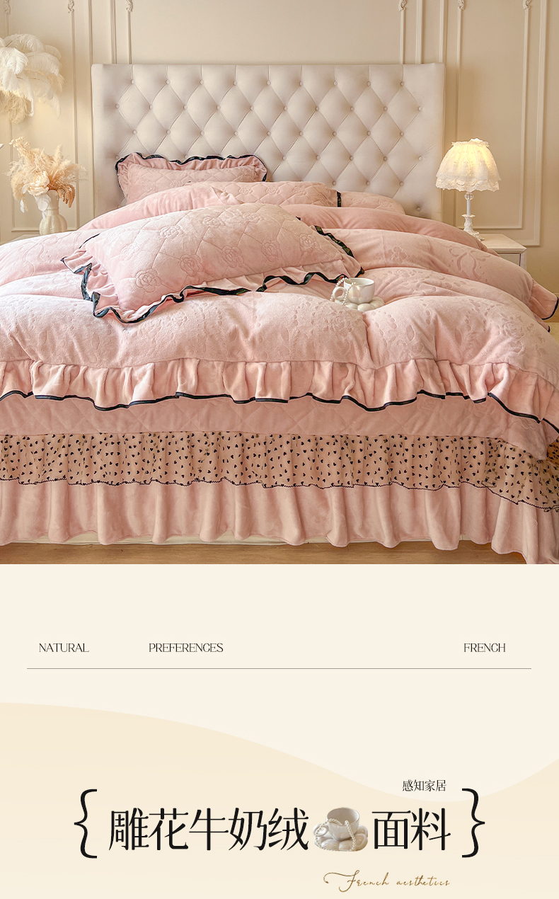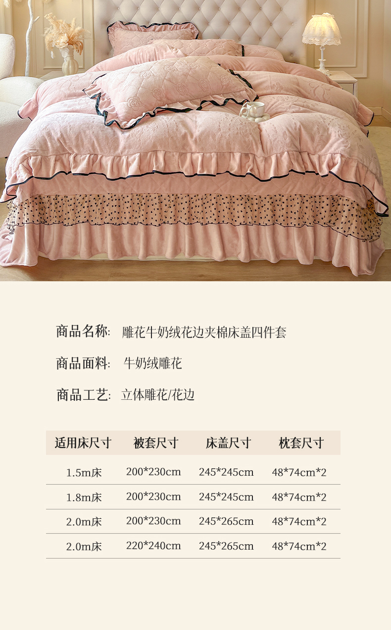 商品名称:瑞宝 2025新款雕花牛奶绒花边夹棉床盖四件套-莫妮卡 少女粉