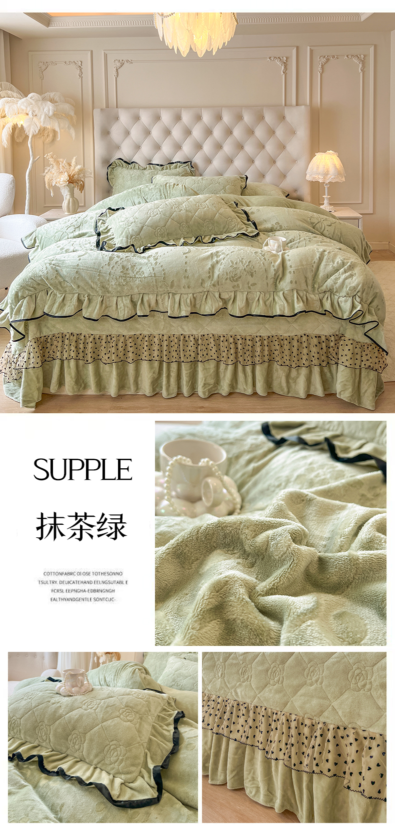 (总)瑞宝 2025新款全棉花边床裙三件套系列-落日甜茶,落日甜茶-梦幻玉,落日甜茶-奶油白,落日甜茶-青柠绿,落日甜茶-甜紫