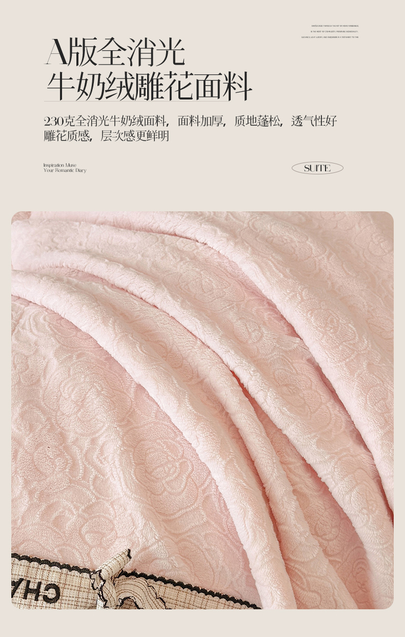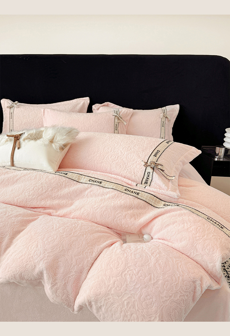 商品名称:大米家居 2025新款蝴蝶结丝带230克全消光牛奶绒雕花绒四件套-山茶花影系列 山茶花影-奶杏粉