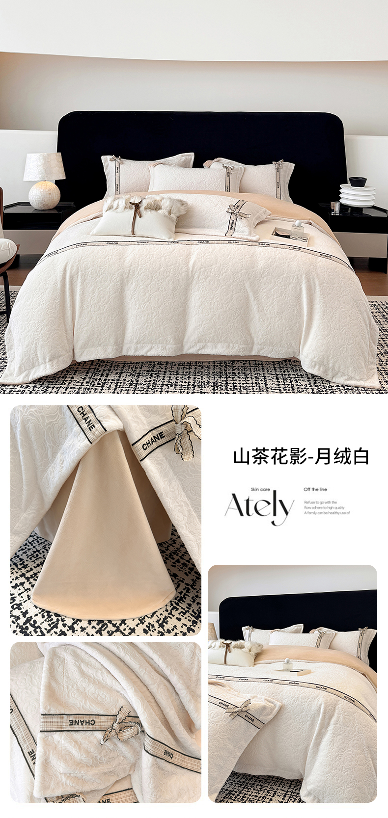 (总)大米家居 2025新款蝴蝶结丝带230克全消光牛奶绒雕花绒四件套-山茶花影系列,山茶花影-奶杏粉,山茶花影-珊瑚粉,山茶花影-月绒白