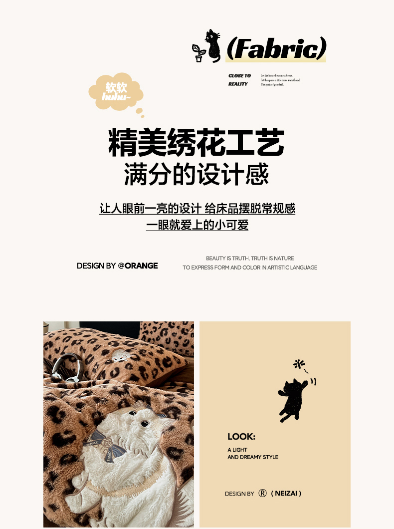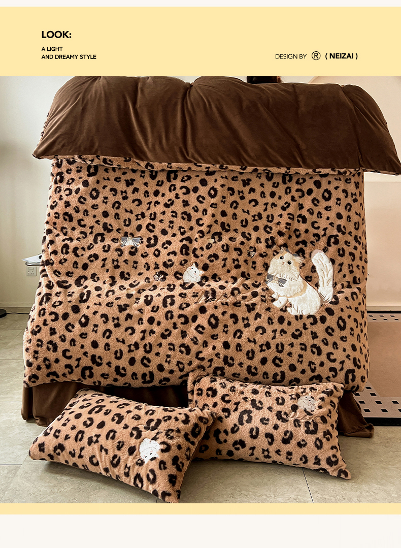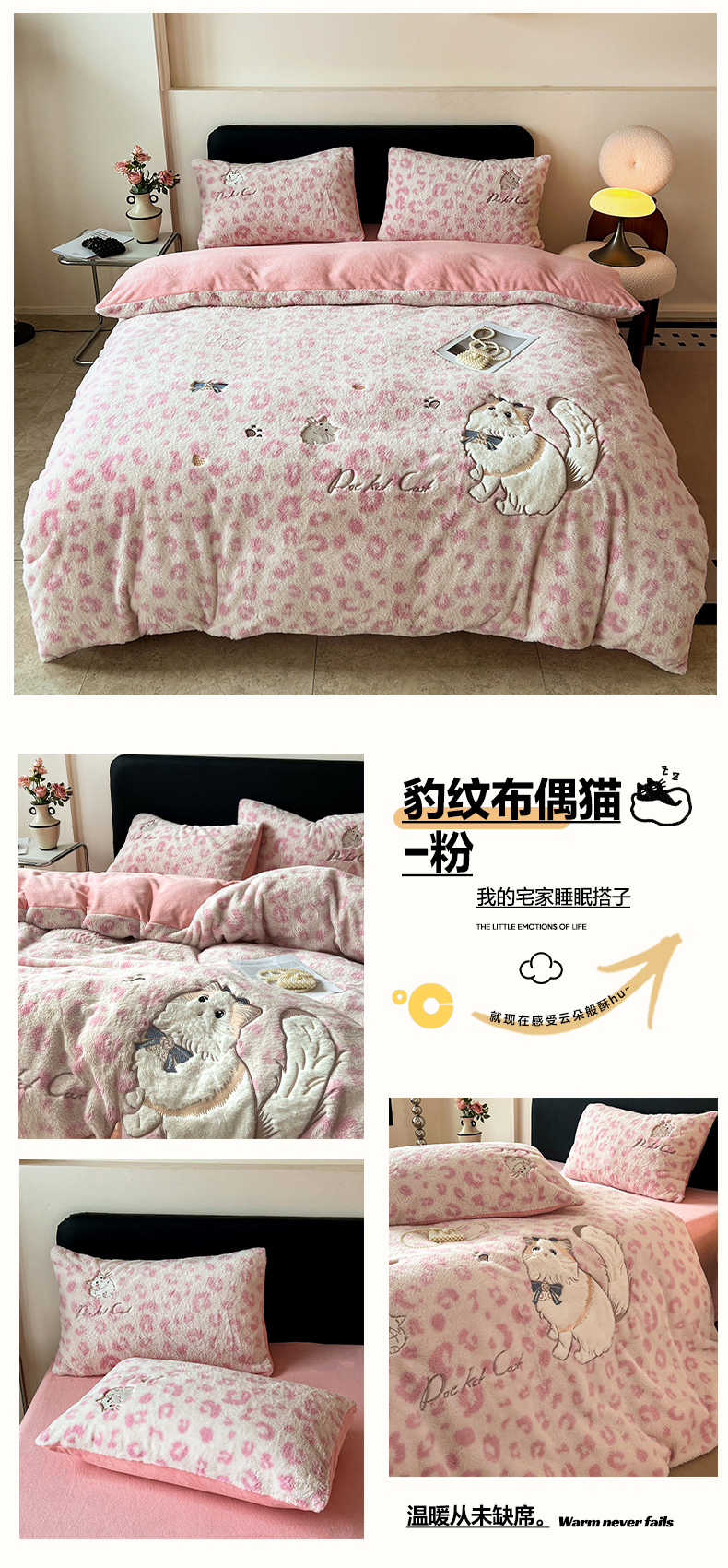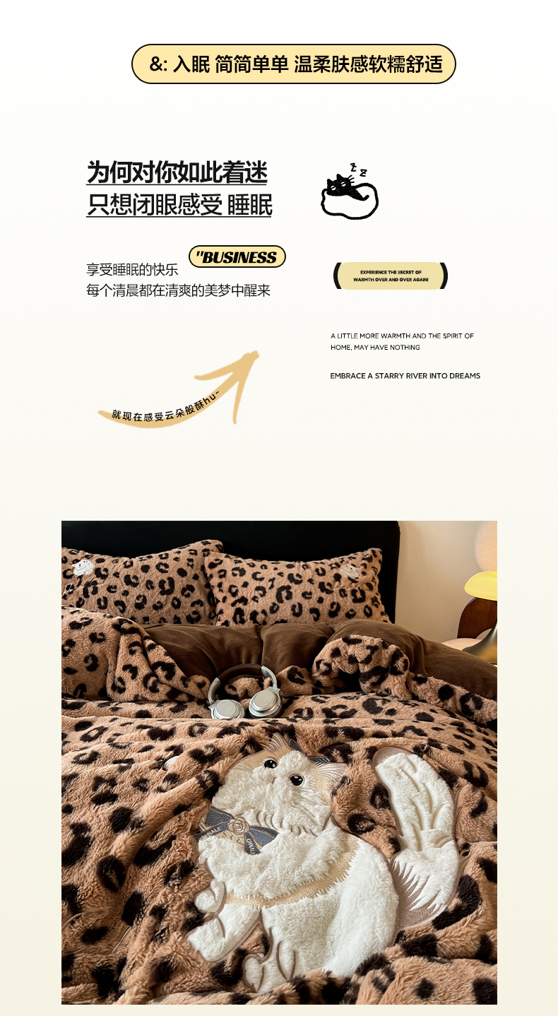 商品名称:梵克保罗 2025秋冬新款兔毛绒豹纹印花绣花款牛奶绒四件套 豹纹布偶猫-浅咖