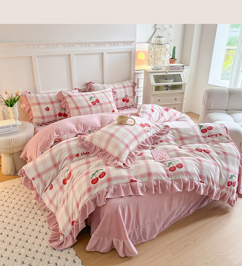 商品名称:温眠家纺 2025新款200g全工艺牛奶绒花边款四件套吊边床单 格子樱桃