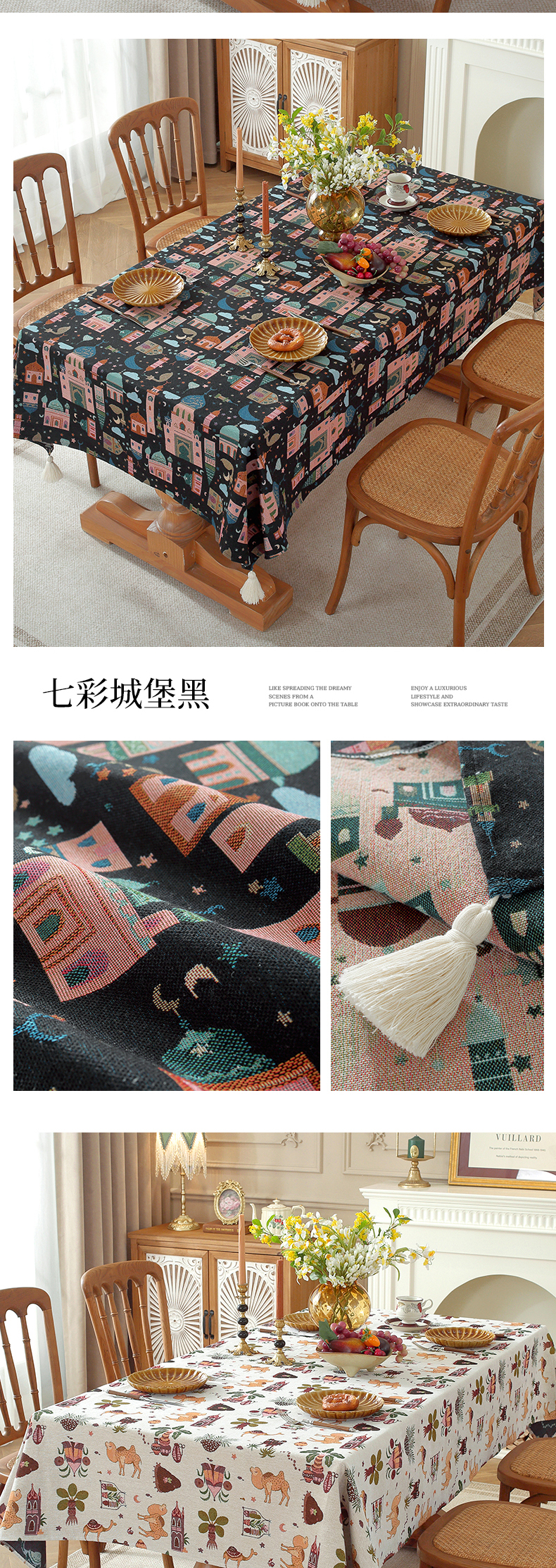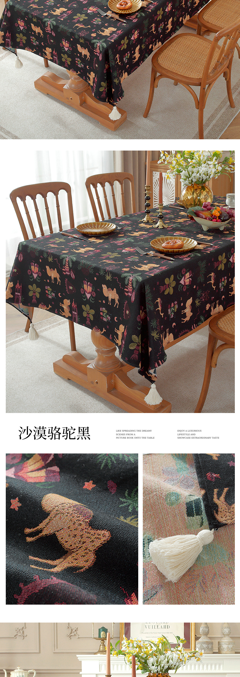 (总)南通大梧纺织 2026新款中东复古骆驼城堡窗花桌布,蓝底窗花星月,七彩城堡白,七彩城堡黑,沙漠骆驼白,沙漠骆驼黑