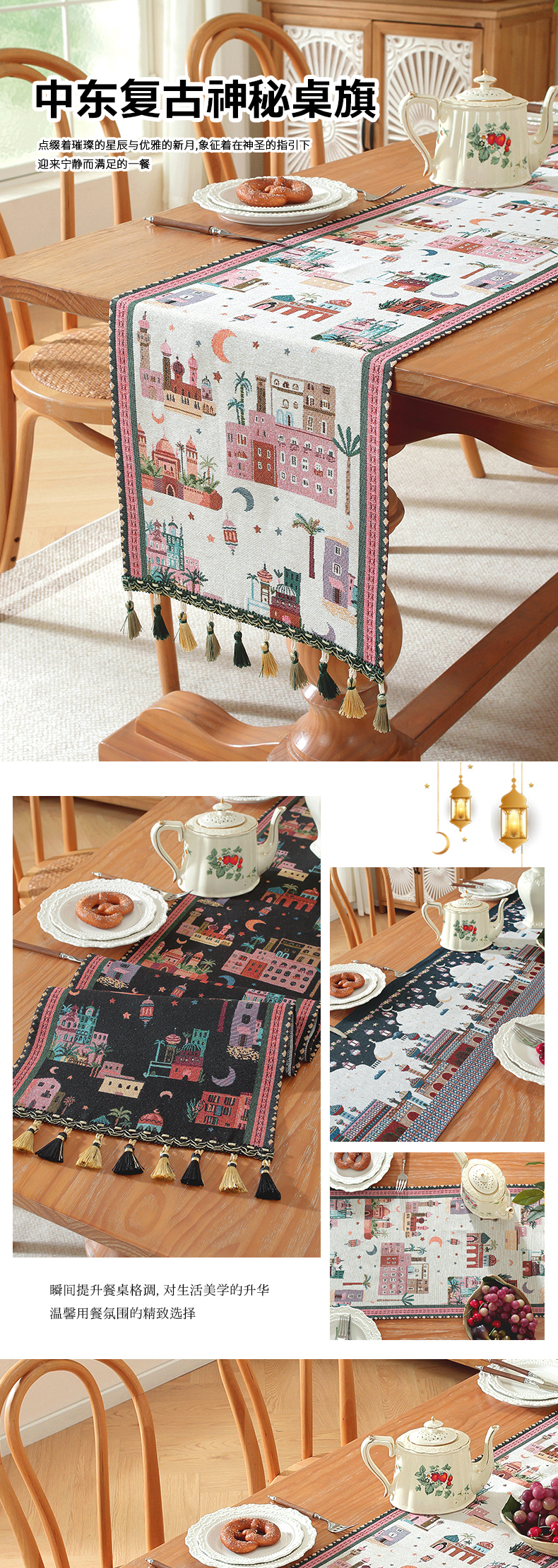 当前位置: 91家纺网 > 商品网购 > 居家布艺 > 餐桌布 > 南通大梧纺织 2026新款中东复古骆驼城堡窗花桌旗 黑底城堡星月 (黑织穗)