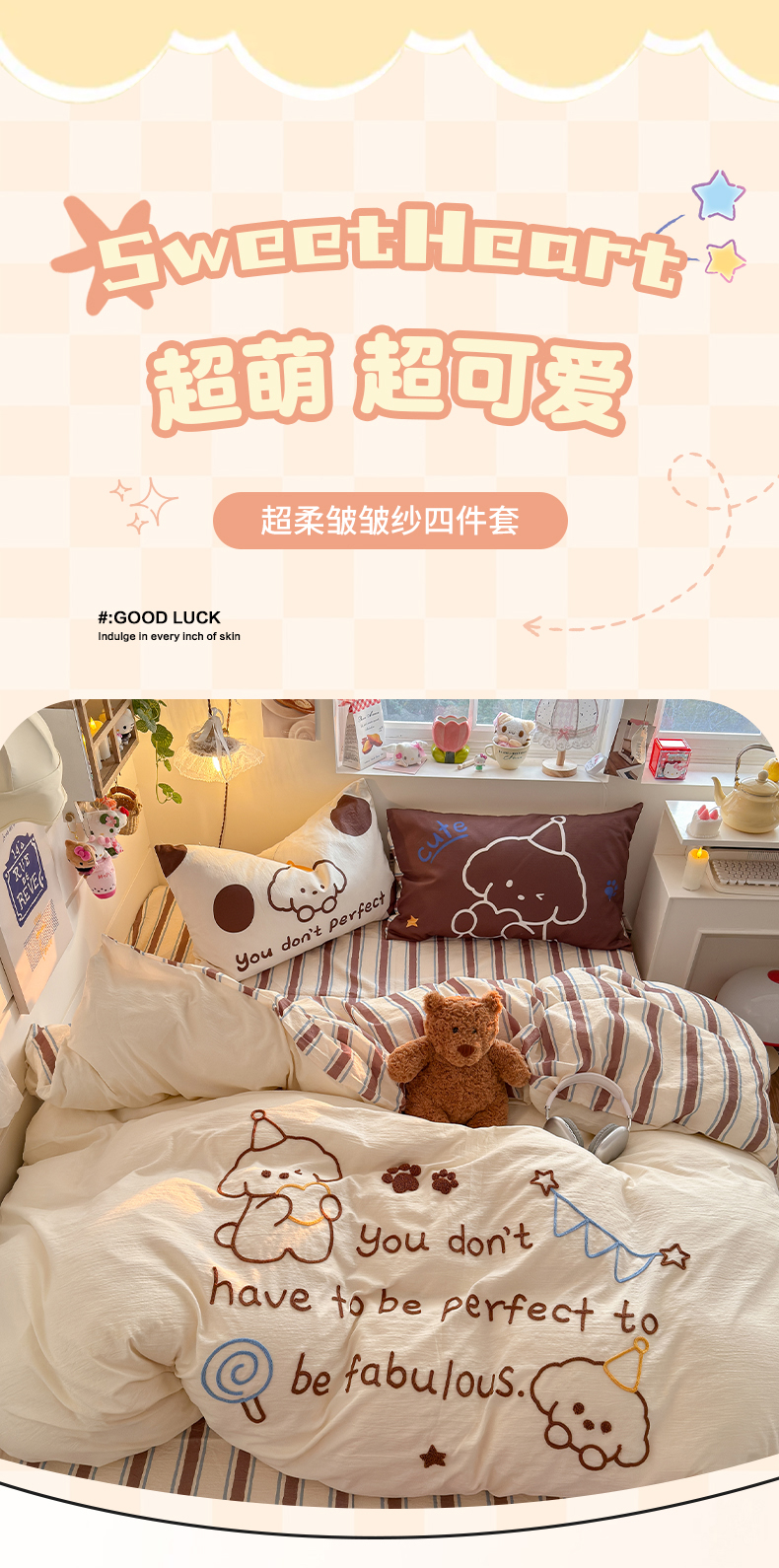 当前位置: 91家纺网 > 商品网购 > 床品套件 > 四件套 > 毛巾绣四件套 > 港岛妹妹 2026新款皱皱纱毛巾绣四件套(有买家秀) 小狗家族