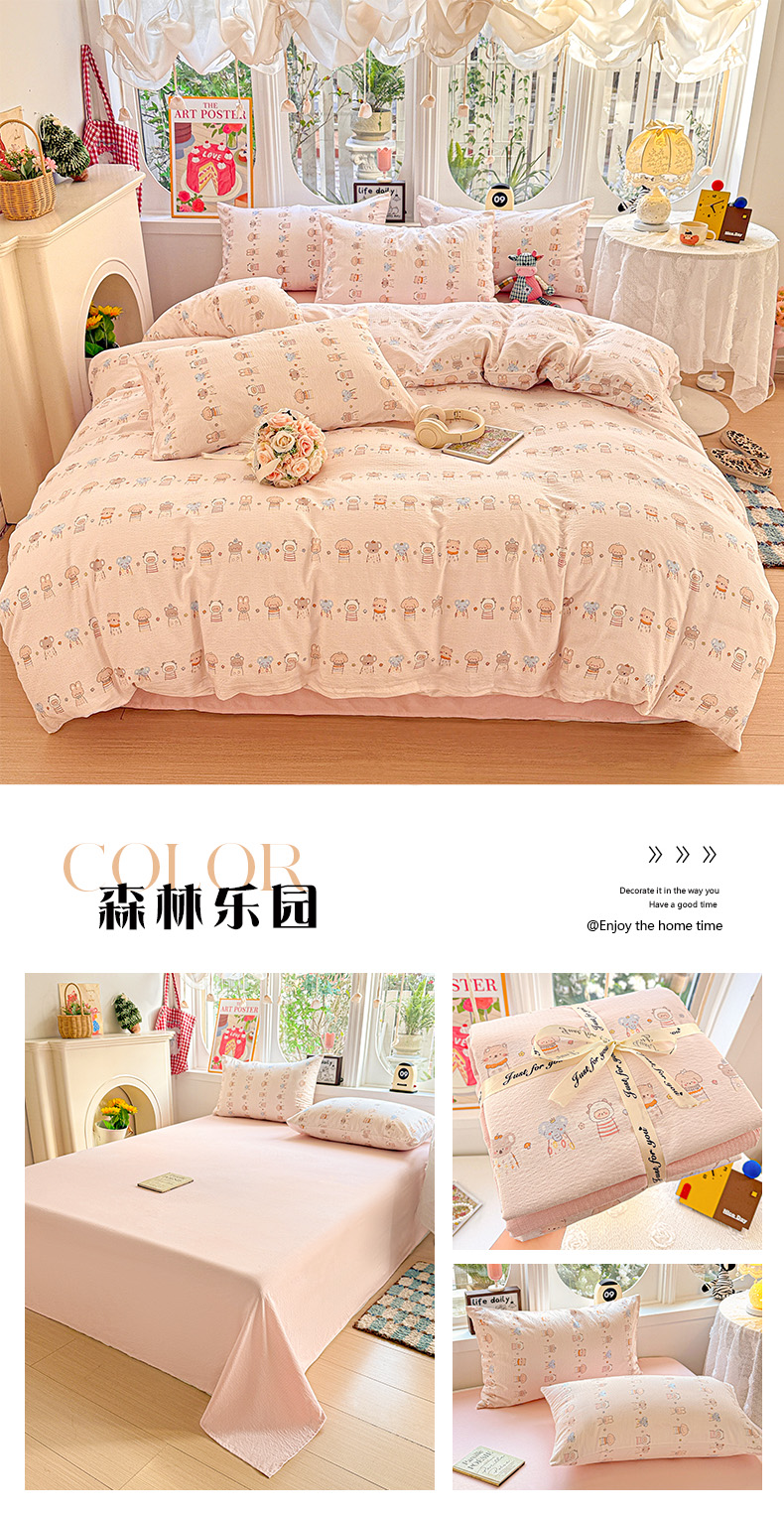 (总)朵朵家纺 2026新款云感木棉皱皱纱双层纱印花四件套,星星人,安琪拉,豹纹KT,北半球,波点草莓,春野集,蛋糕喵,繁星春水,好朋友,来财梦,兰溪,萌宠派对,芊芊花语,森林乐园,森林密语,甜茶,小新e族,小樱桃,组合图