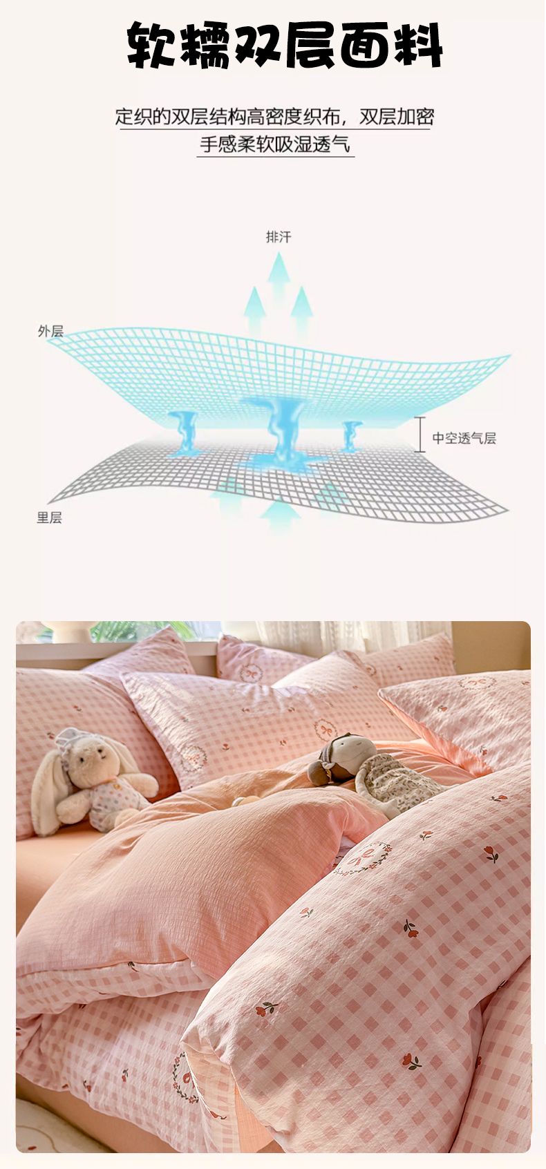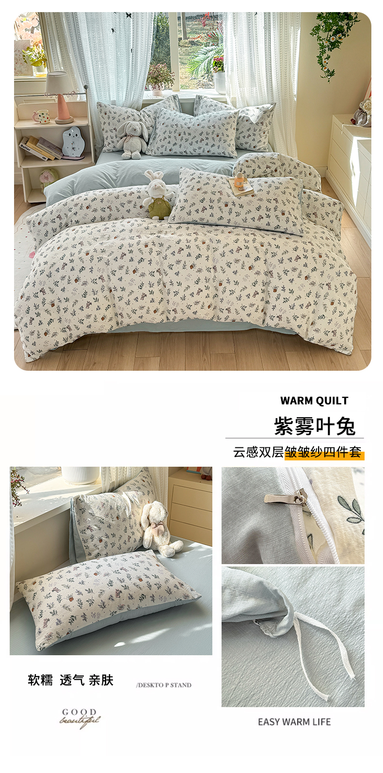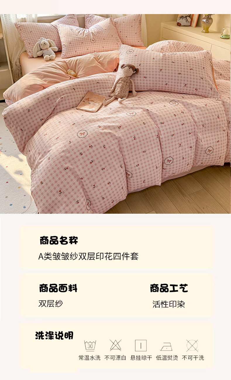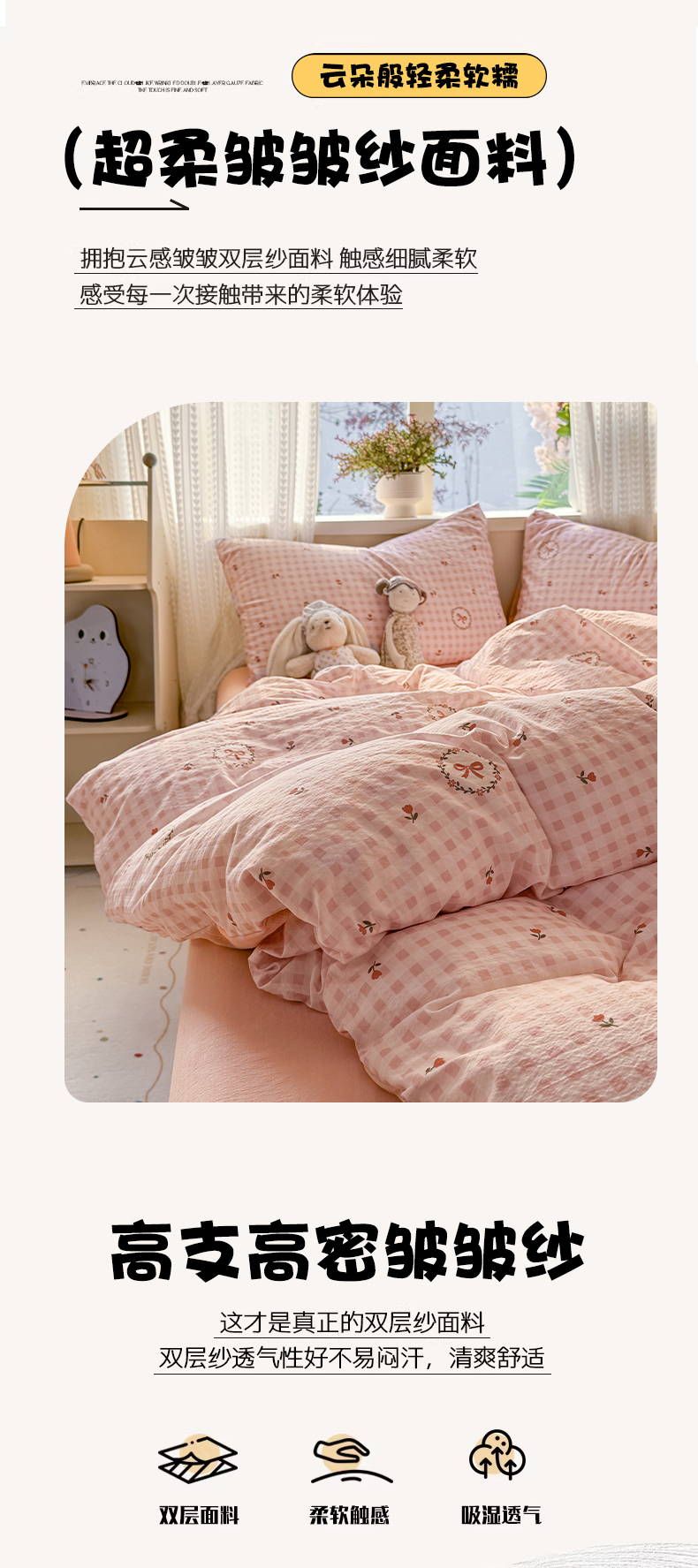 当前位置: 91家纺网 > 商品网购 > 床品套件 > 四件套 > 双层纱四件套 > 丽美人家纺 2026新款A类皱皱纱双层印花四件套 格子蝴蝶结