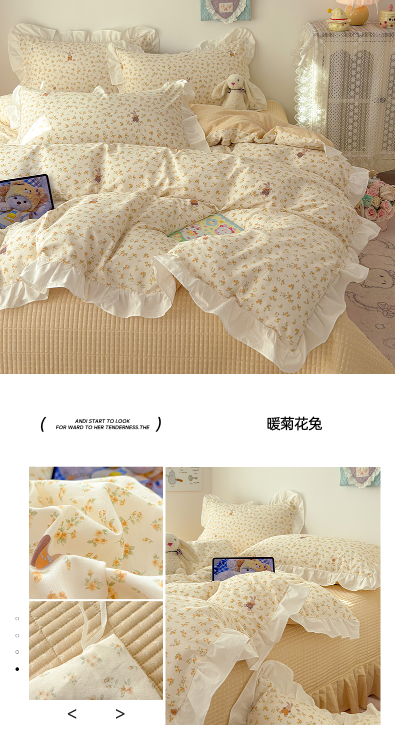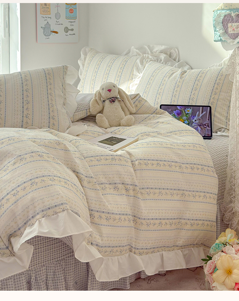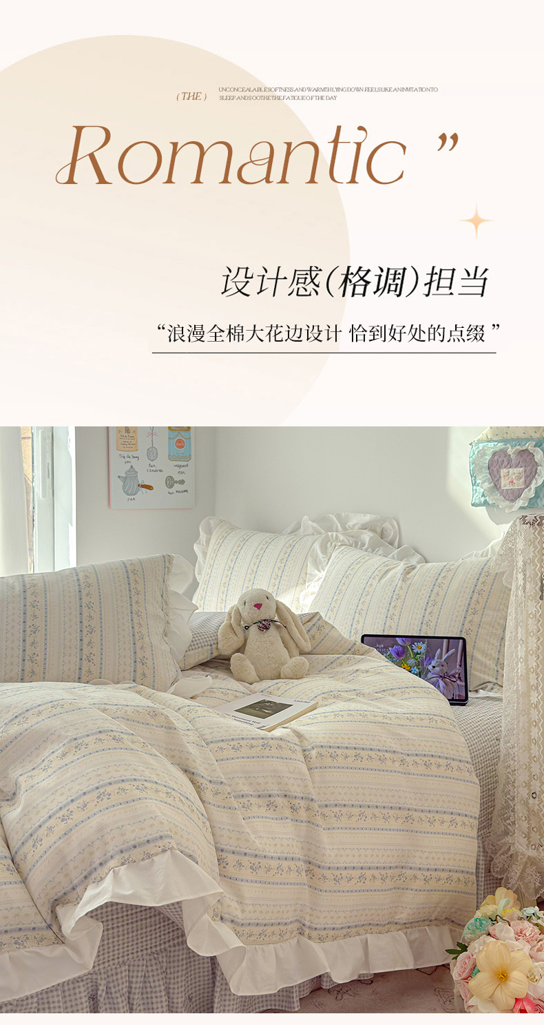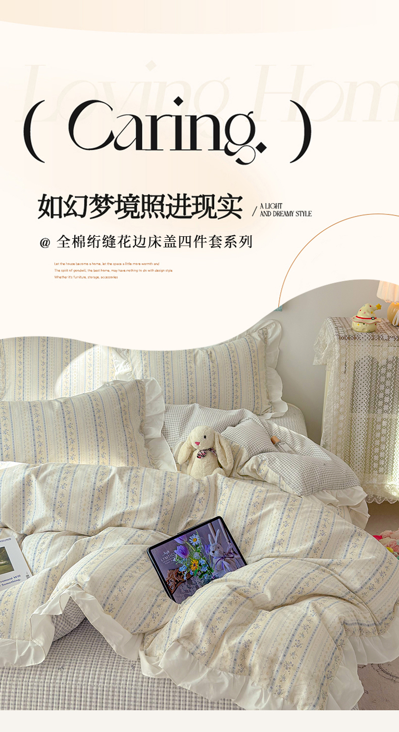 当前位置: 91家纺网 > 商品网购 > 床品套件 > 四件套 > 全棉普通四件套 > 女子家纺 2026新款全棉纯棉绗缝花边床盖四件套 素条花-蓝