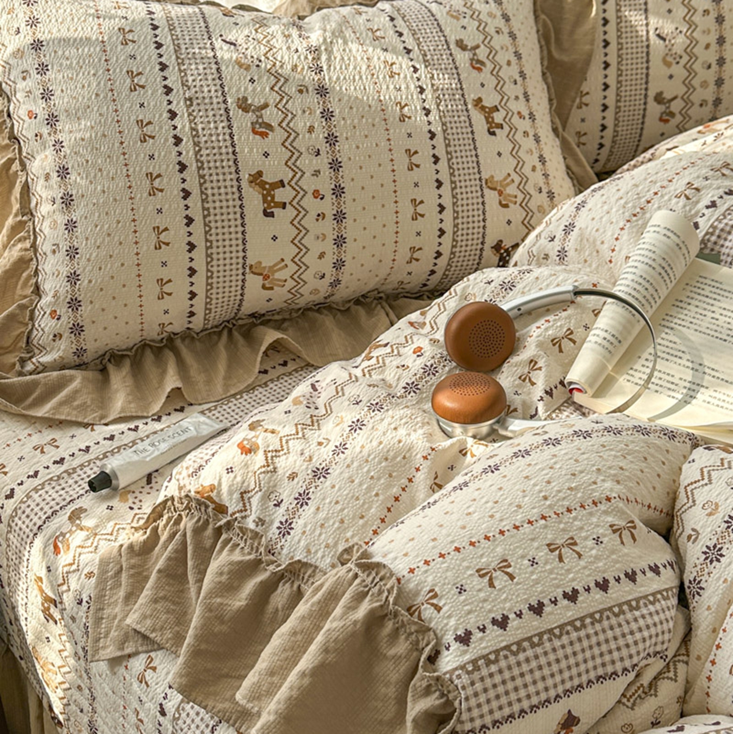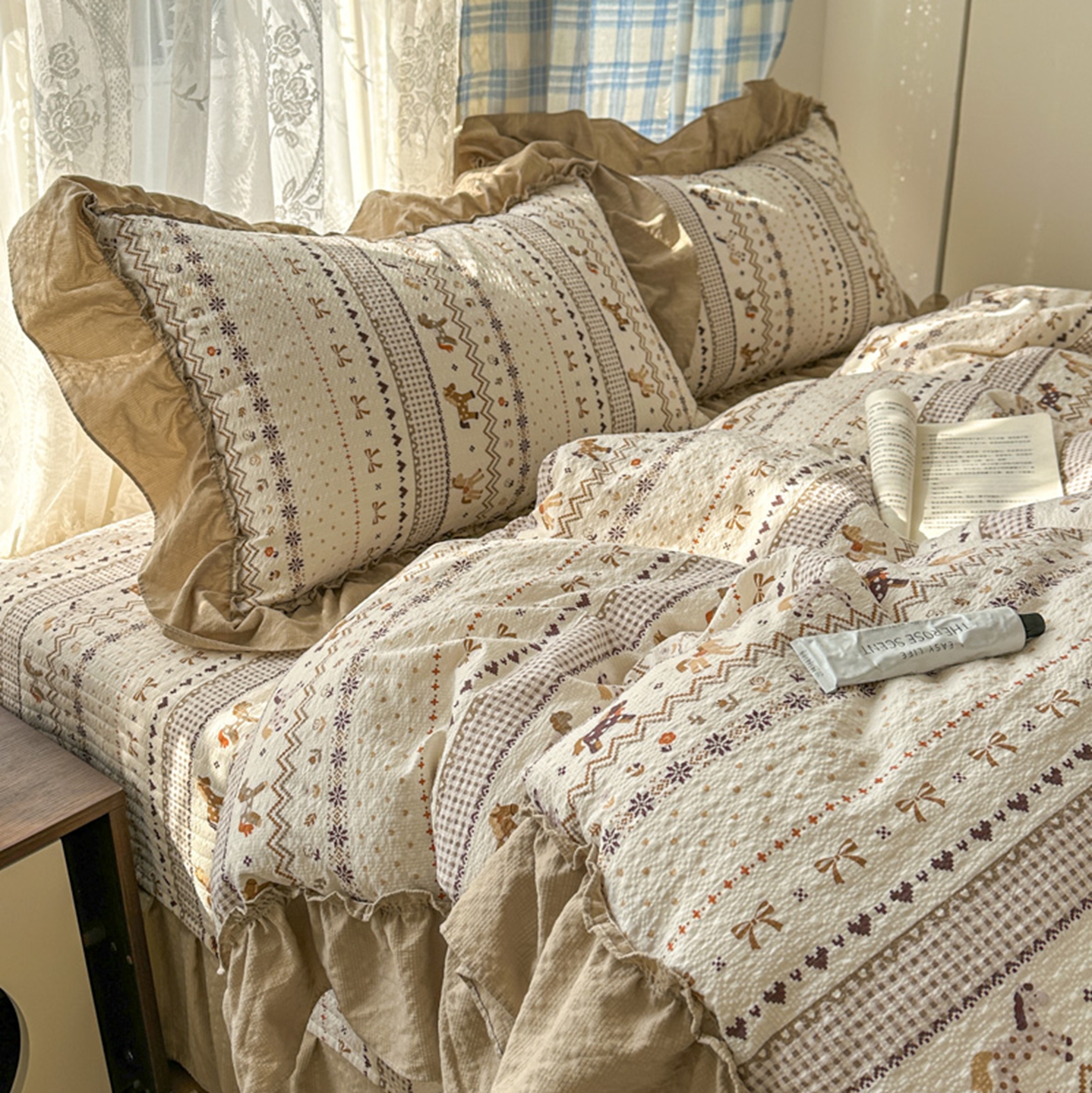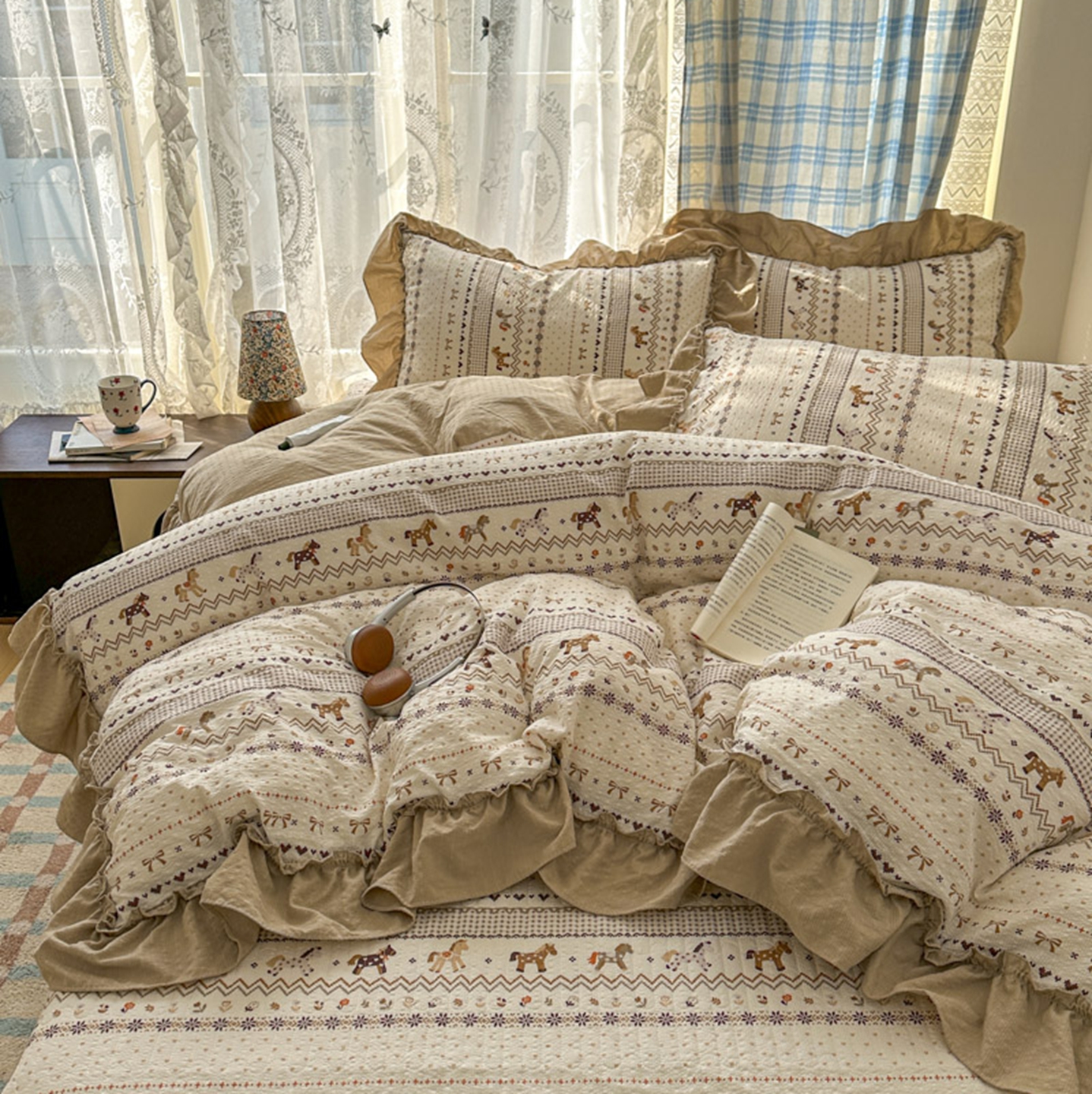 (总)欧尚 2026新款花边床盖四件套,春和,花束,花野,灰樱桃,咖爱心,咖豹纹,咖啡小猫,梨花落,绿爱心,梦境,木马,奶油波点,暖橘枝,暖心,人间草木,田园兔,小女孩,星愿,摇摇马,紫爱心,紫豹纹,紫苏