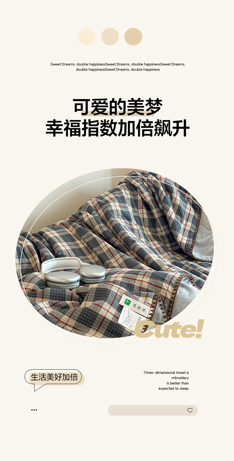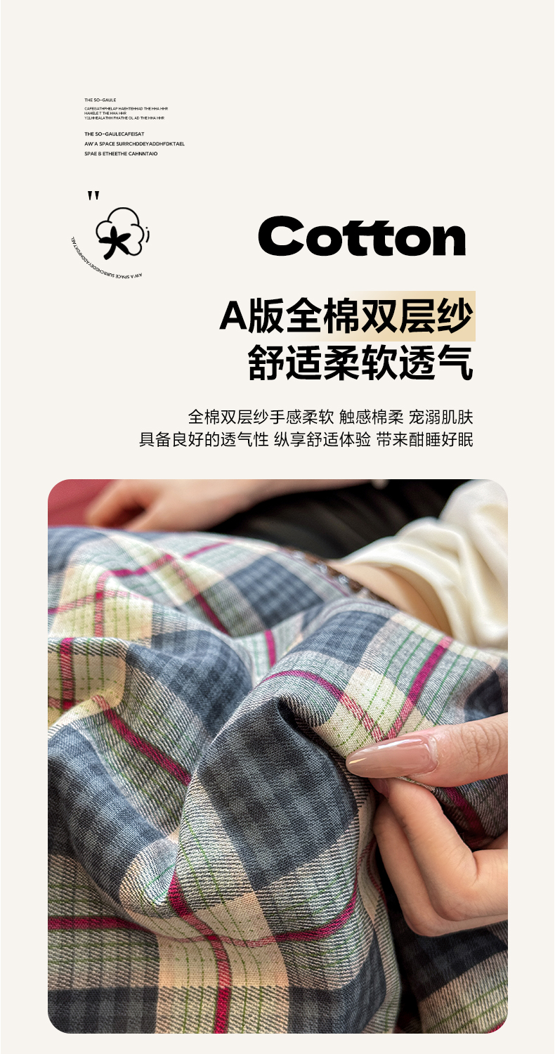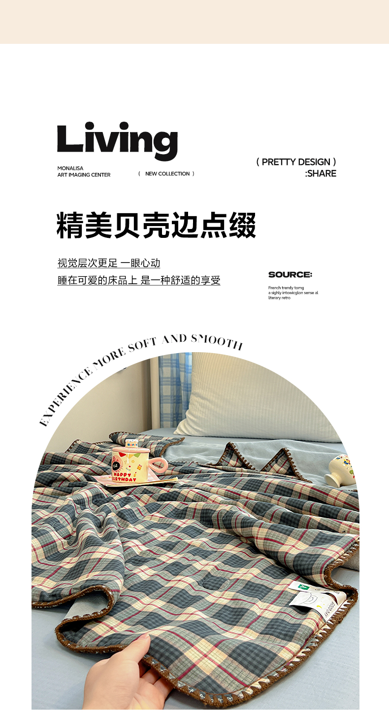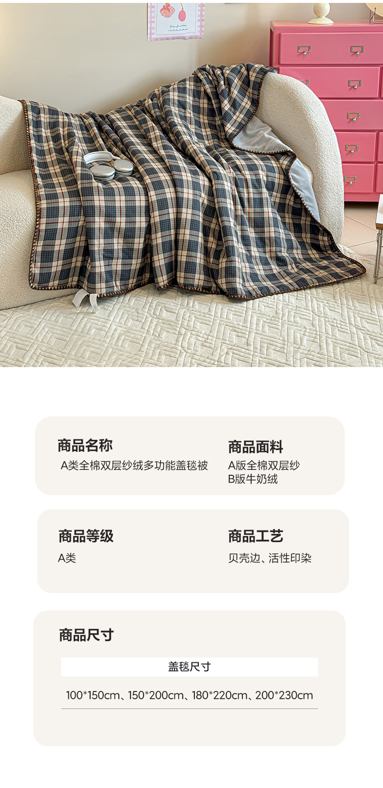 商品名称:妮可 2026新款A类三层夹棉全棉双层纱绒多功能盖毯被 格子画
