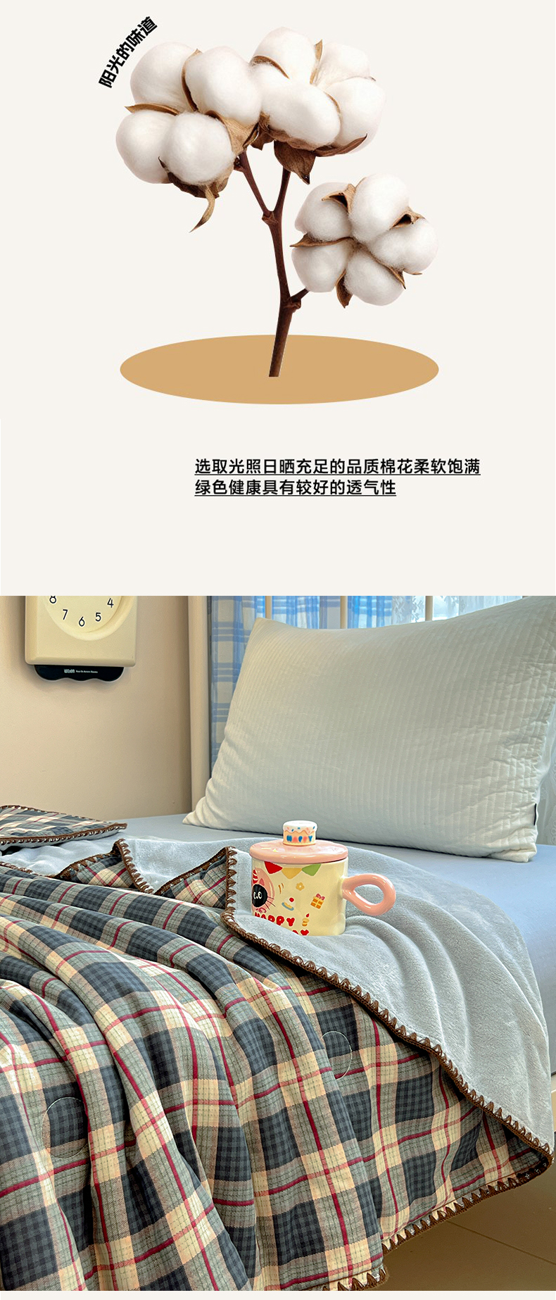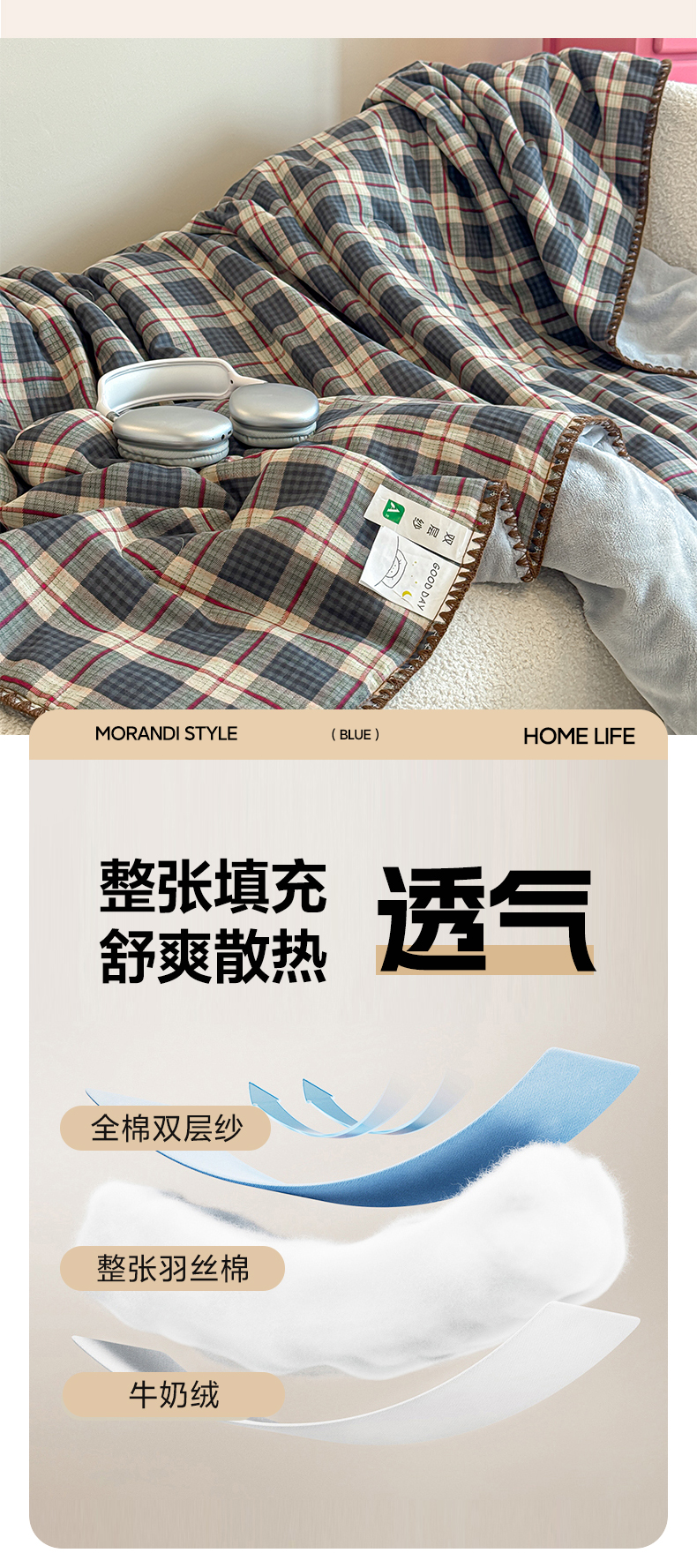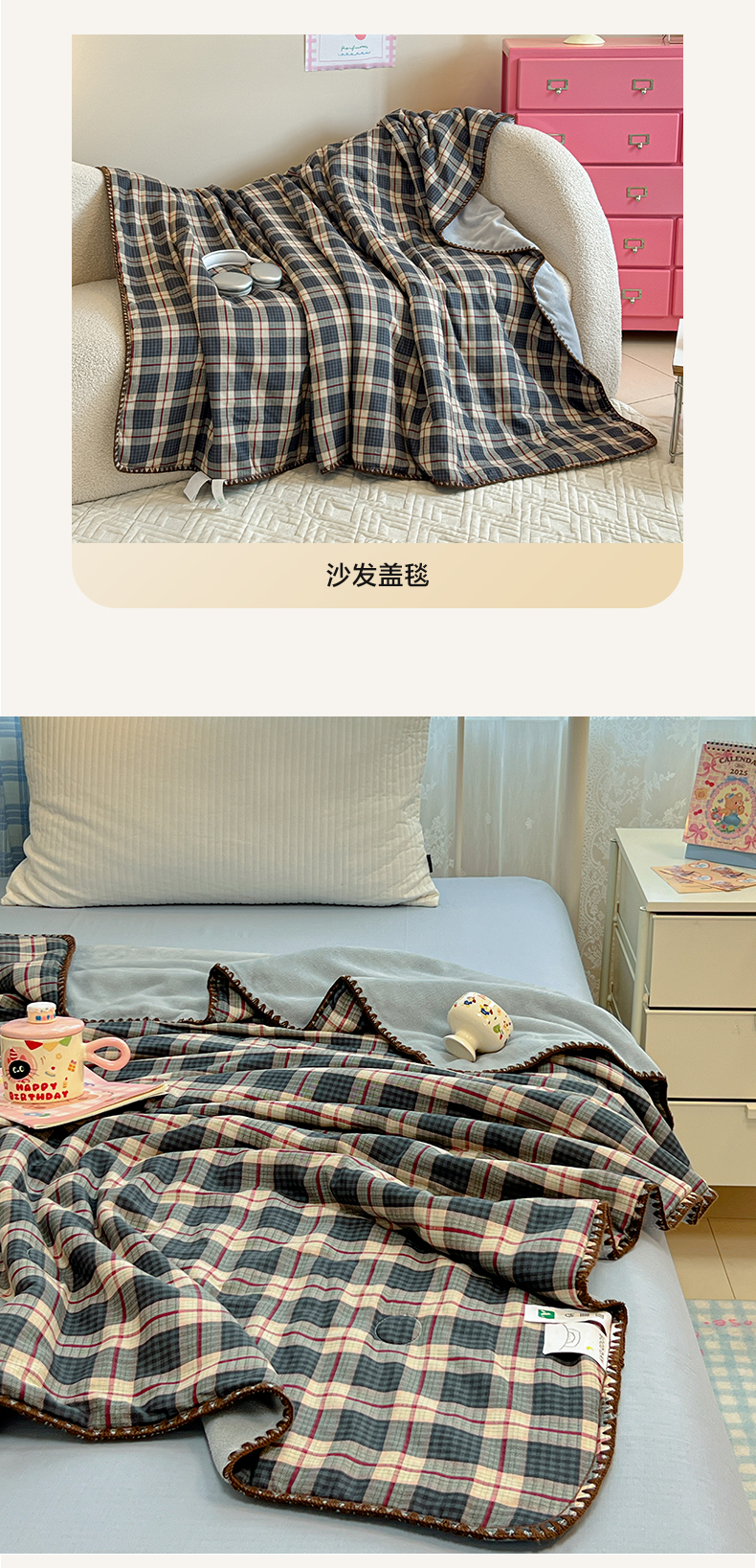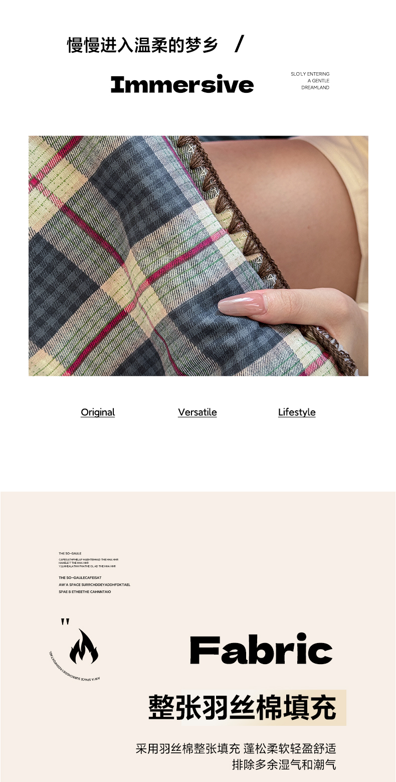 商品名称:妮可 2026新款A类三层夹棉全棉双层纱绒多功能盖毯被 格子画