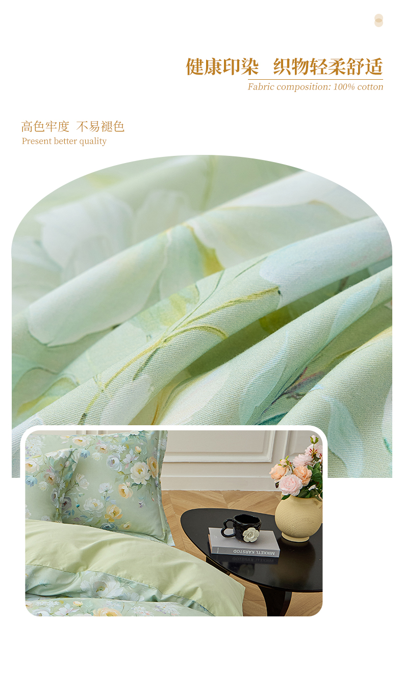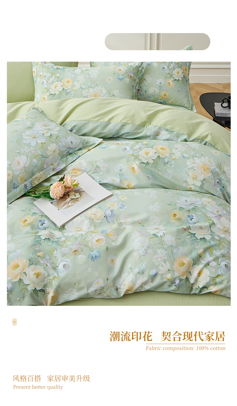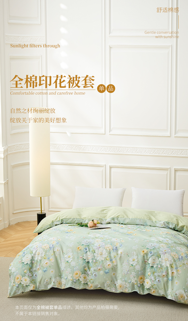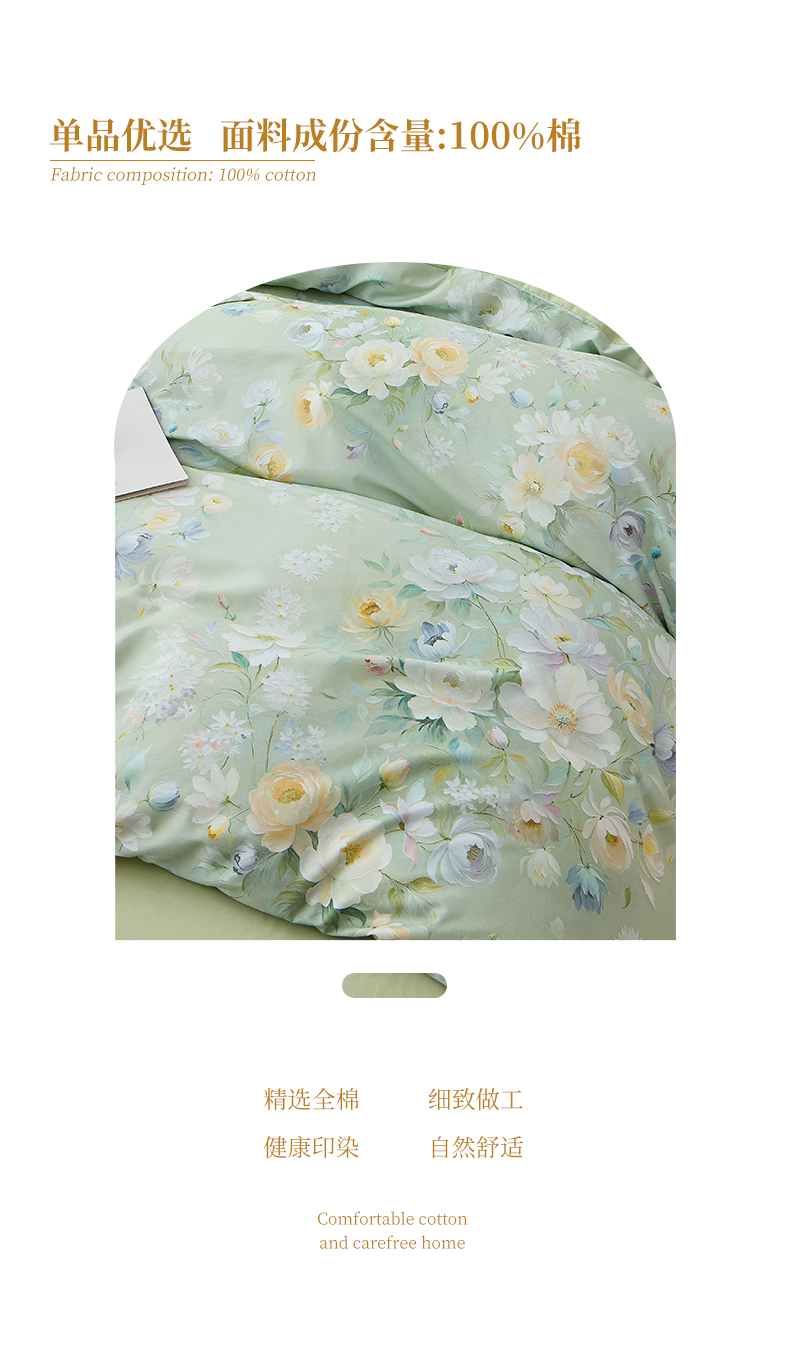 商品名称:元元家居(元元被业) 2026新款全棉13372套件及单品【印花款】-单被套 花漾绿