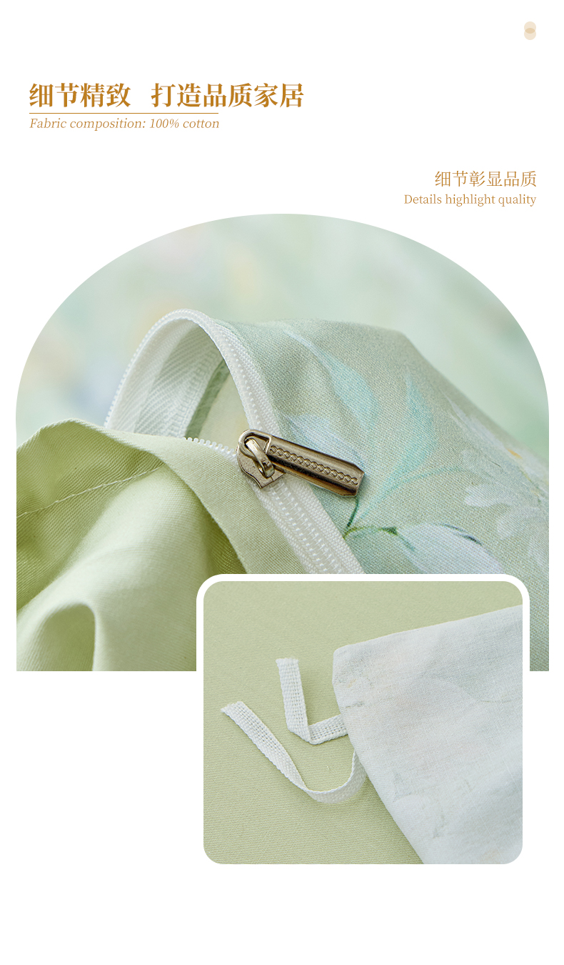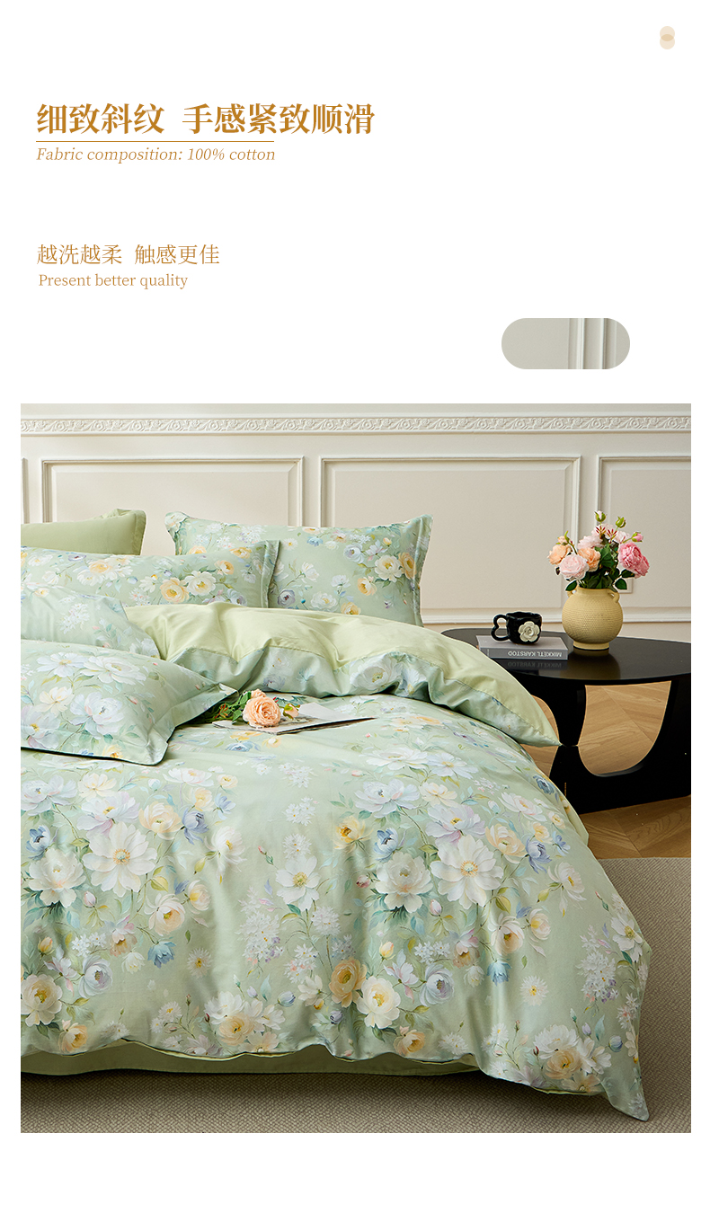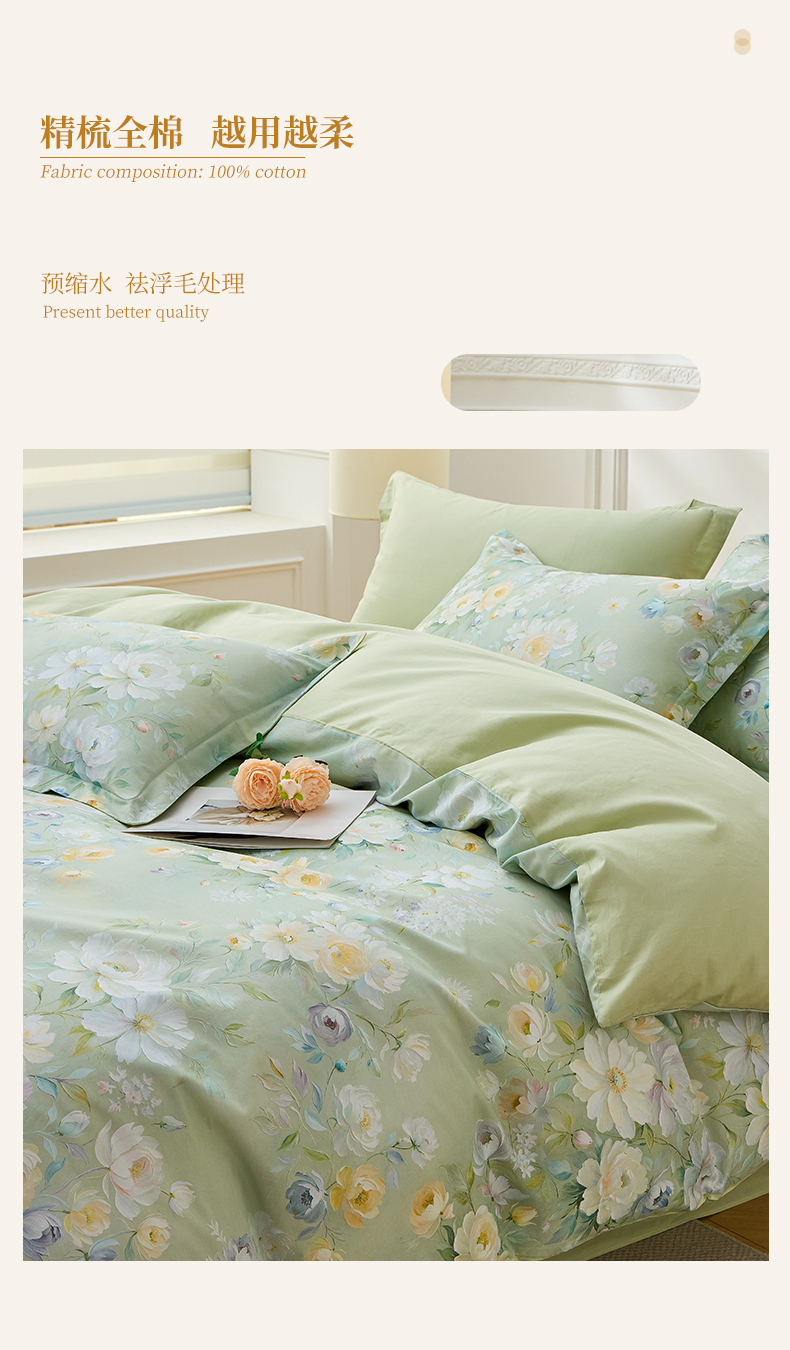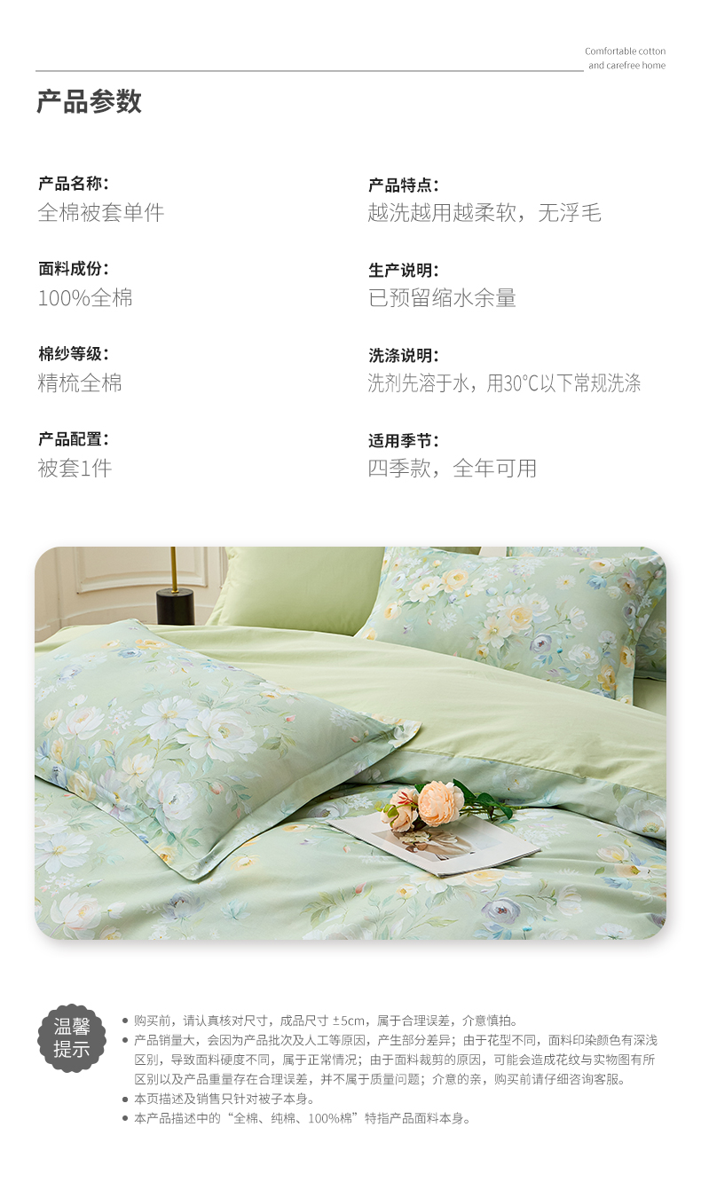 商品名称:元元家居(元元被业) 2026新款全棉13372套件及单品【印花款】-单被套 花漾绿