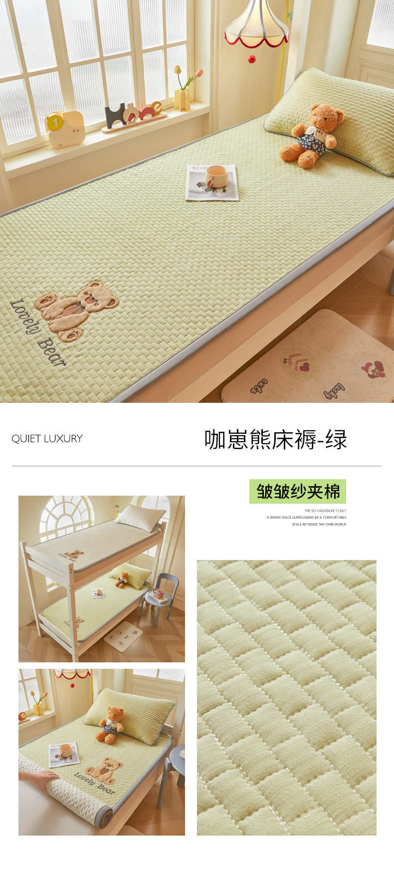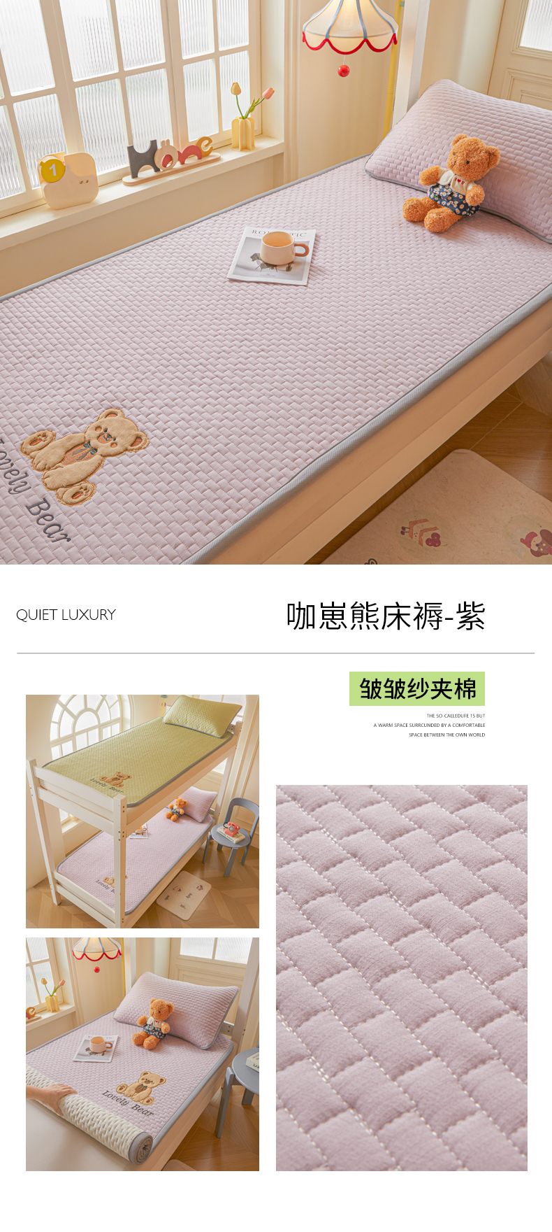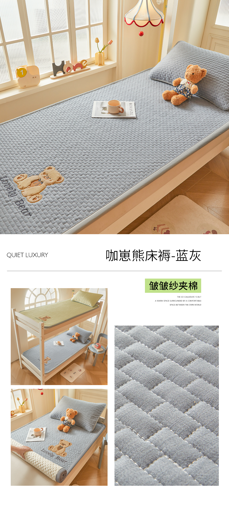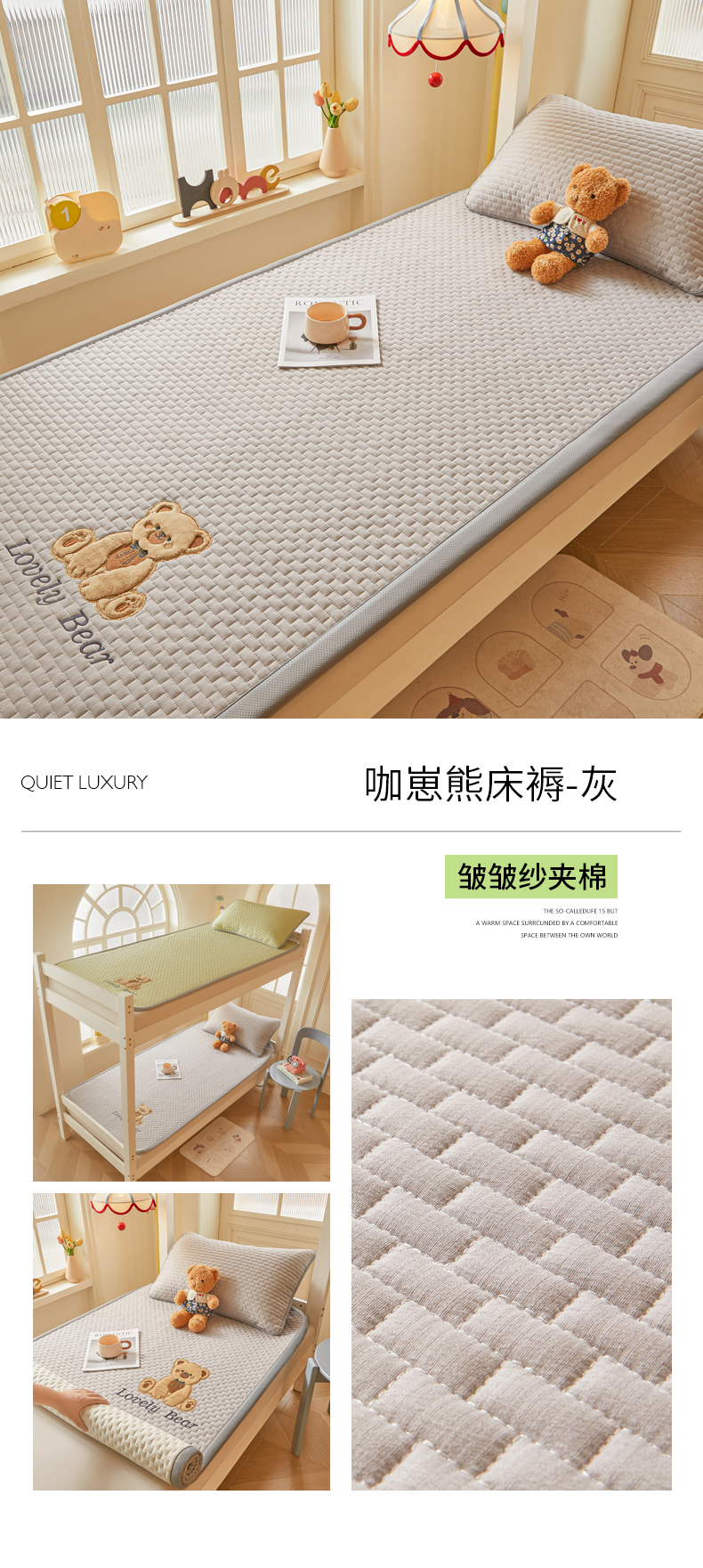 (总)爱思凯家纺 2026新款皱皱纱-夹棉咖崽熊床褥-成人款,皱皱纱夹棉-咖崽熊床褥-灰,皱皱纱夹棉-咖崽熊床褥-茶色,皱皱纱夹棉-咖崽熊床褥-粉,皱皱纱夹棉-咖崽熊床褥-蓝灰,皱皱纱夹棉-咖崽熊床褥-绿,皱皱纱夹棉-咖崽熊床褥-浅米,皱皱纱夹棉-咖崽熊床褥-紫
