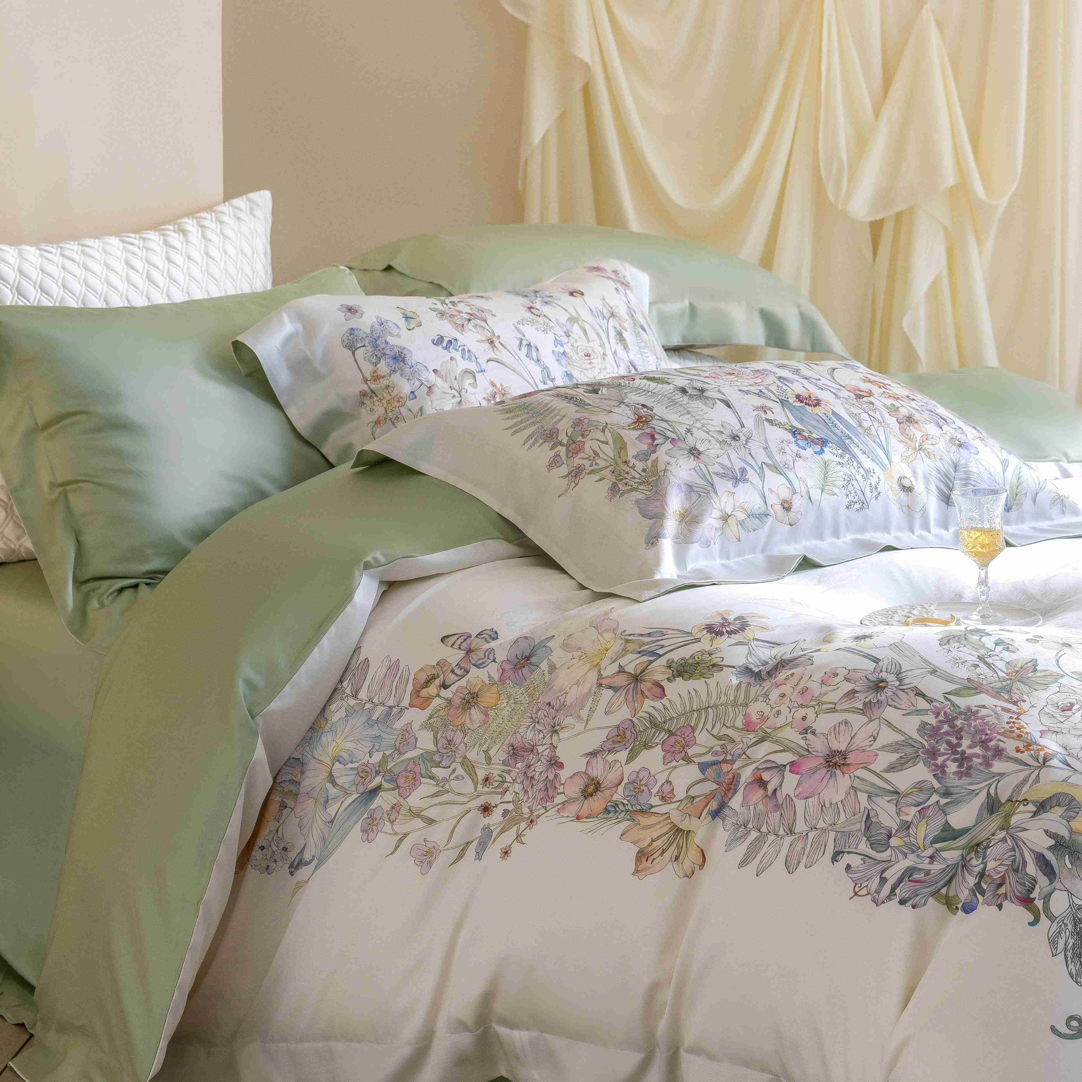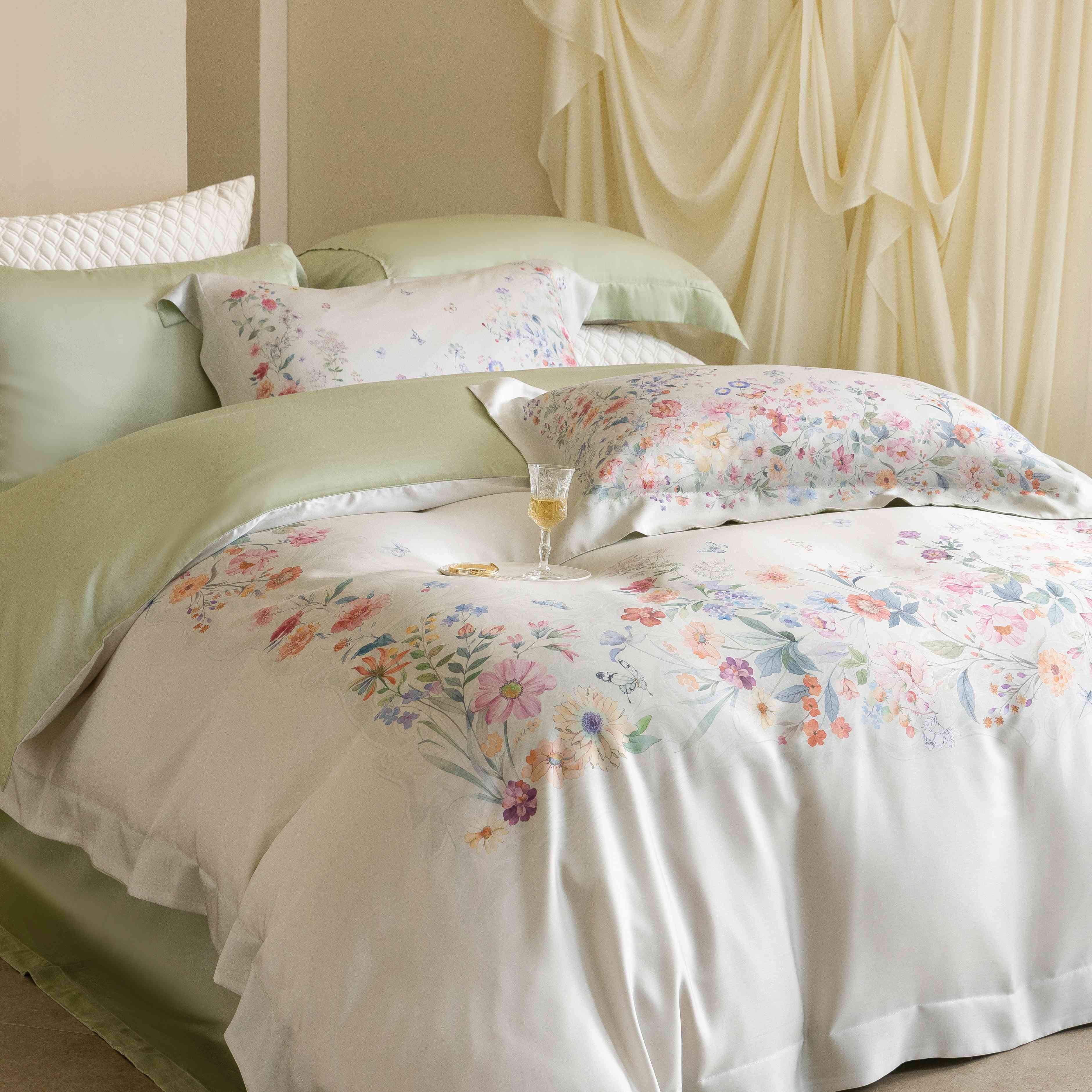 (总)佳汐蓝家纺 2026春夏新款棉麻皱皱双层纱四件套-栀子茉莉 控价:卷后不低于398,栀子茉莉-绿色床单,栀子茉莉-麻色床单