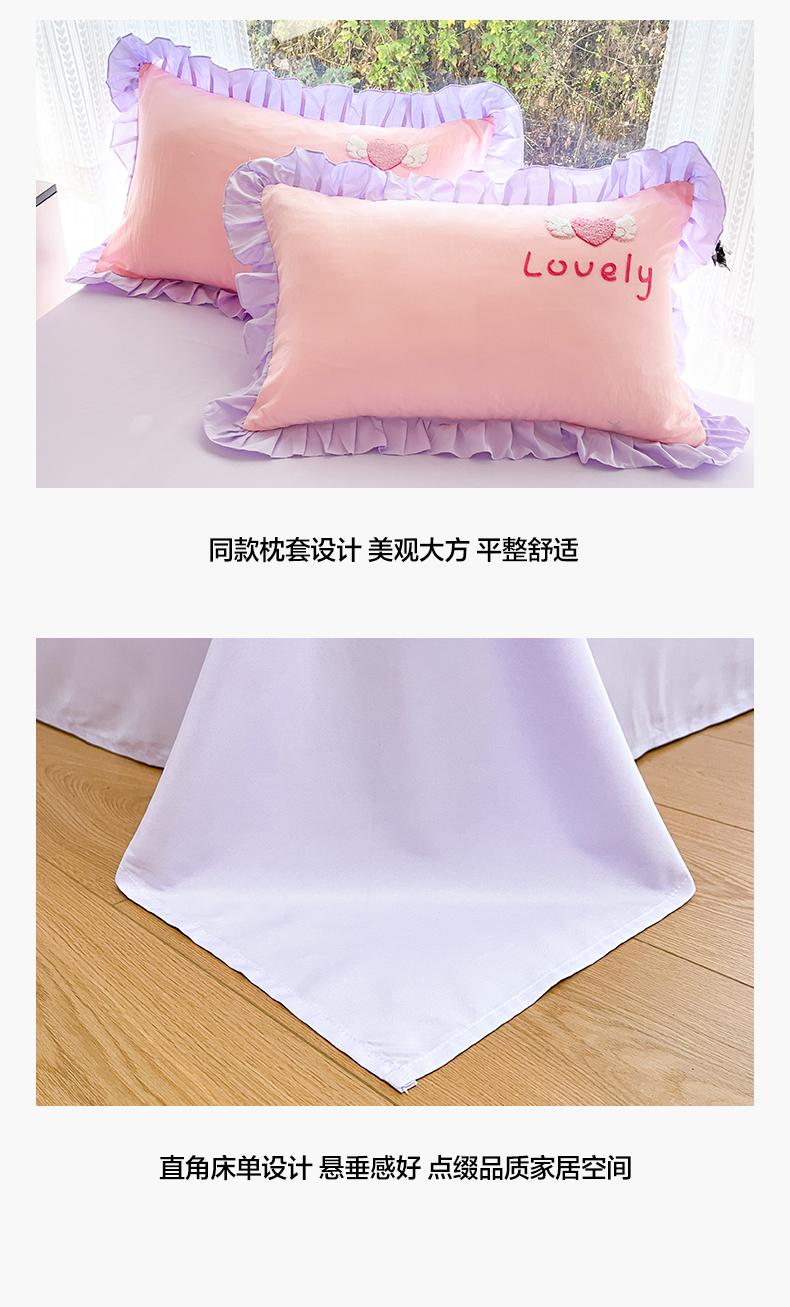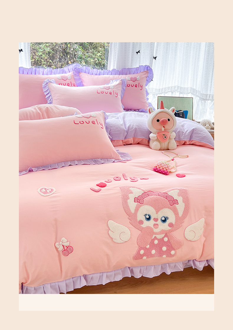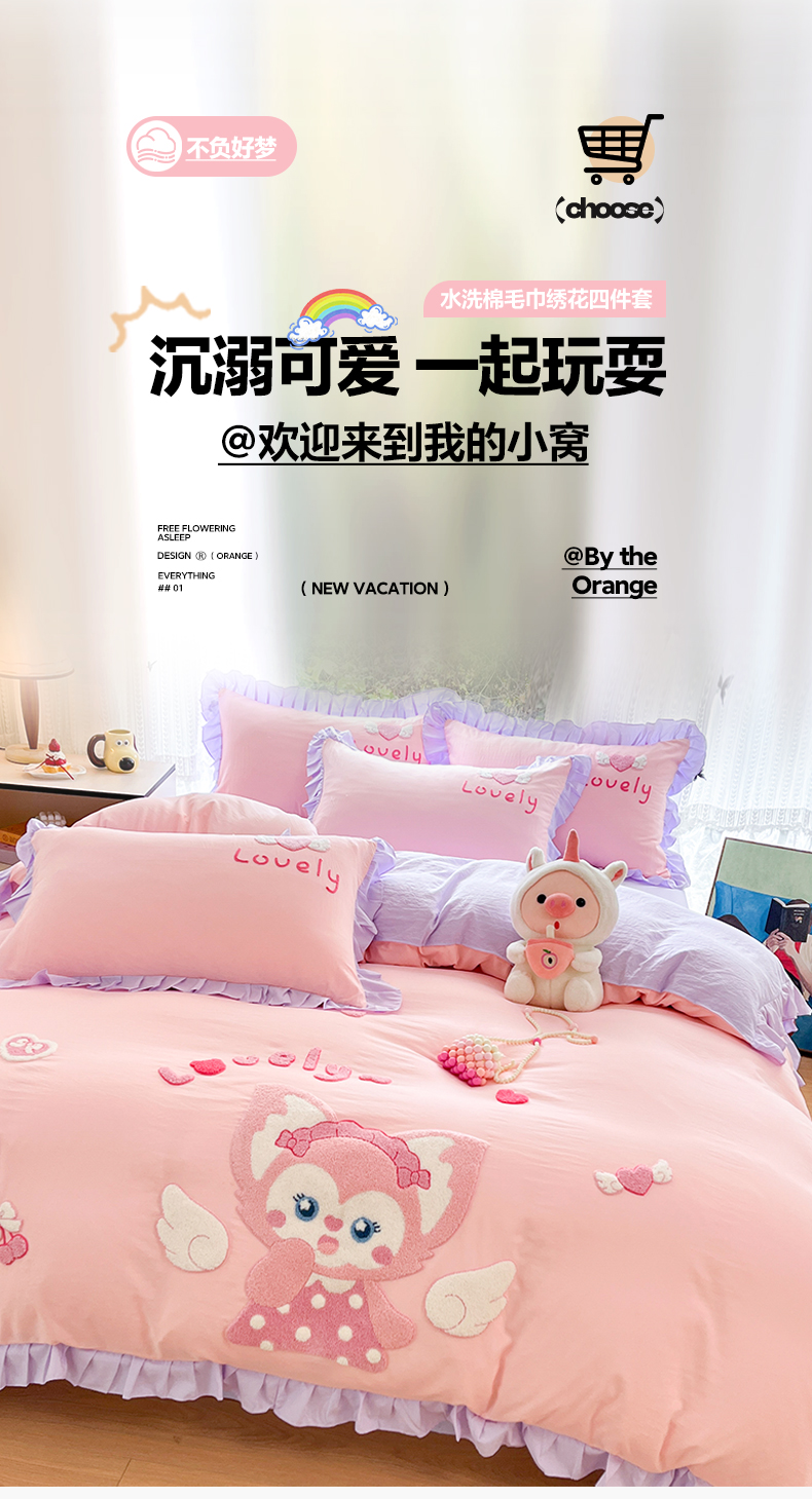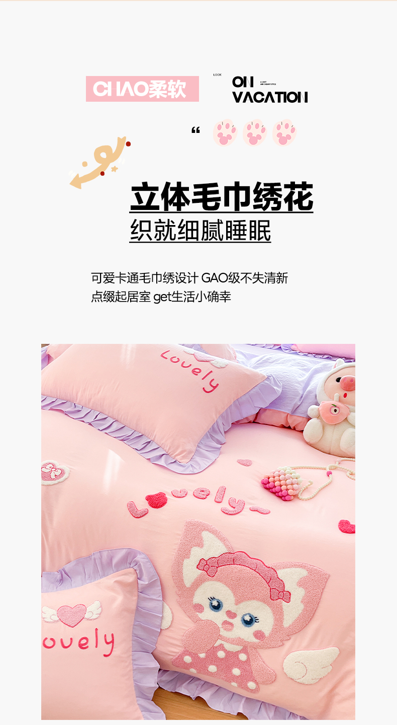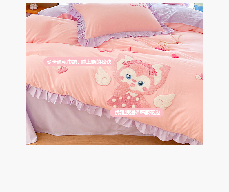 当前位置: 91家纺网 > 商品网购 > 床品套件 > 四件套 > 水洗棉四件套 > 泉欣家纺 2026新款网红可爱卡通 公主风毛巾绣花水洗棉四件套(专版花型) 风铃团团 粉紫