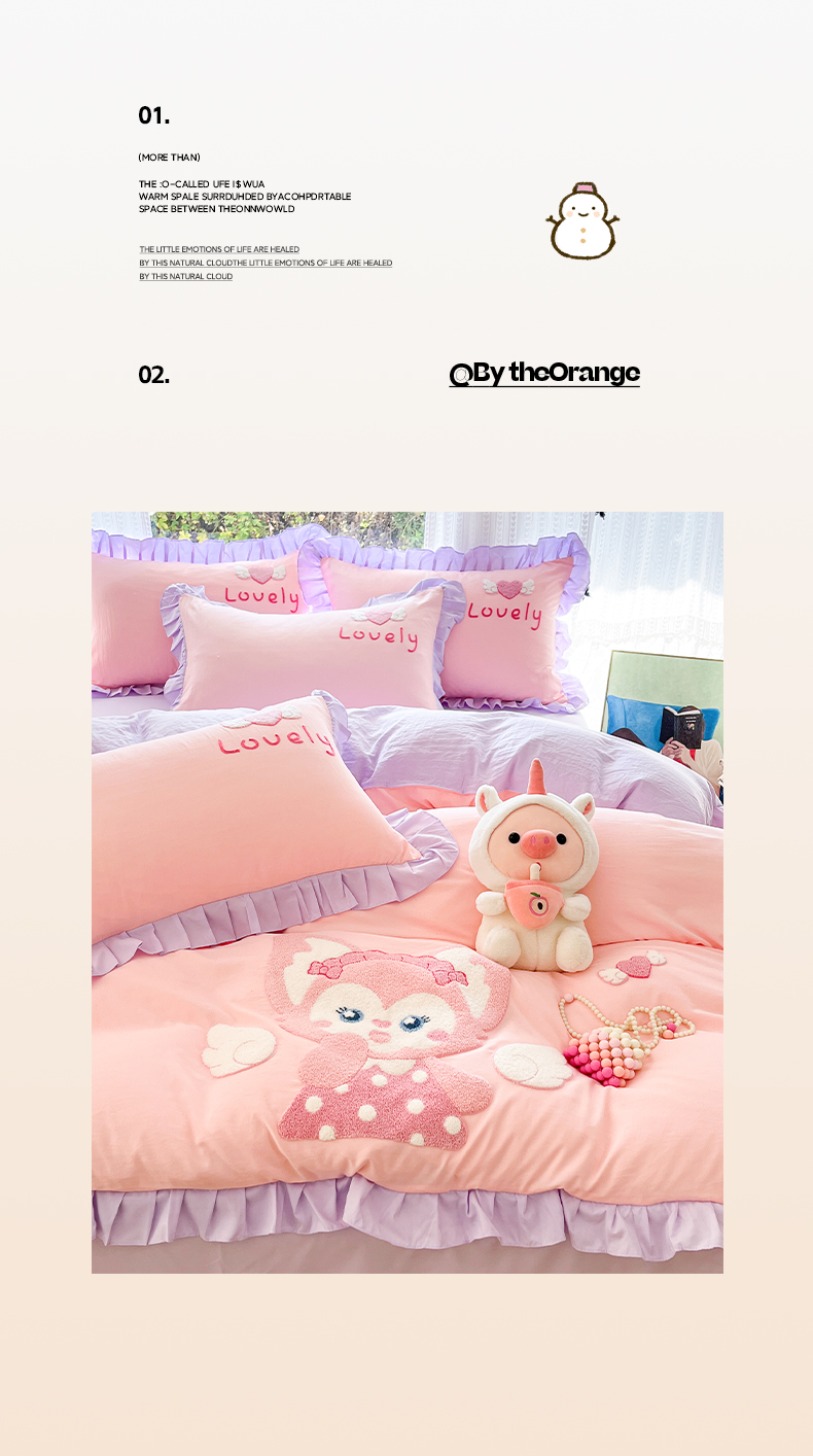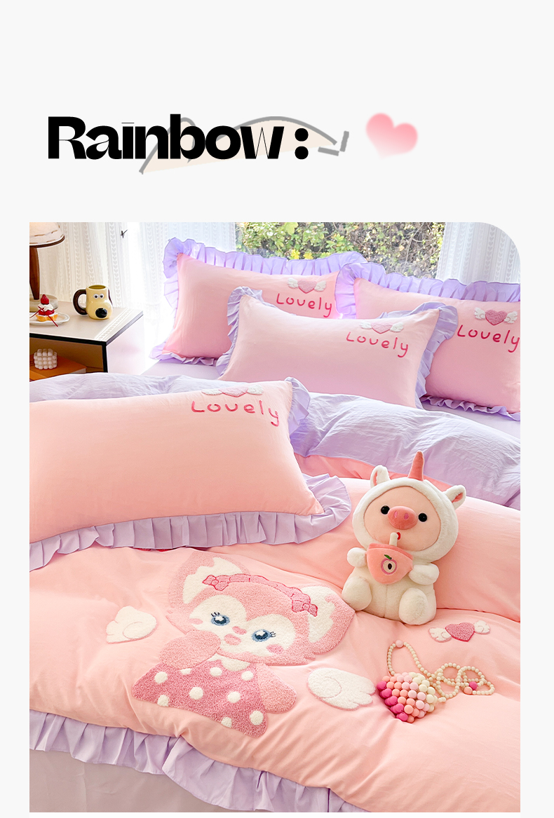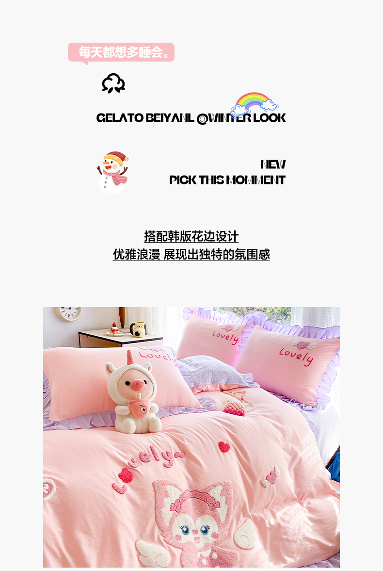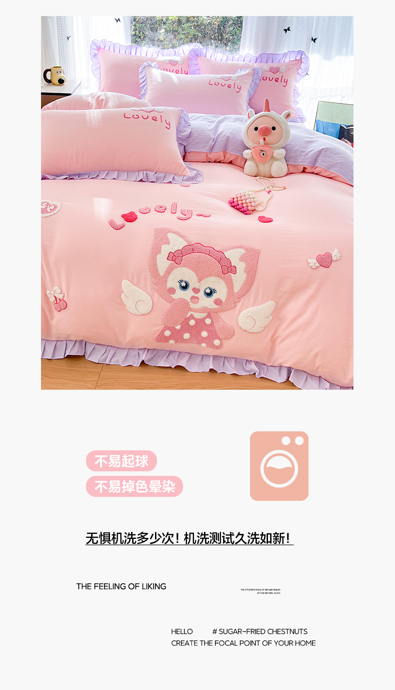 当前位置: 91家纺网 > 商品网购 > 床品套件 > 四件套 > 水洗棉四件套 > 泉欣家纺 2026新款网红可爱卡通 公主风毛巾绣花水洗棉四件套(专版花型) 风铃团团 粉紫