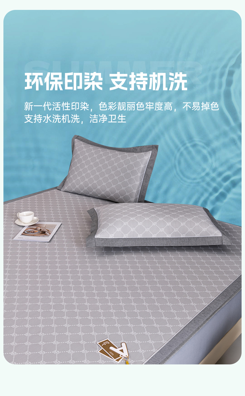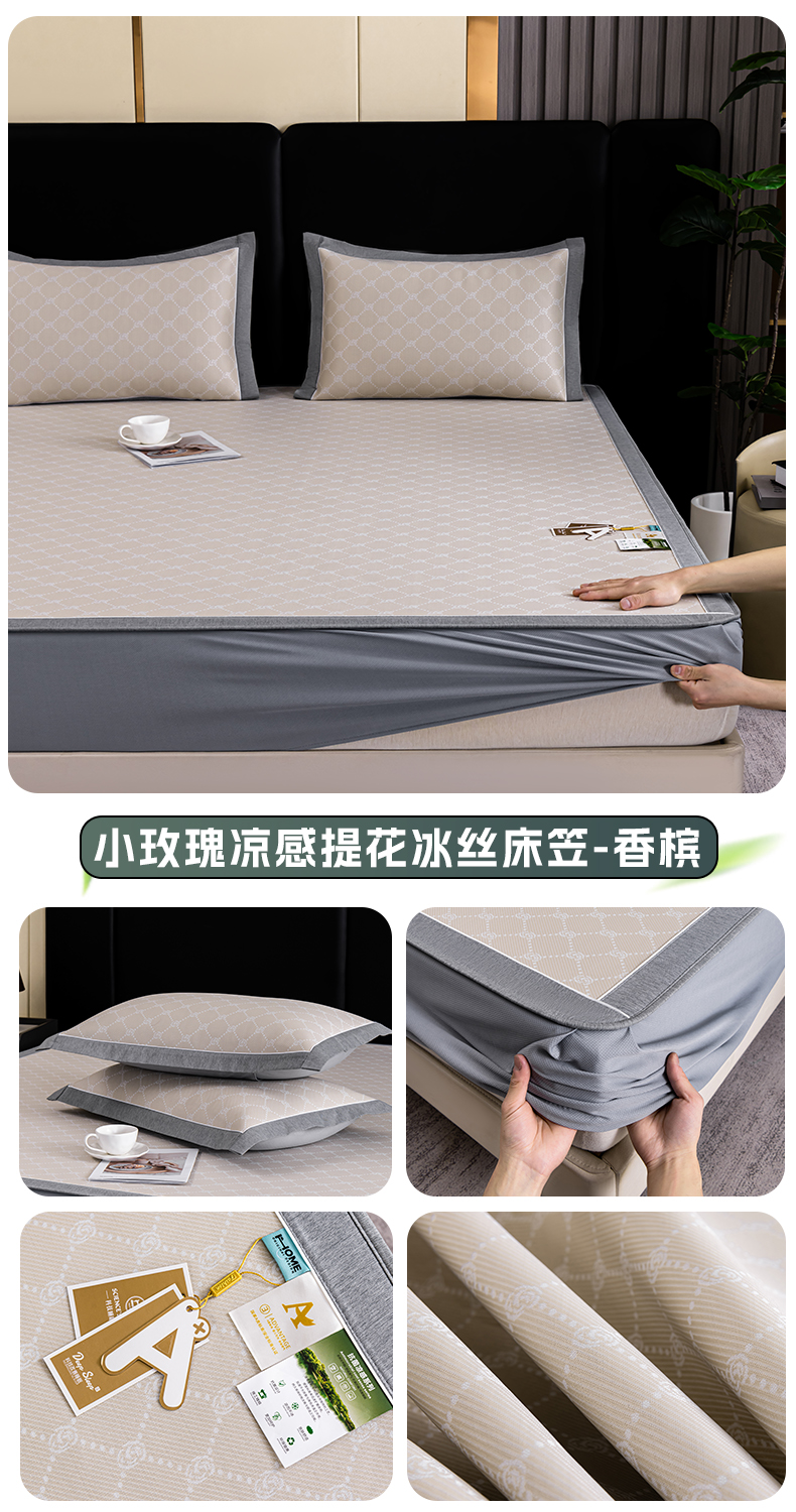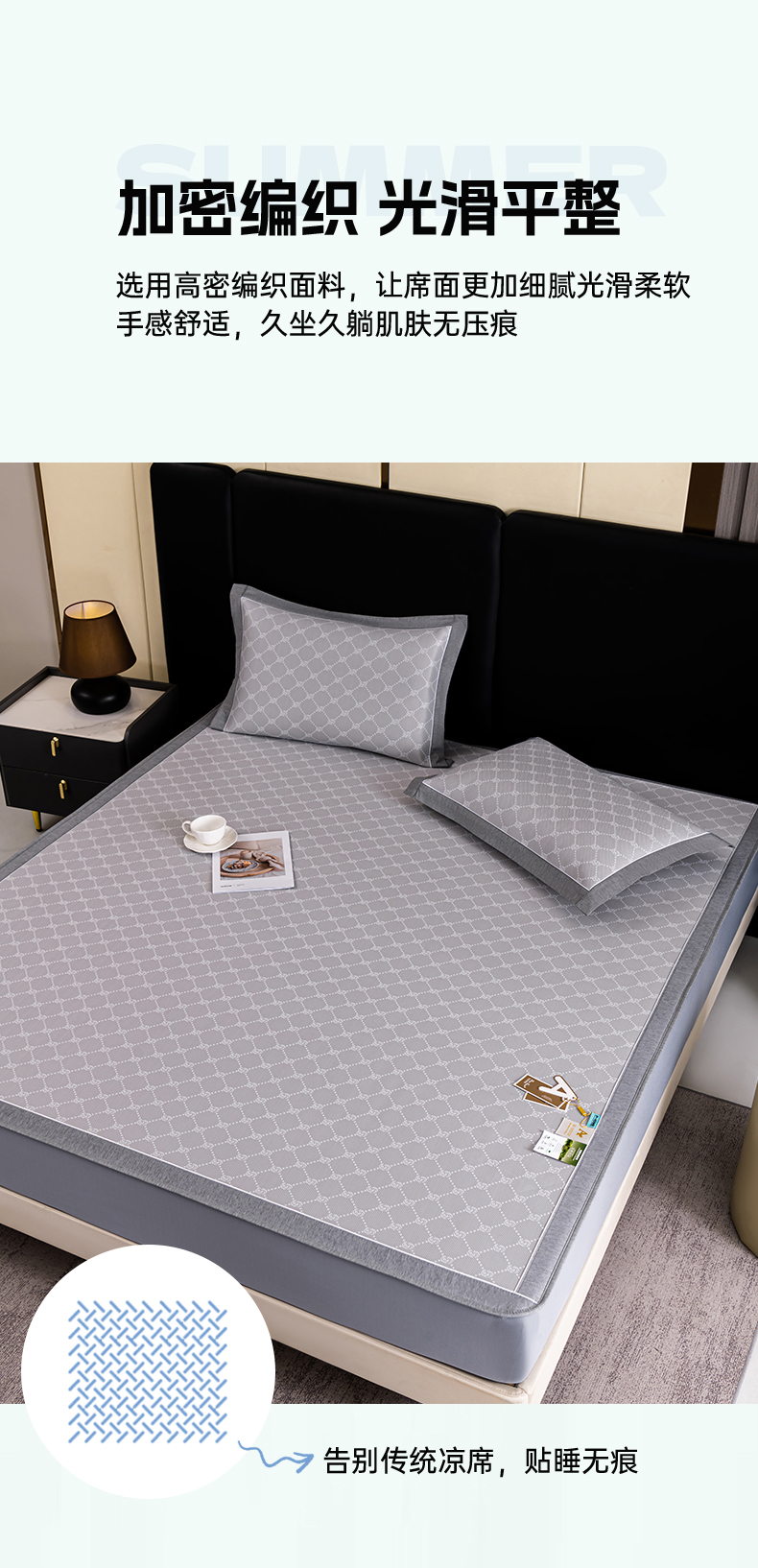 商品名称:小牛席业 2026新款轻奢风提花凉感冰丝席系列(床笠款)小玫瑰凉席藤席冰藤双面席冰丝席竹席凉席空调席草席三件套 灰色