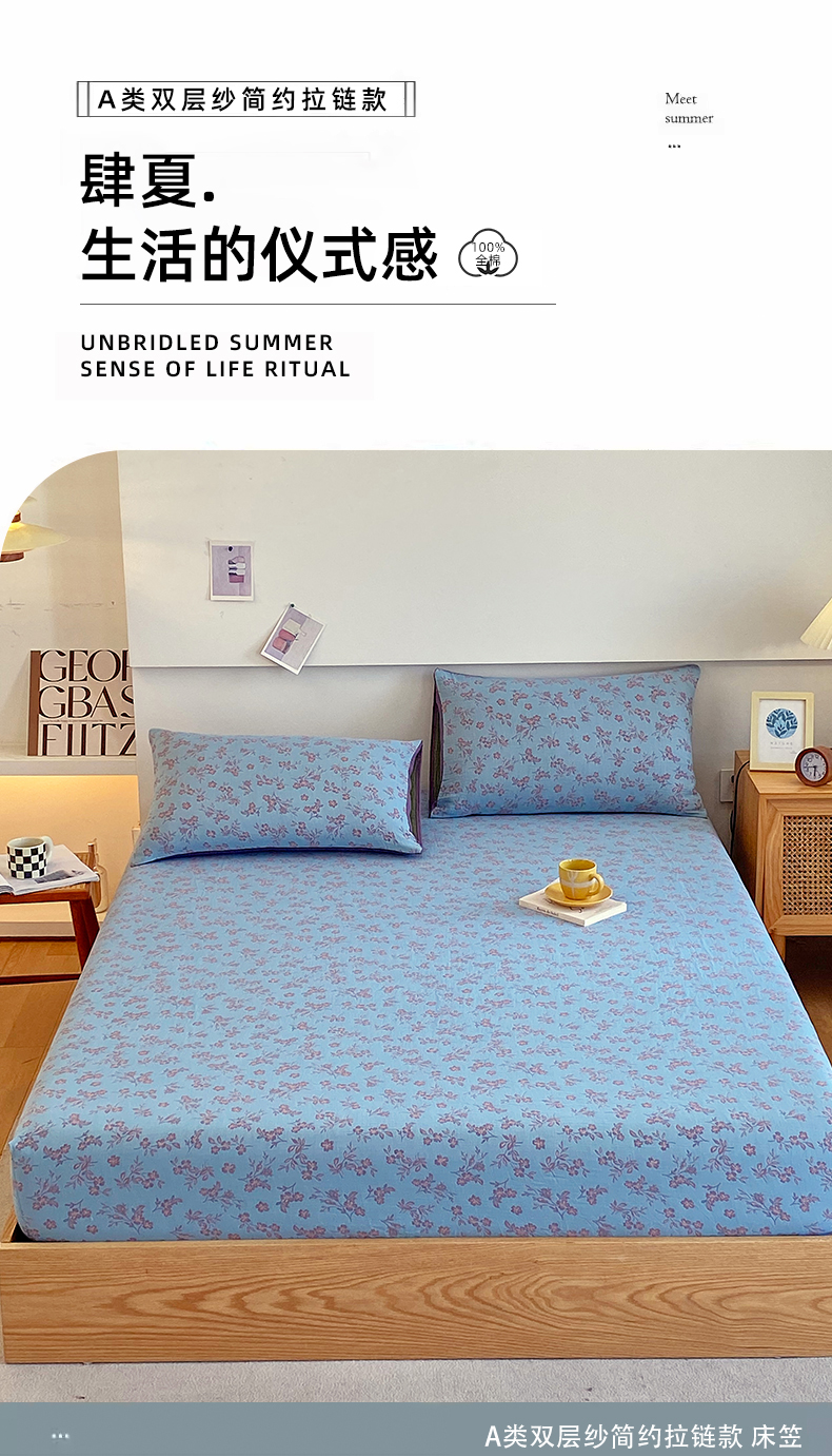 春皖家纺 2026新款全棉纯棉拉链款双层纱床笠单床笠床笠单件 花漾兰