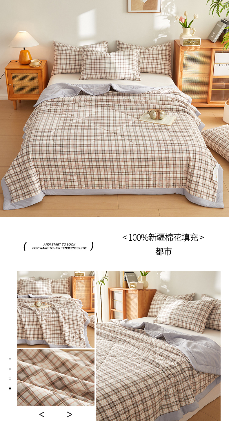 商品名称:海洋家纺 2026新款100%新疆棉花格子夏被亲肤仿棉夏凉被纯手包边空调被薄被子 律动-灰