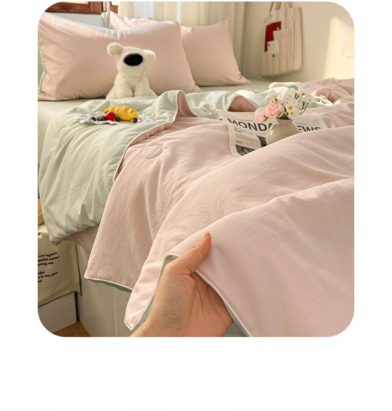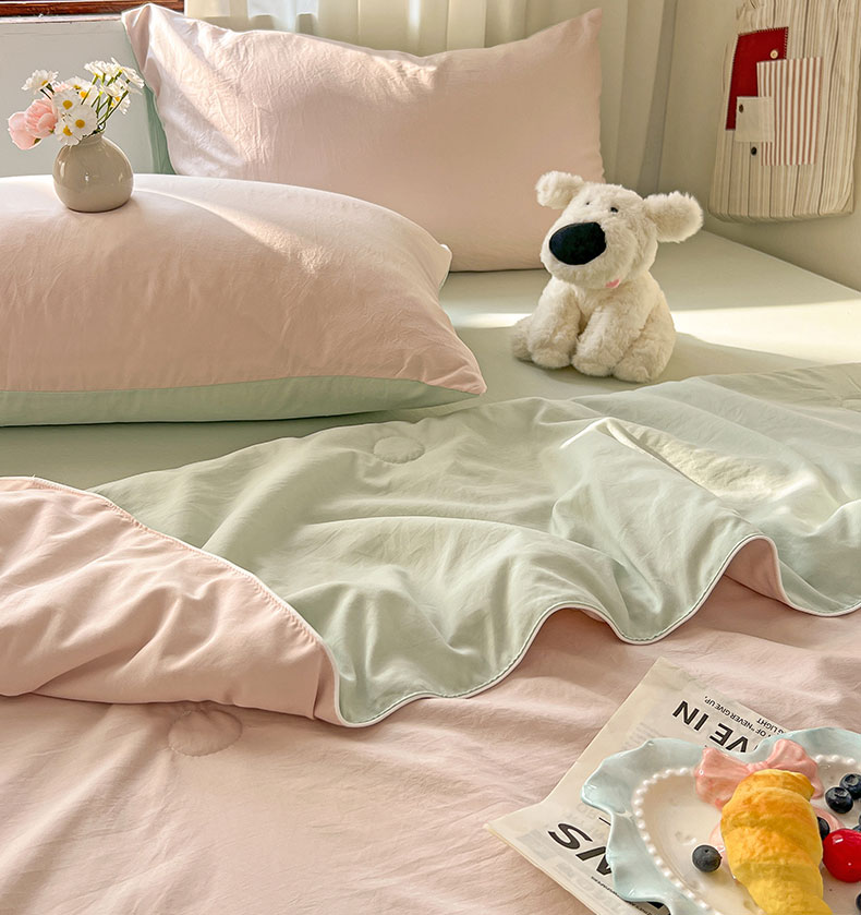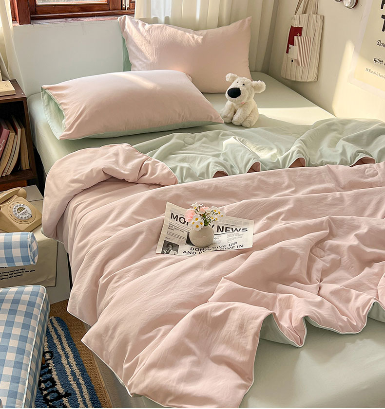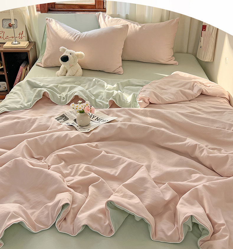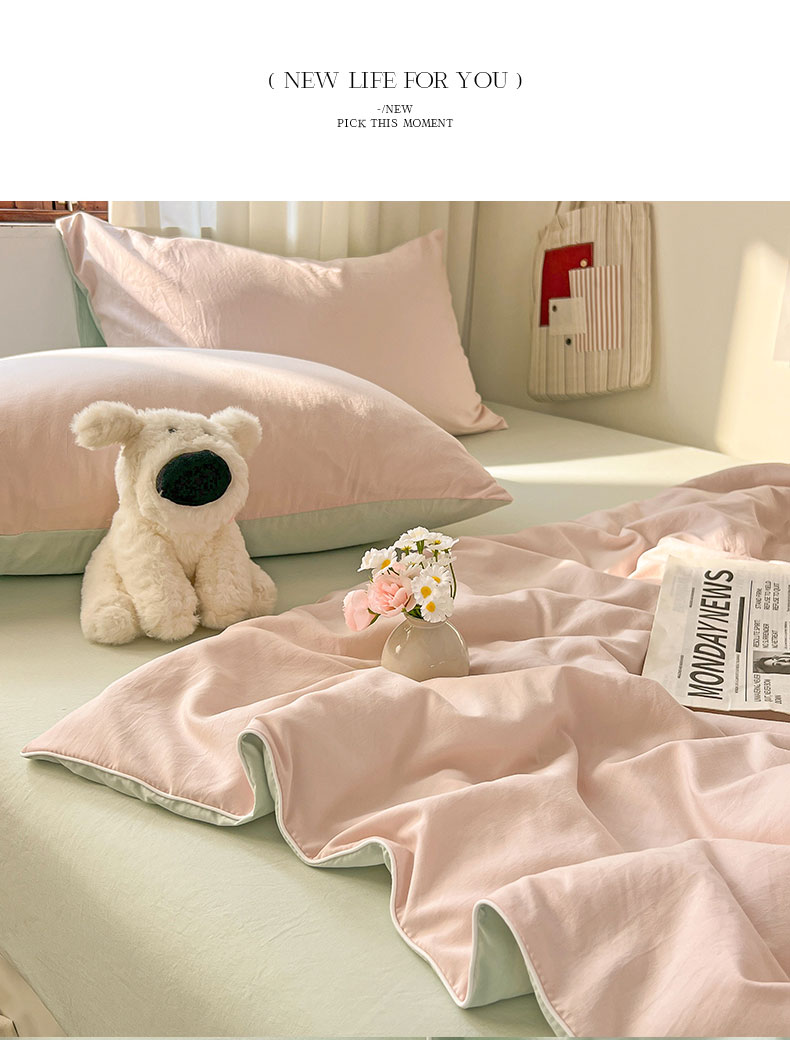当前位置: 91家纺网 > 商品网购 > 床品套件 > 四件套 > 夏被四件套 > 冕悠家纺 2026春夏新款A类高克重超级无敌柔软水洗棉拼色夏被空调被夏凉被四件套 春芜绿+藕粉-夏凉被