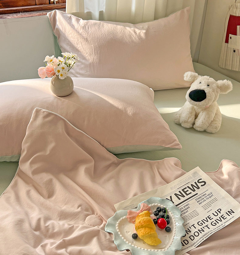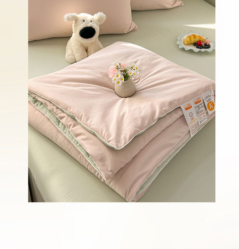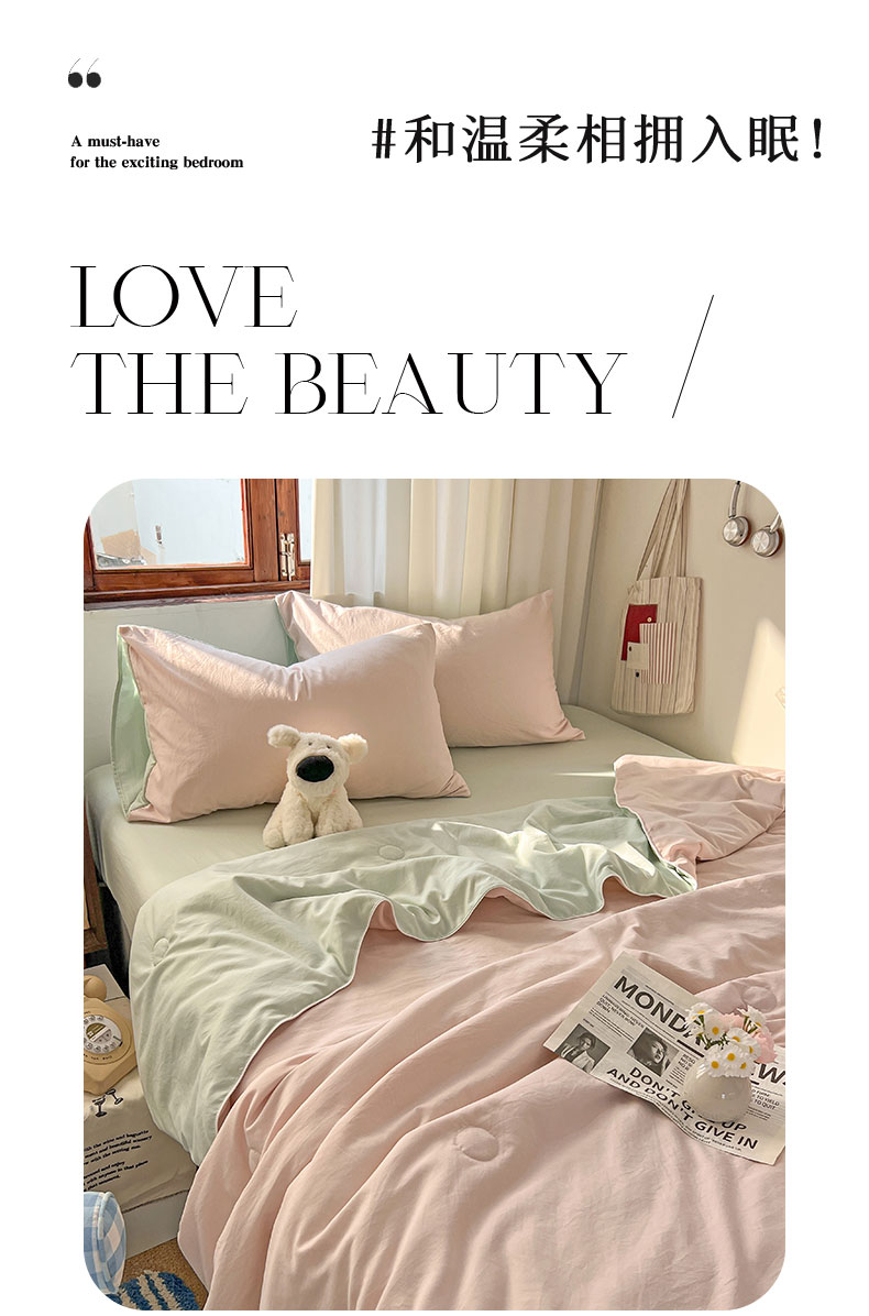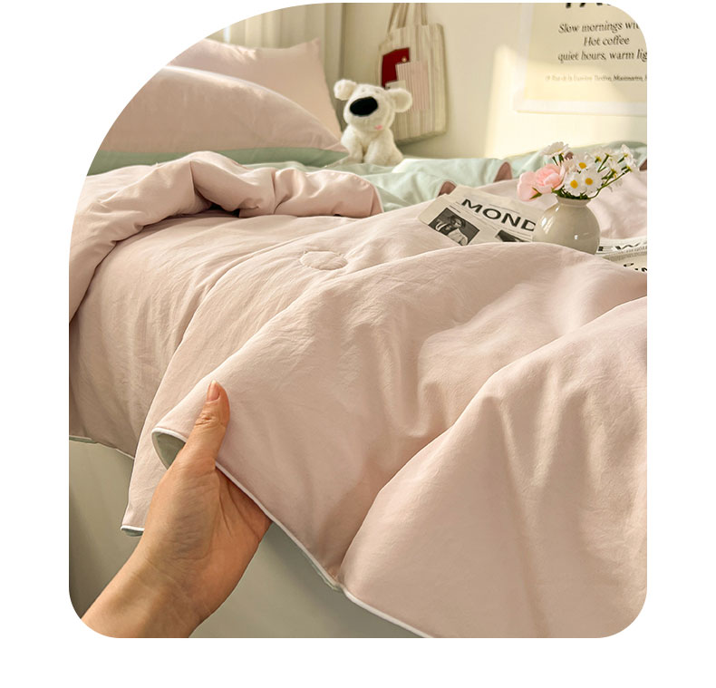 当前位置: 91家纺网 > 商品网购 > 床品套件 > 四件套 > 夏被四件套 > 冕悠家纺 2026春夏新款A类高克重超级无敌柔软水洗棉拼色夏被空调被夏凉被四件套 春芜绿+藕粉-夏凉被