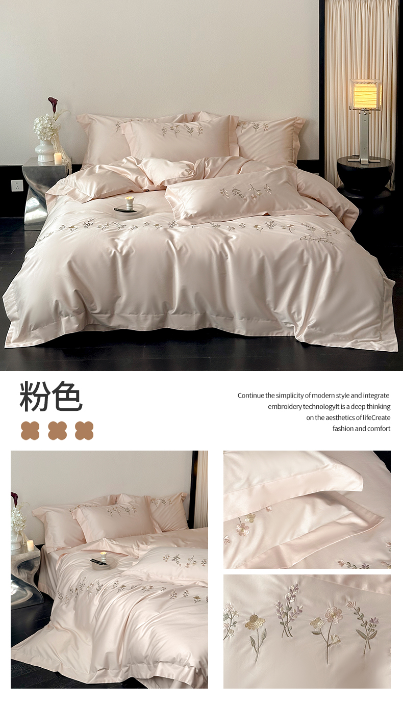 商品名称:泽西家纺+V17798841158发大图 2026新品刺绣50s双股全棉长绒棉纯棉宽边四件套-花有约 花有约-粉色
