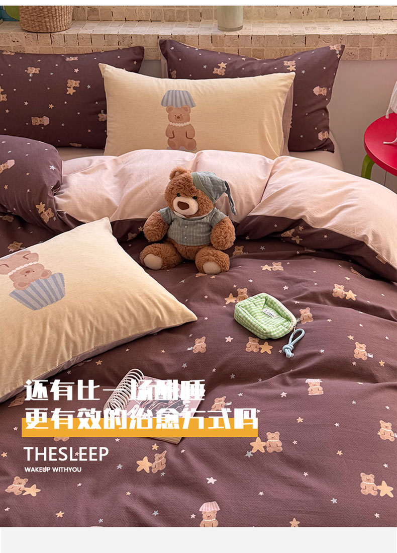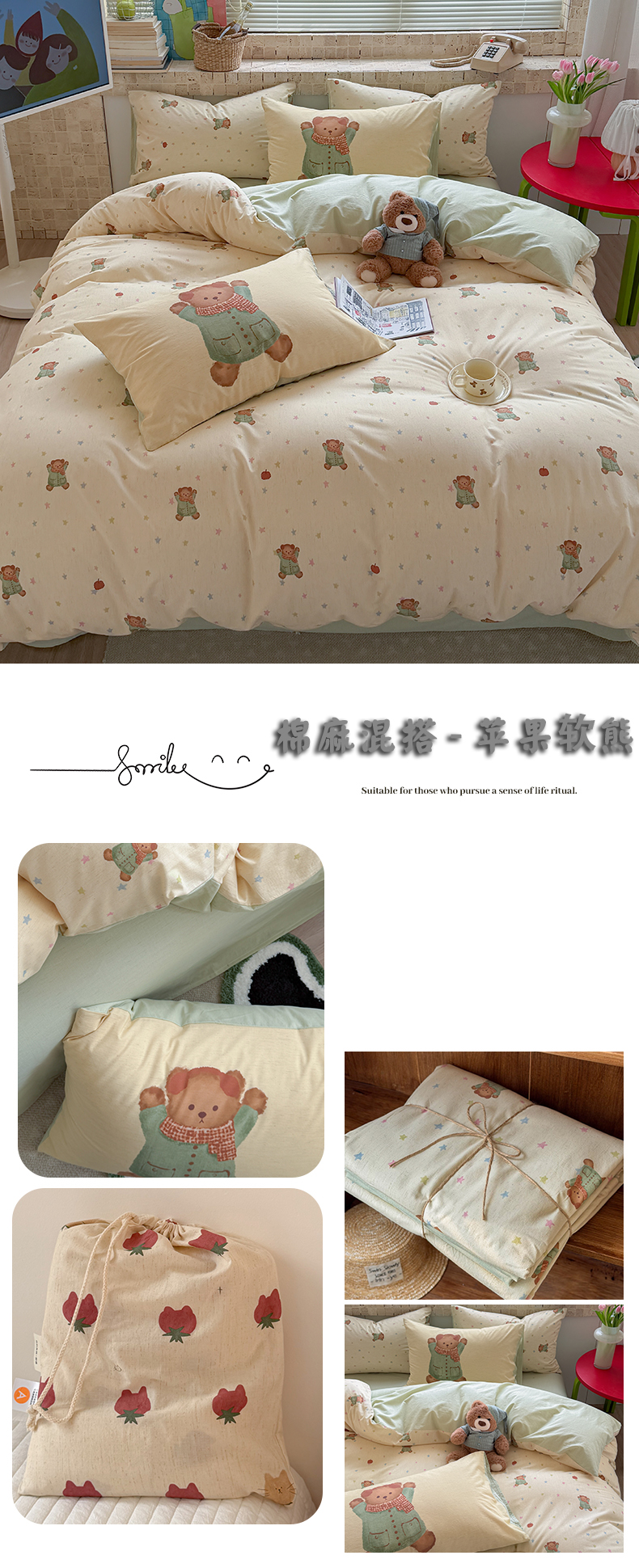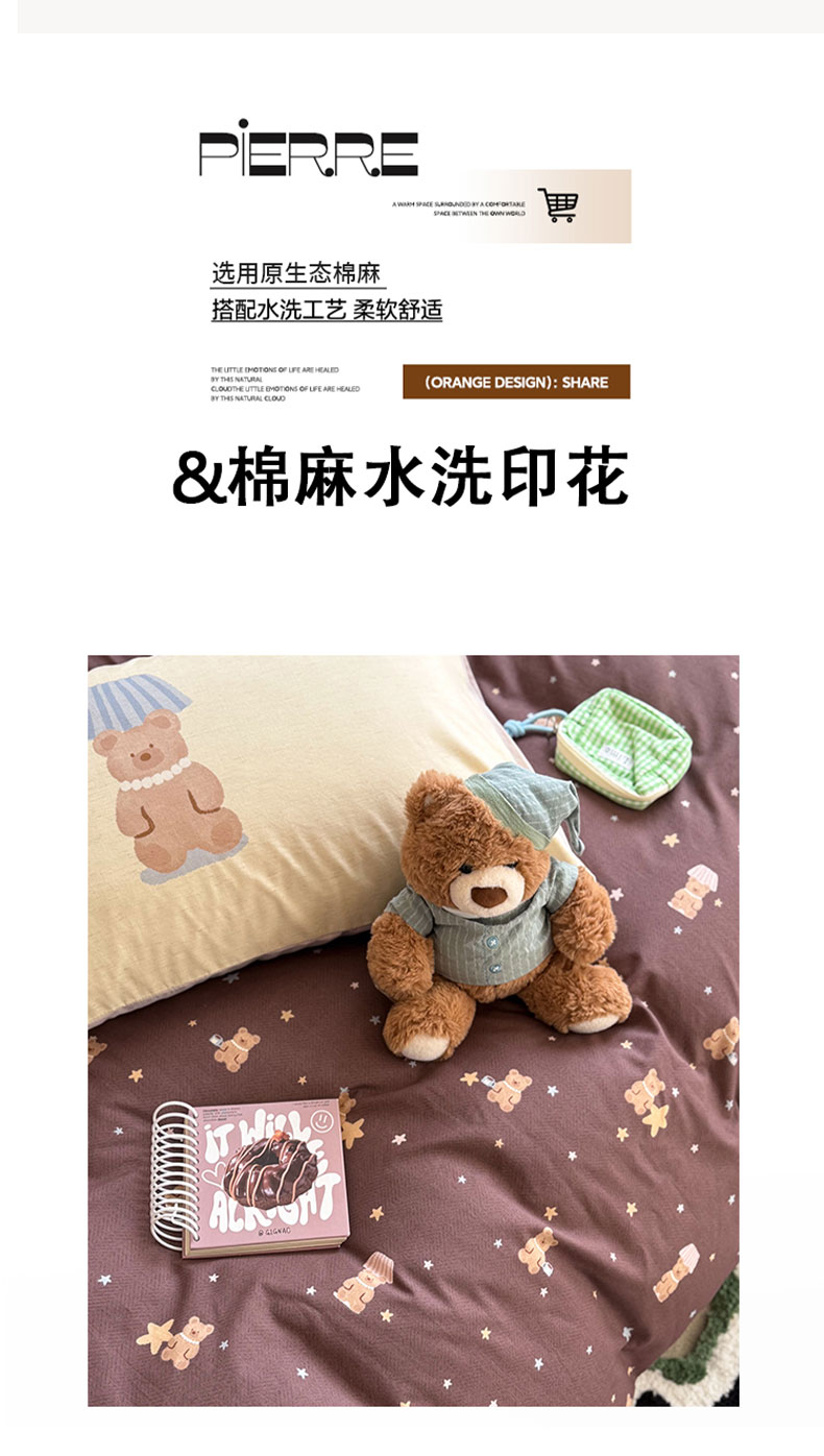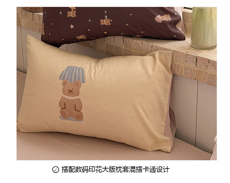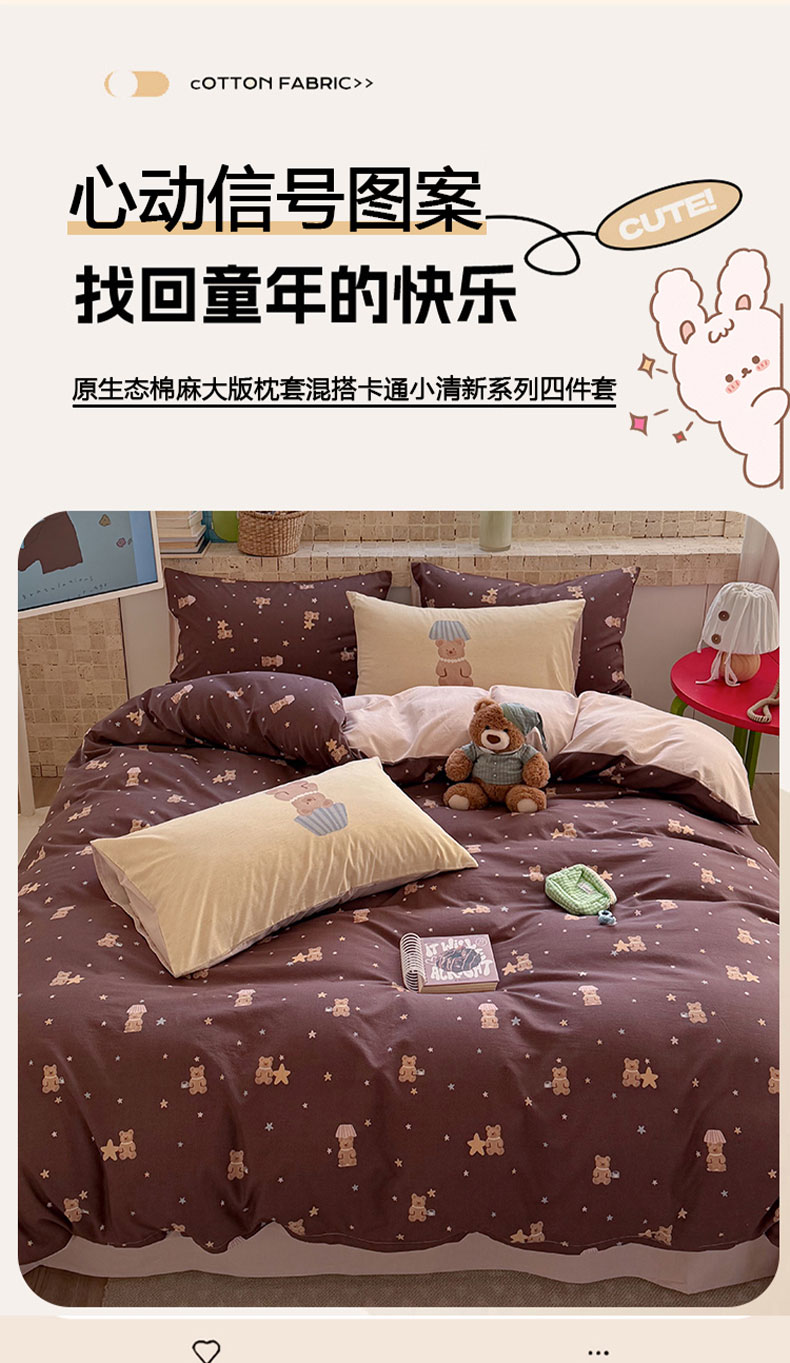 当前位置: 91家纺网 > 商品网购 > 床品套件 > 四件套 > 其它四件套 > 桃子家居 2026A类纯棉水洗原生态棉麻数码印花大版枕套混搭卡通小清新韩国小布袋系列四件套 棉麻混搭-焦糖星星熊