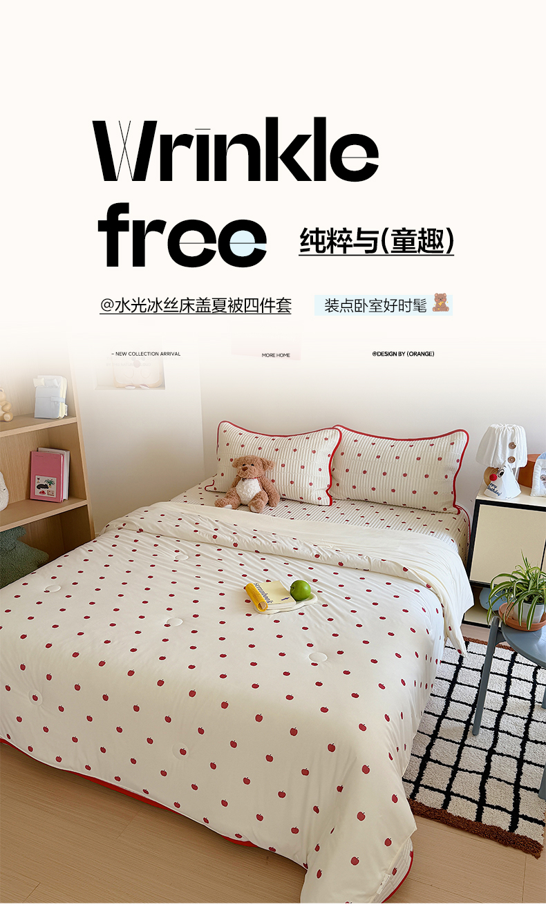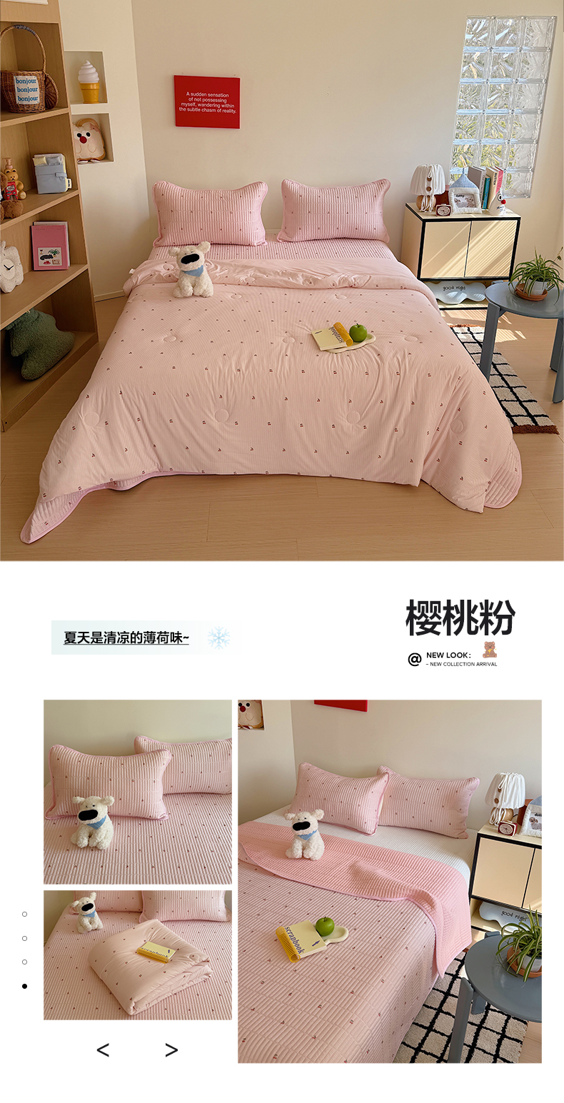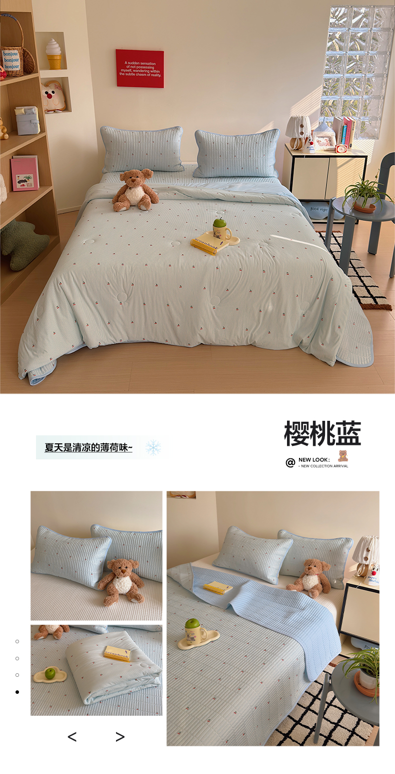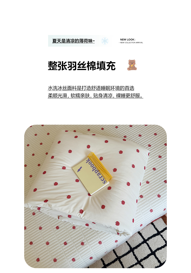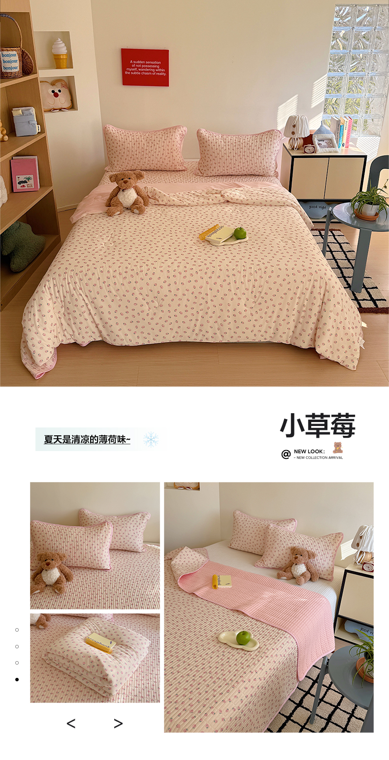 (总)美乐迪家纺 2026春夏新款水光冰丝床盖夏被夏凉被空调被四件套,组合图仅供展示不可下单,彩色小花,粉色费尔岛,粉色小熊,苹果,小草莓,小碎花蓝,星星猫咪,樱桃粉,樱桃蓝