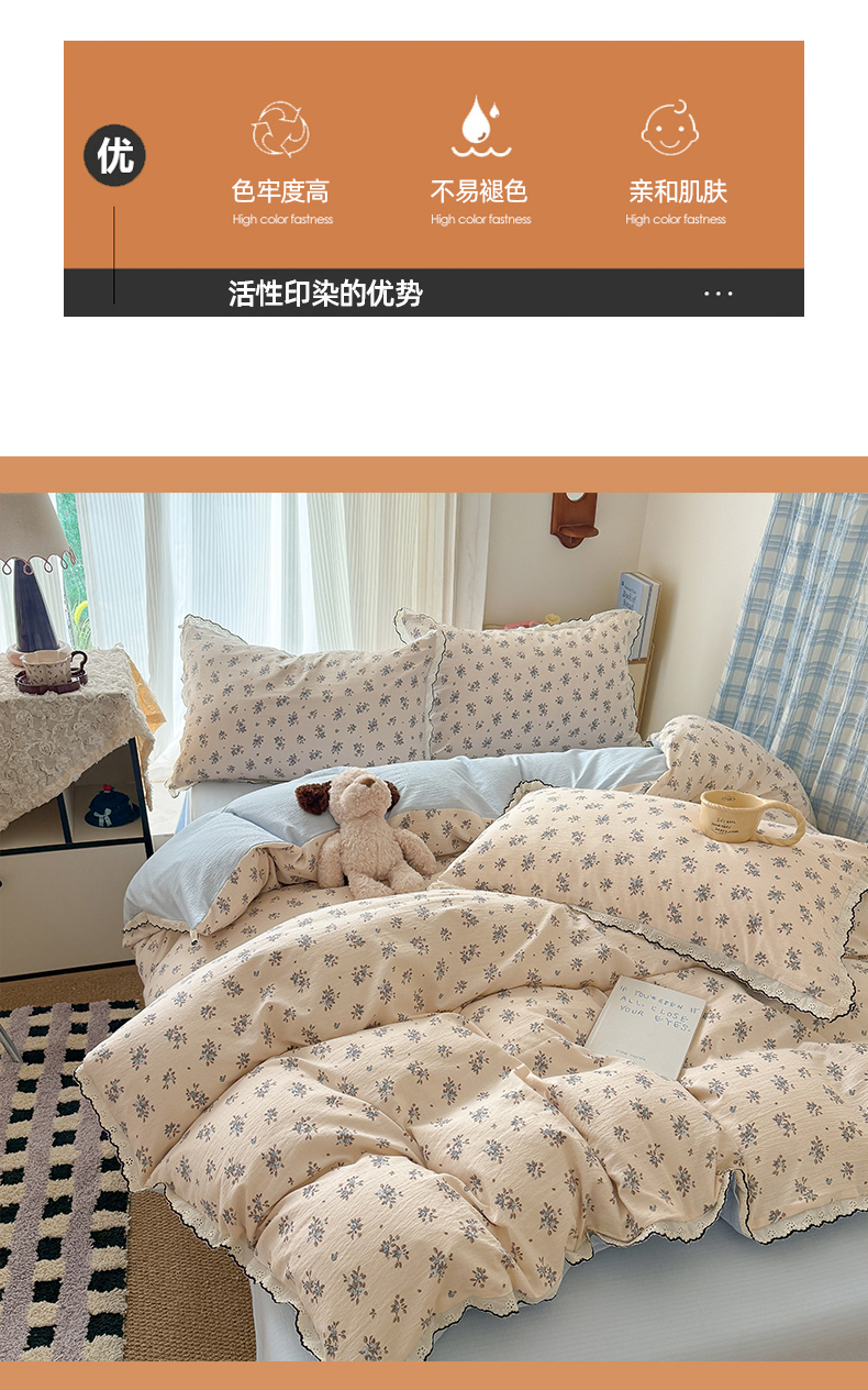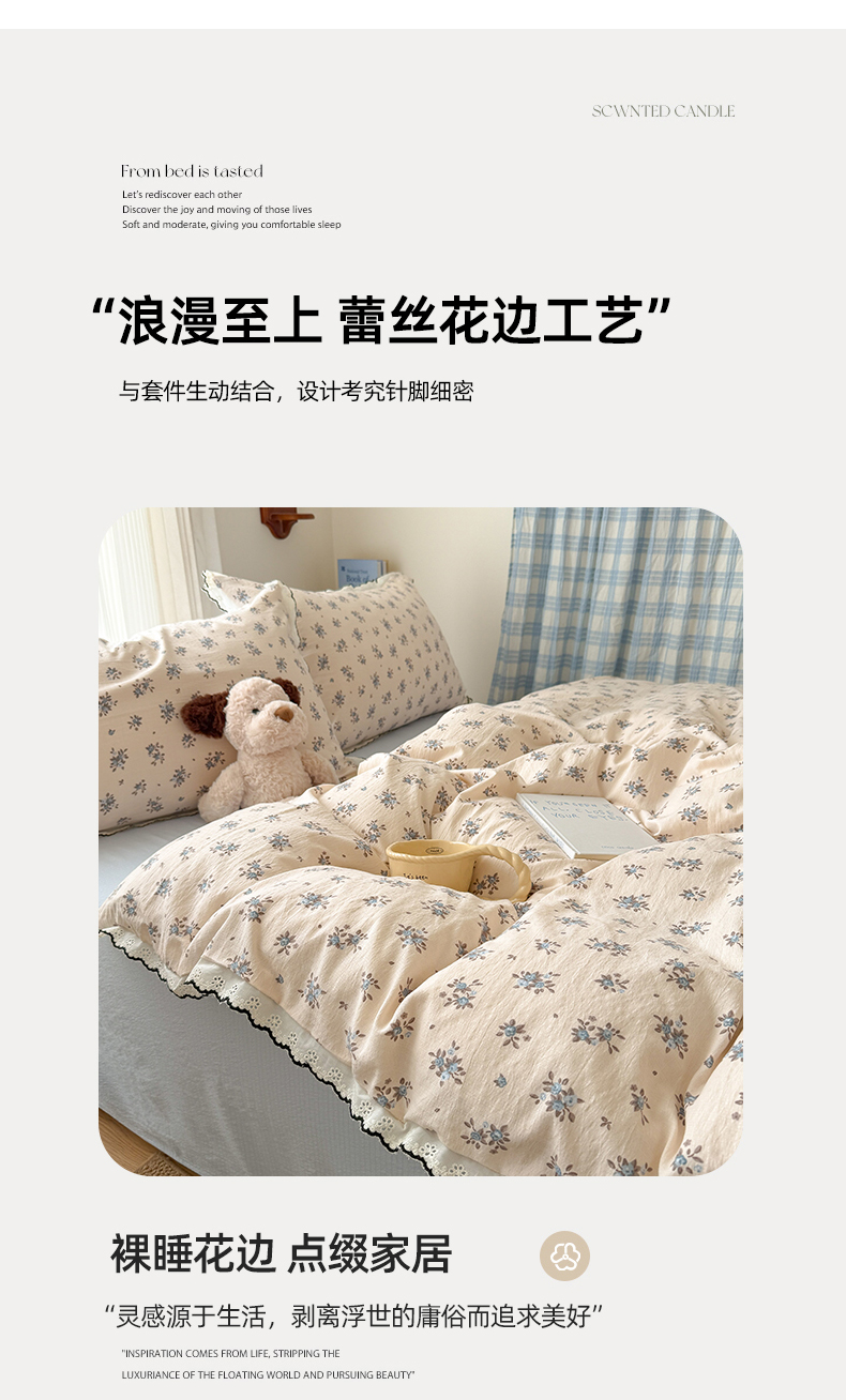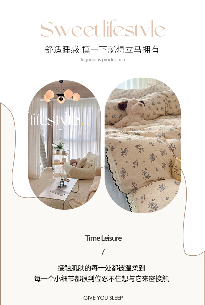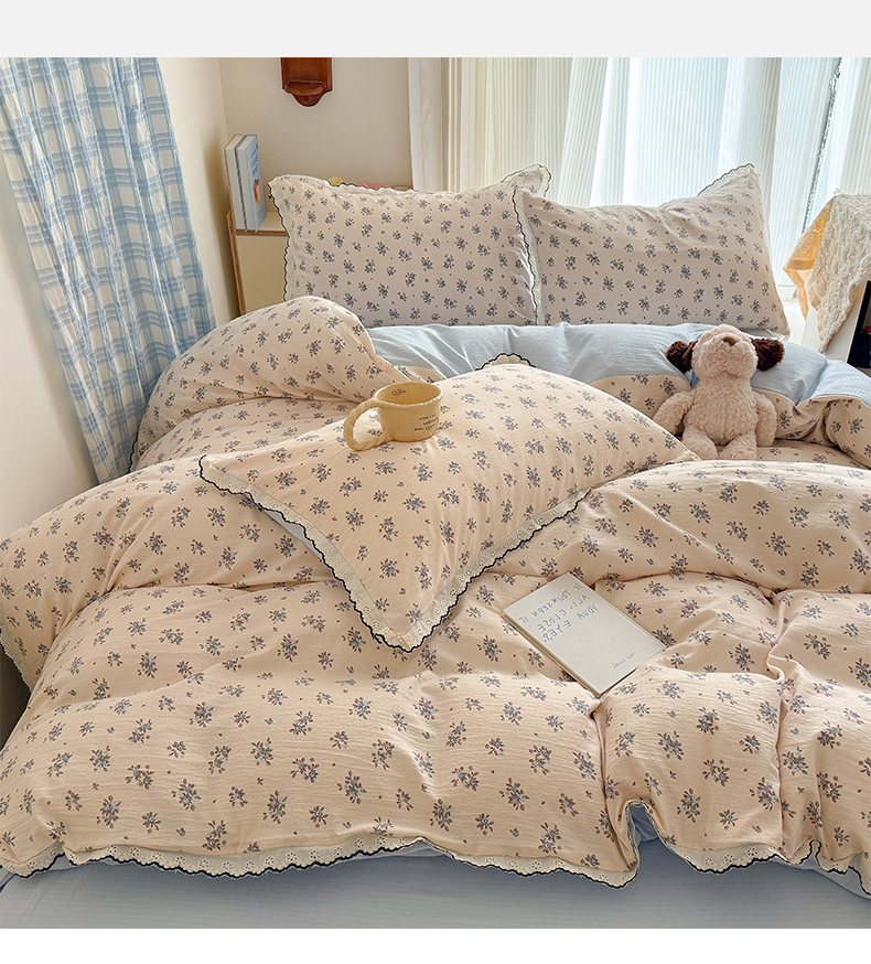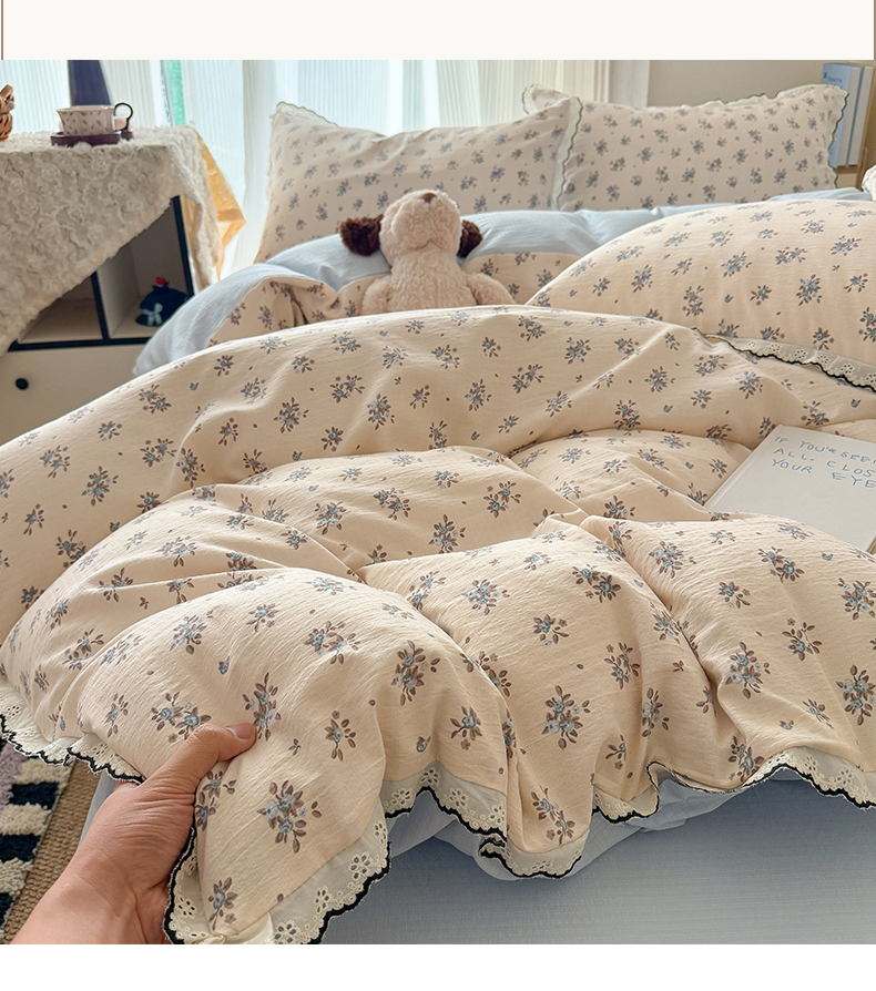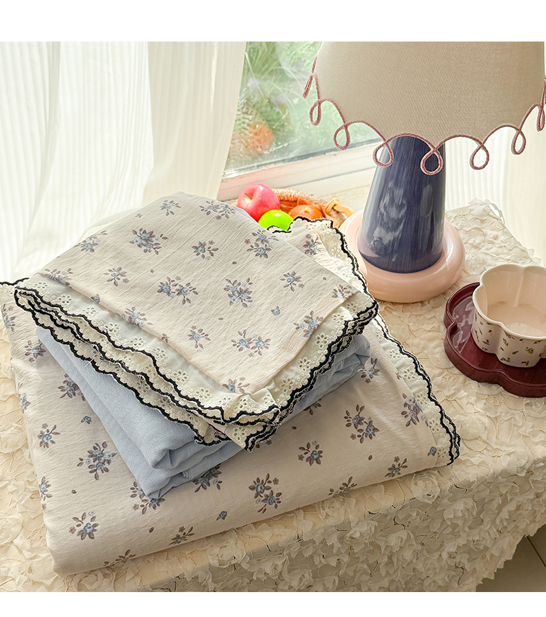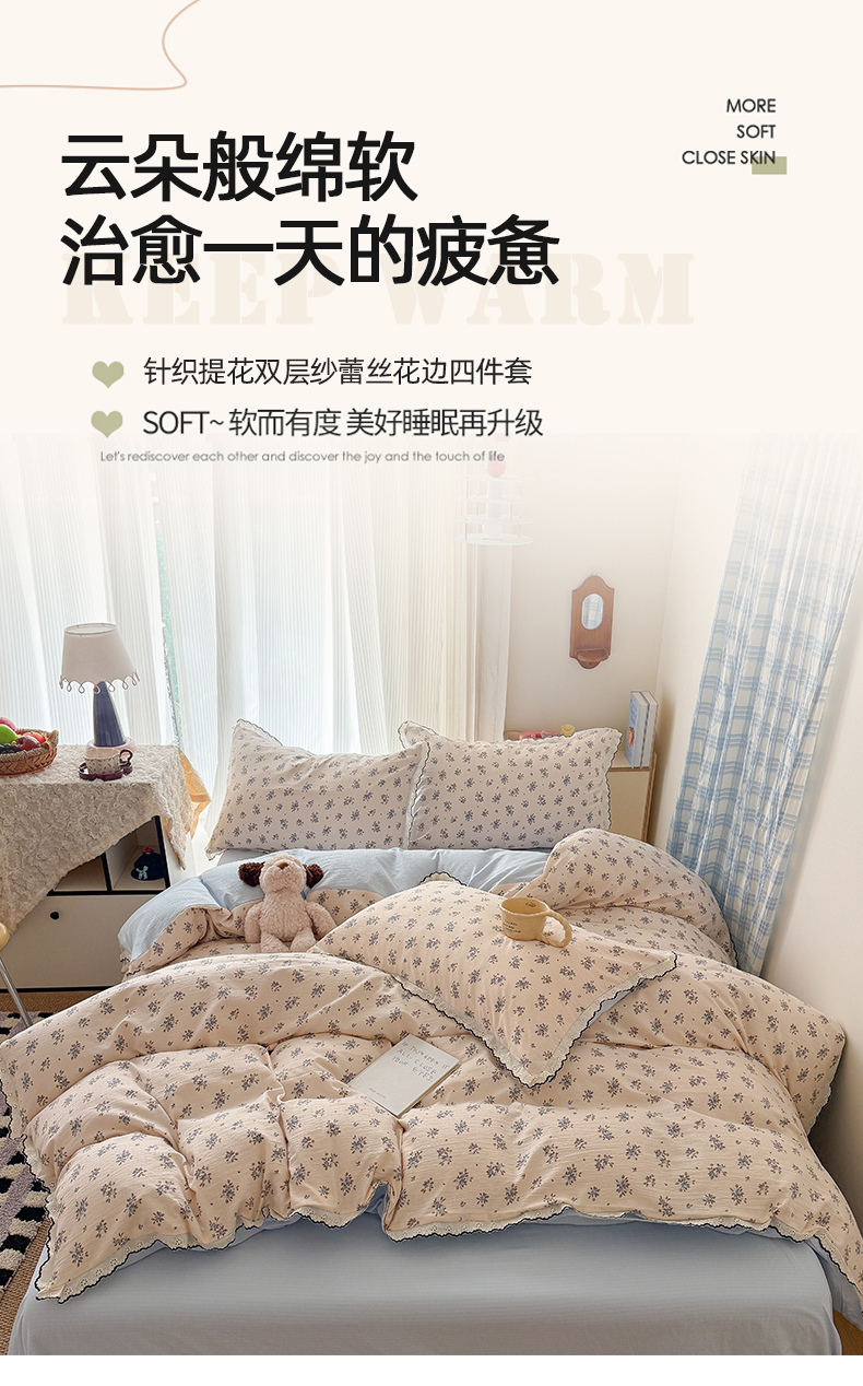 (总)温眠家纺 2026新款针织提花双层纱全棉蕾丝花边四件套,繁花,花田紫,蓝萱,墨蓝,奶油芝士,苹果星人,秋之恋,软萌可可,藤蔓,甜心猫咪,甜心木马,乌梅子酱,夏之物语,薰衣草,阳光花絮,枝芽