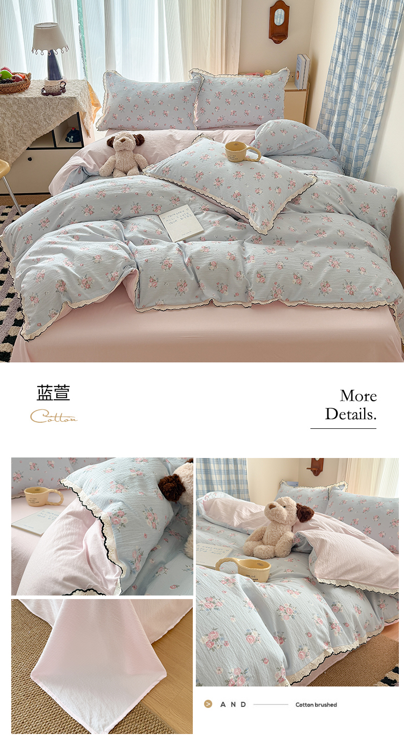 商品名称:温眠家纺 2026新款针织提花双层纱全棉蕾丝花边四件套 墨蓝