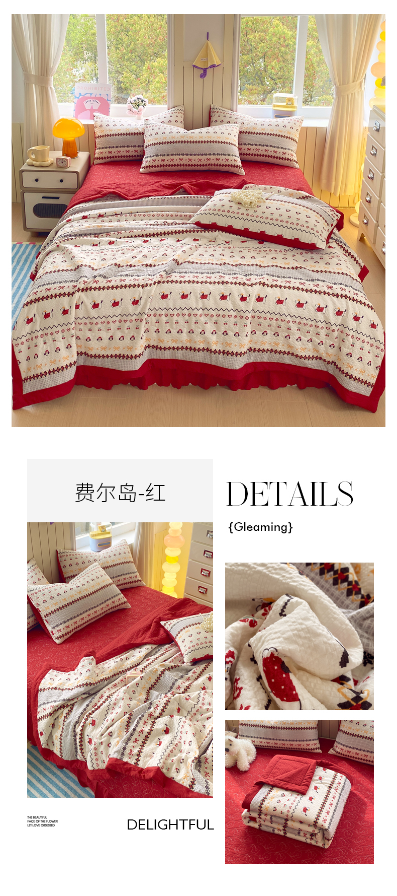 (总)莱米家纺 2026新款云感泡泡纱双层纱床盖四件套,海底星星,费尔岛红,费尔岛咖,费尔岛紫,卡其波点,绿花枝叶,绿樱桃,兔兔之家,星星人,紫色爱心,棕蝴蝶结