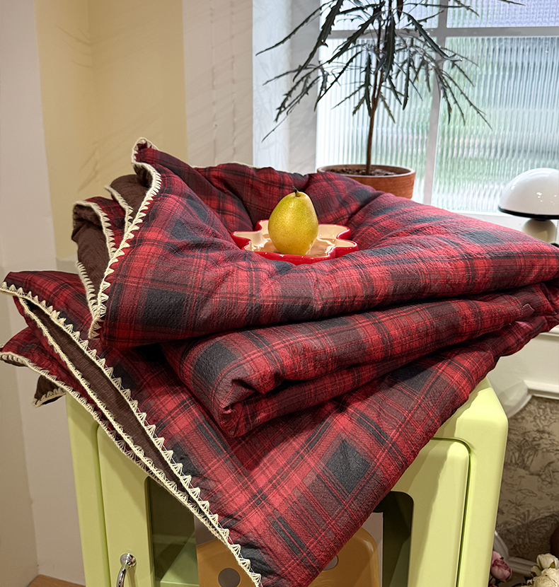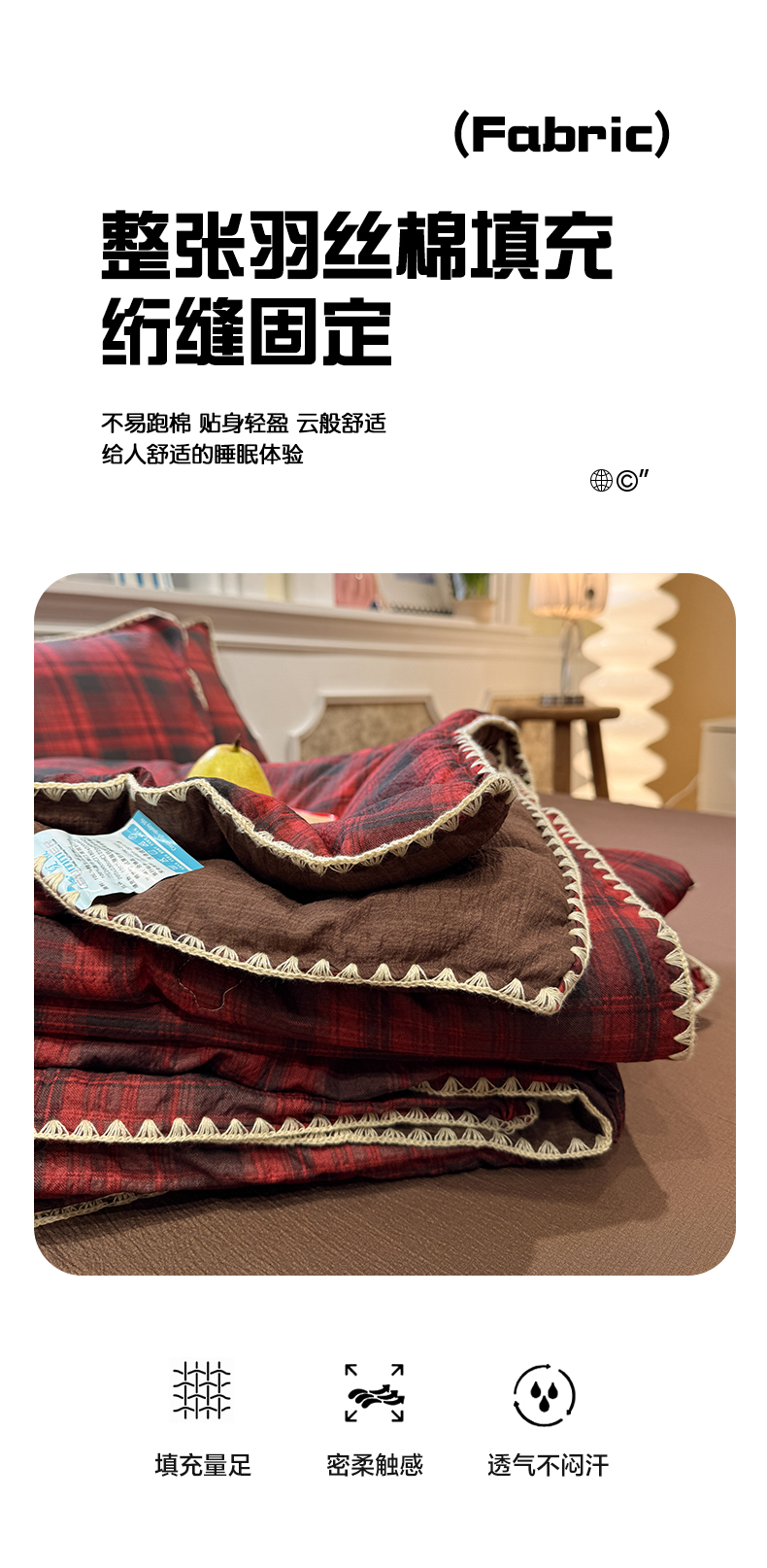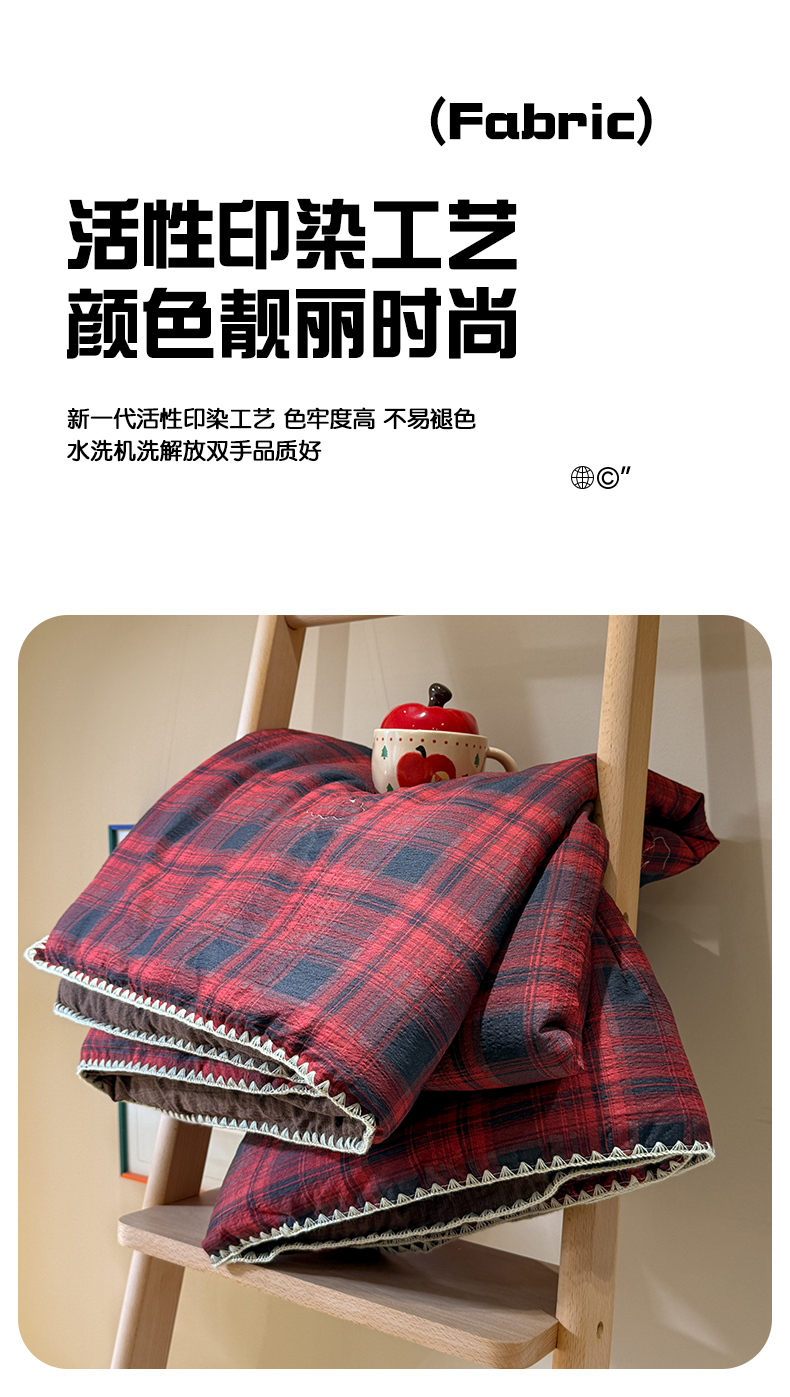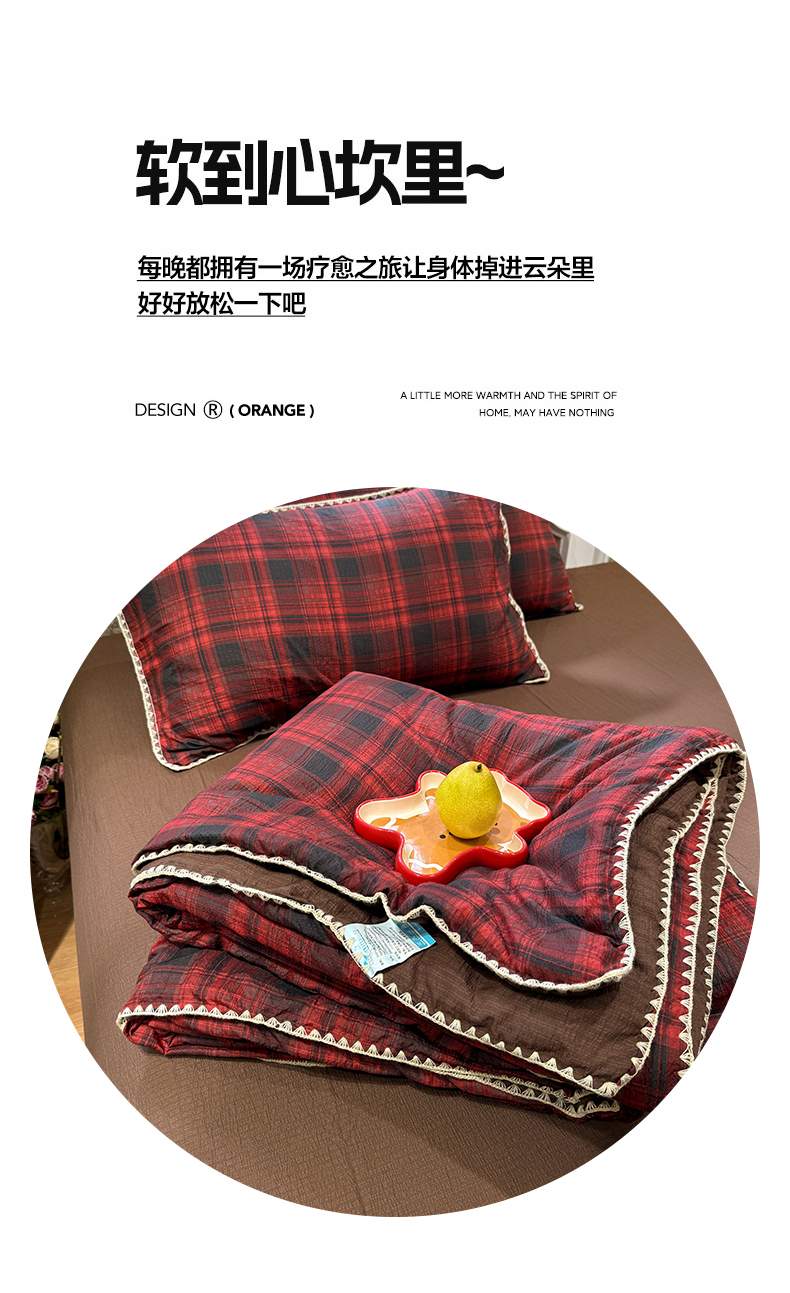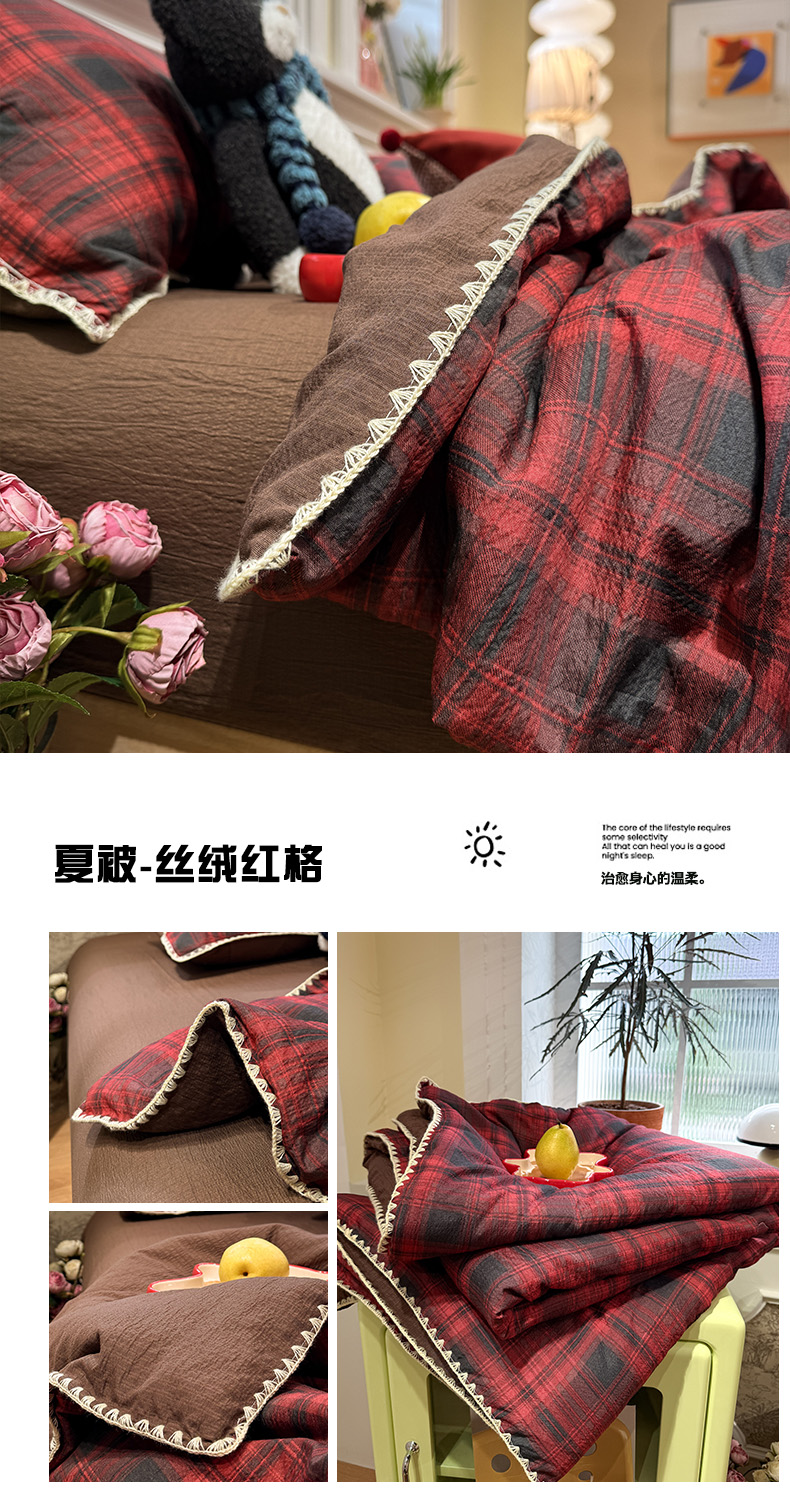 水墨江南 2026新款云感皱皱纱贝壳边夏被四件套 夏被-丝绒红格