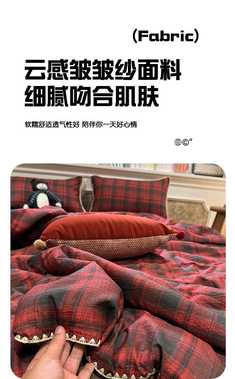 商品名称:水墨江南 2026新款云感皱皱纱贝壳边夏被四件套 夏被-丝绒红格