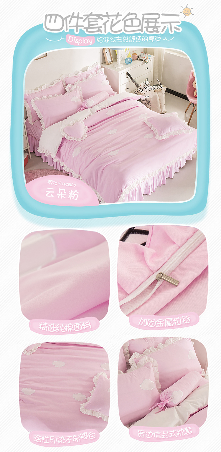 商品名称:欧冠家纺 水洗磨毛卡通床裙款四件套 云朵粉