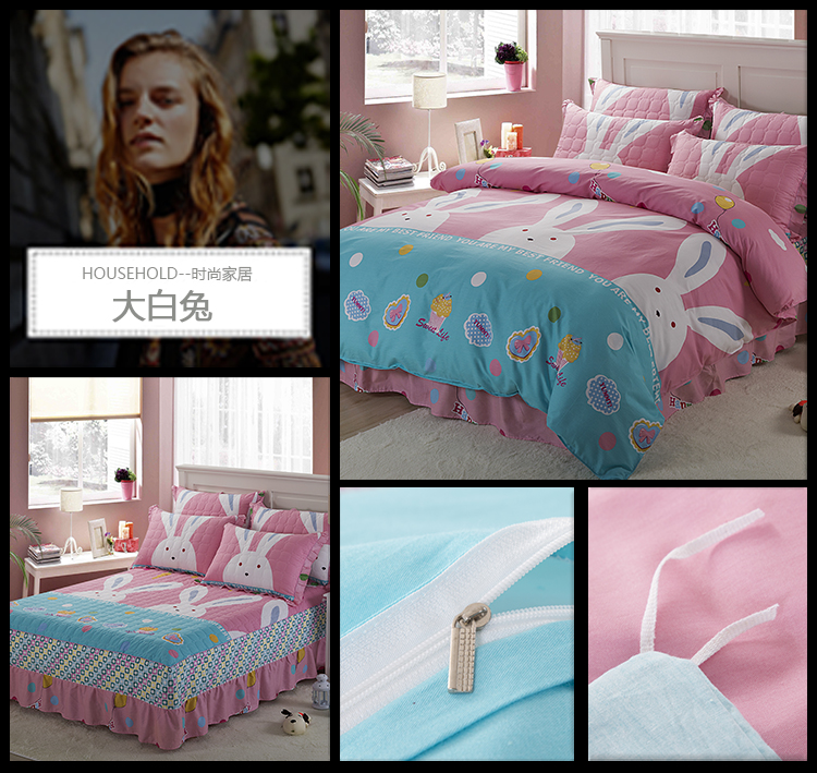 商品名称:八十八号家纺 全棉单被套夹棉床群四件套大白兔粉
